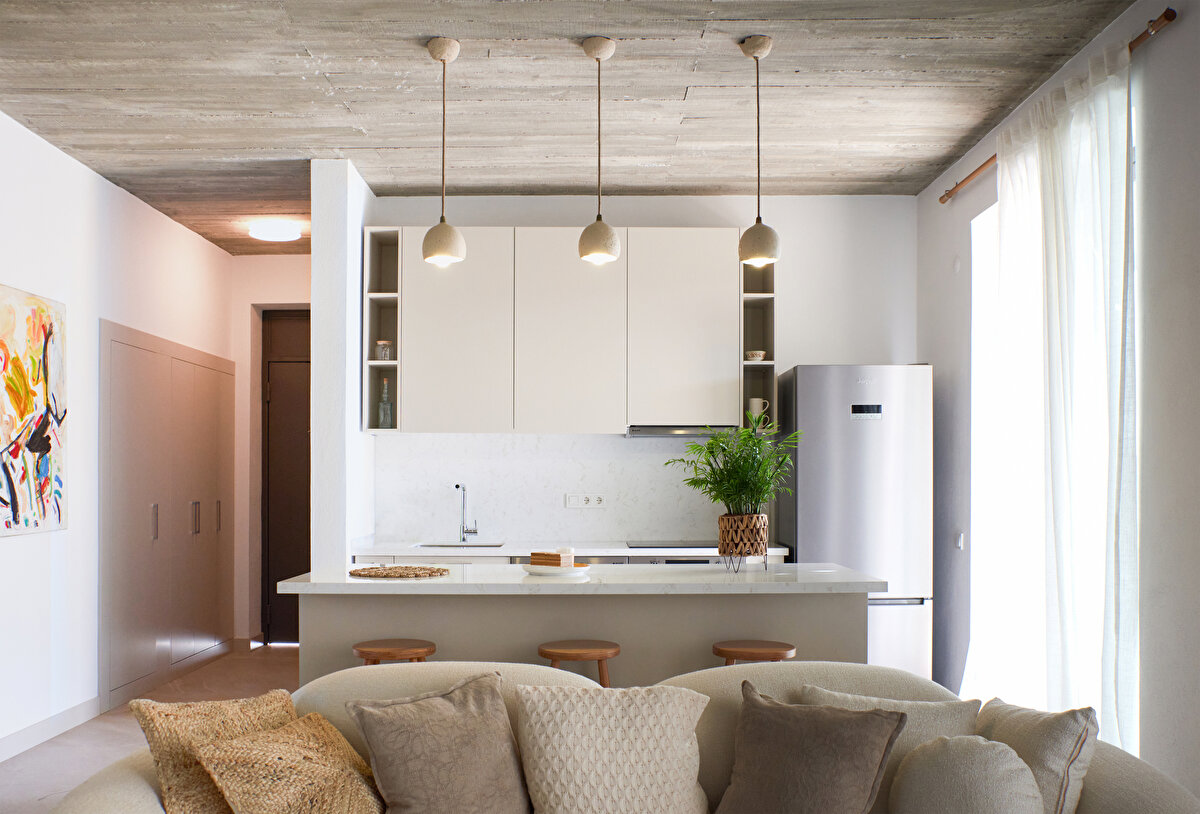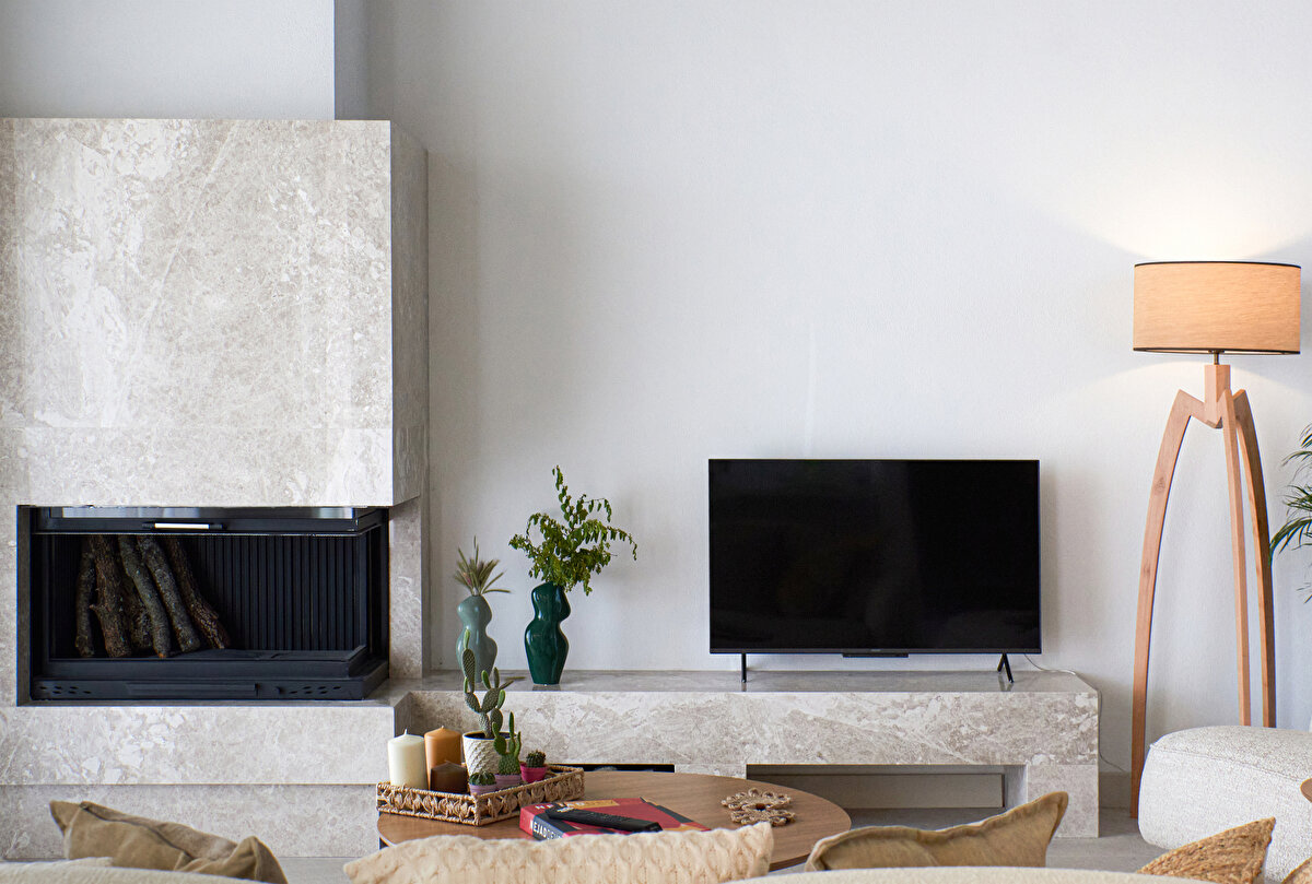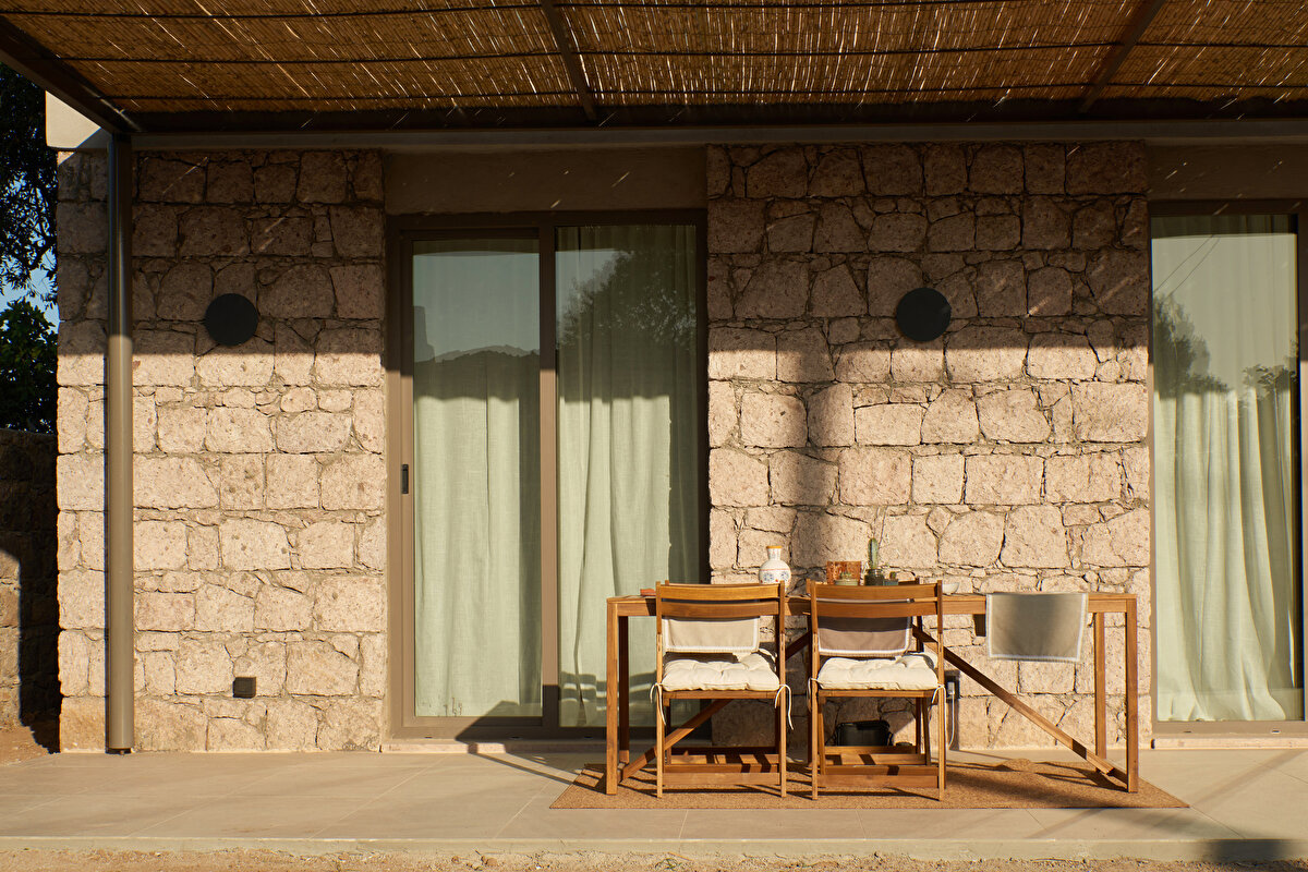 Evler doğal taş cepheleri ve yöreye özgü mimari unsurların sadeleştirilerek yeniden yorumlanmasıyla elde edilmiş detaylarıyla öne çıkıyor. Doğal taş cephe yüzeylerini bölen sıvanmış kat silmeleri arasında boydan boya açılmış pencereler, iç ve dış mekan arasında kontrollü bir ilişki kurulmasını sağlıyor. Evlerin önüne eklenen ve ön cephe boyunca devam eden çelik taşıyıcılı, saz üst örtülü pergolalar, dış mekan kullanımını kolaylaştırıyor. Bahçede yer alan köy tipi fırın ve açık mutfak tezgahıysa, bu kullanımı daha da zenginleştiriyor. Cephelerdeki sadelik, doğallık ve hamlık hissi, merdiven ve şöminede kullanılan mermer, zemindeki hareli seramik ve ahşap kalıp izli brüt beton tavan sayesinde iç mekanda da sürdürülüyor.
