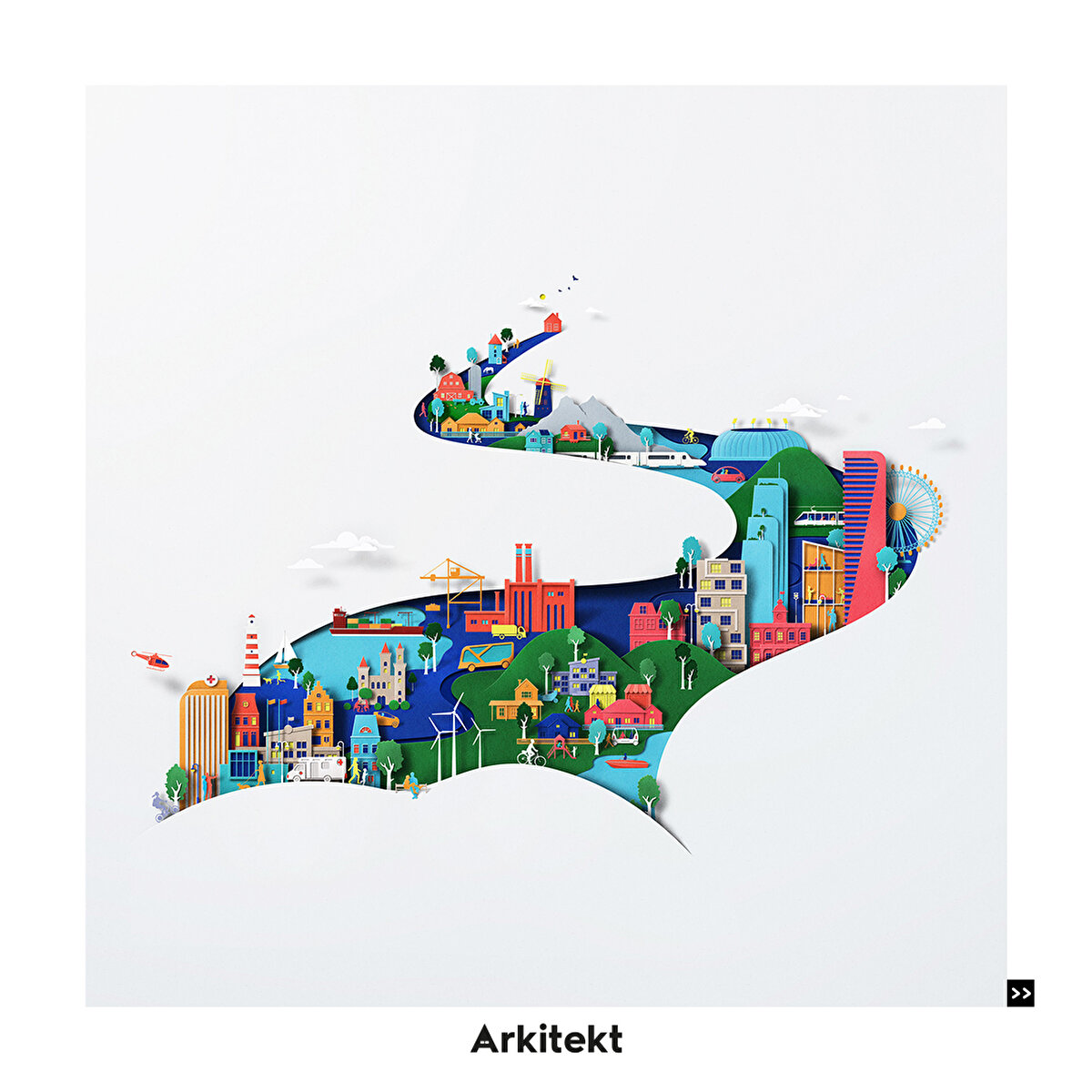 @o_eiko, renkli kartonları ve kağıtları kullanarak kent imgeleri oluşturuyor.