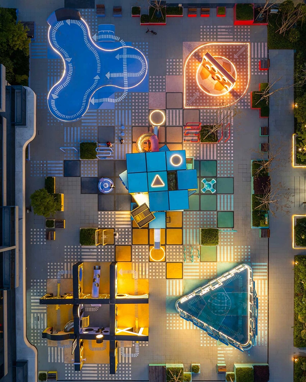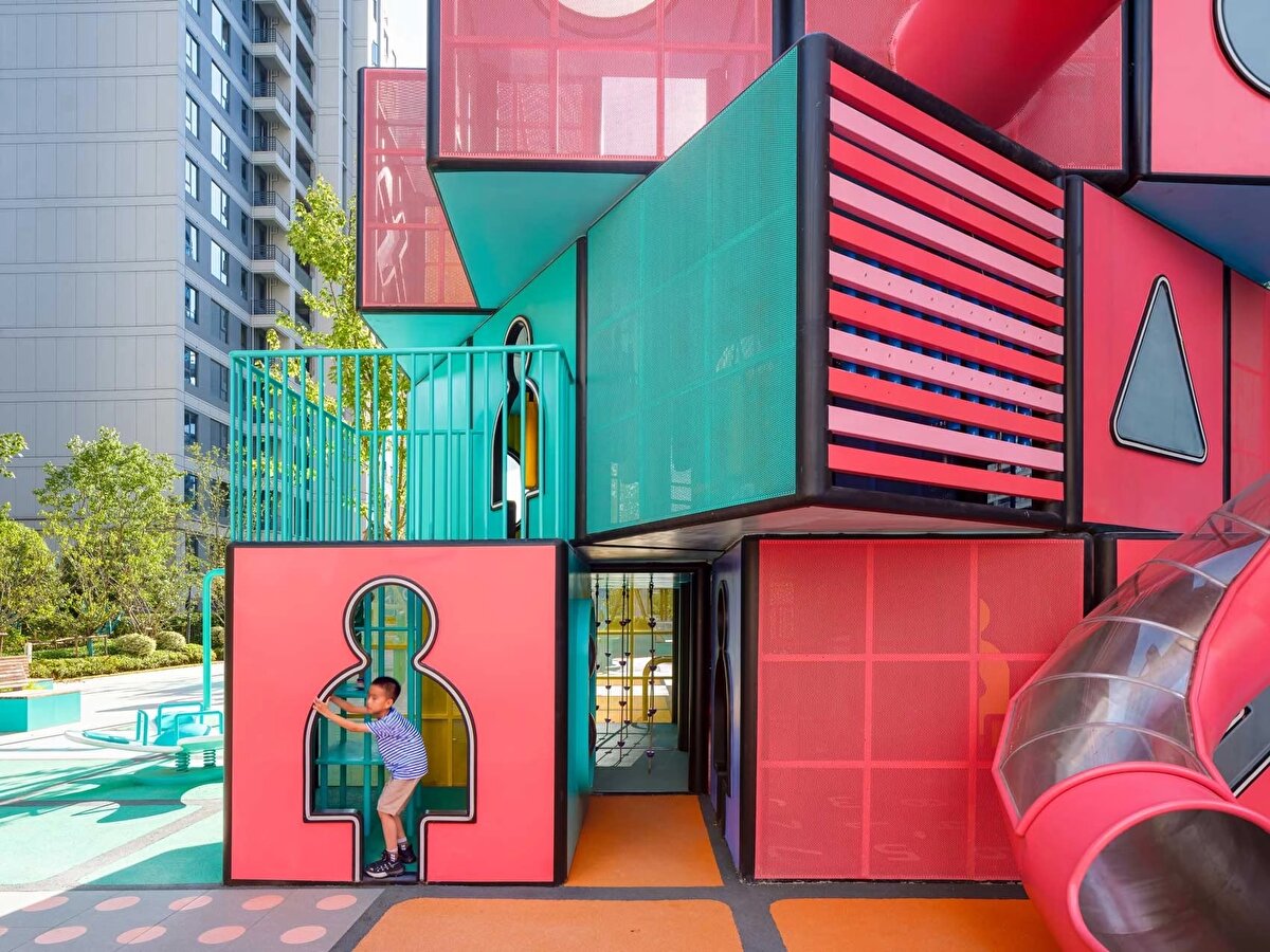 Rubix Square, designed by 100 Architects @100architects in Fuzhou, China, is being constructed on a 1,400 m² site. The project aims to provide a hyper-stimulating public space that encourages people of all ages to engage with the surrounding residential area. At its centre stands a three-storey, open-plan play structure inspired by the Rubik's Cube.
