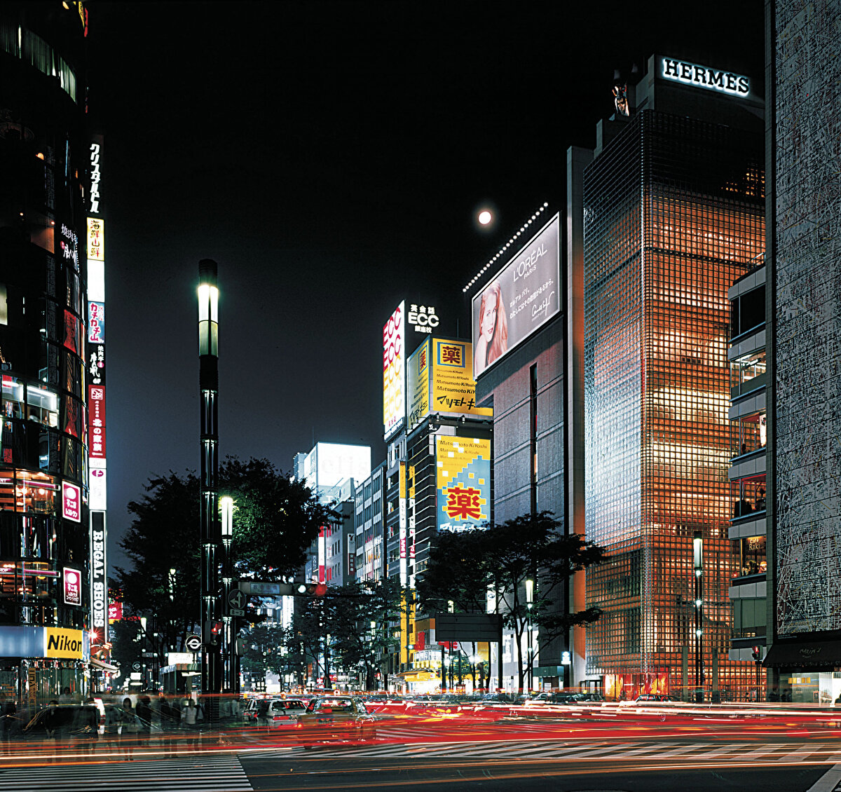 Tokyo'nun Ginza semtinde, Renzo Piano Building Workshop tarafından 1998-2001 yılları arasında tasarlanan Maison Hermès, markanın Asya'daki merkez yapısı olarak konumlanıyor. Yapı, 13 kat boyunca alışveriş alanları, atölyeler, sergi ve ofis mekânlarını bir arada barındırıyor; çatı katında ise Fransız bahçesi düzenlemesine yer veriliyor. Cephe, 45x45 cm boyutlarında özel üretim cam bloklardan oluşuyor ve içerideki sakin atmosfer ile dış mekândaki yoğun kent yaşantısı arasında geçirgen bir sınır oluşturuyor.