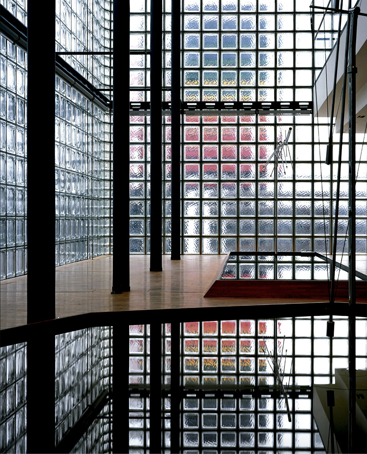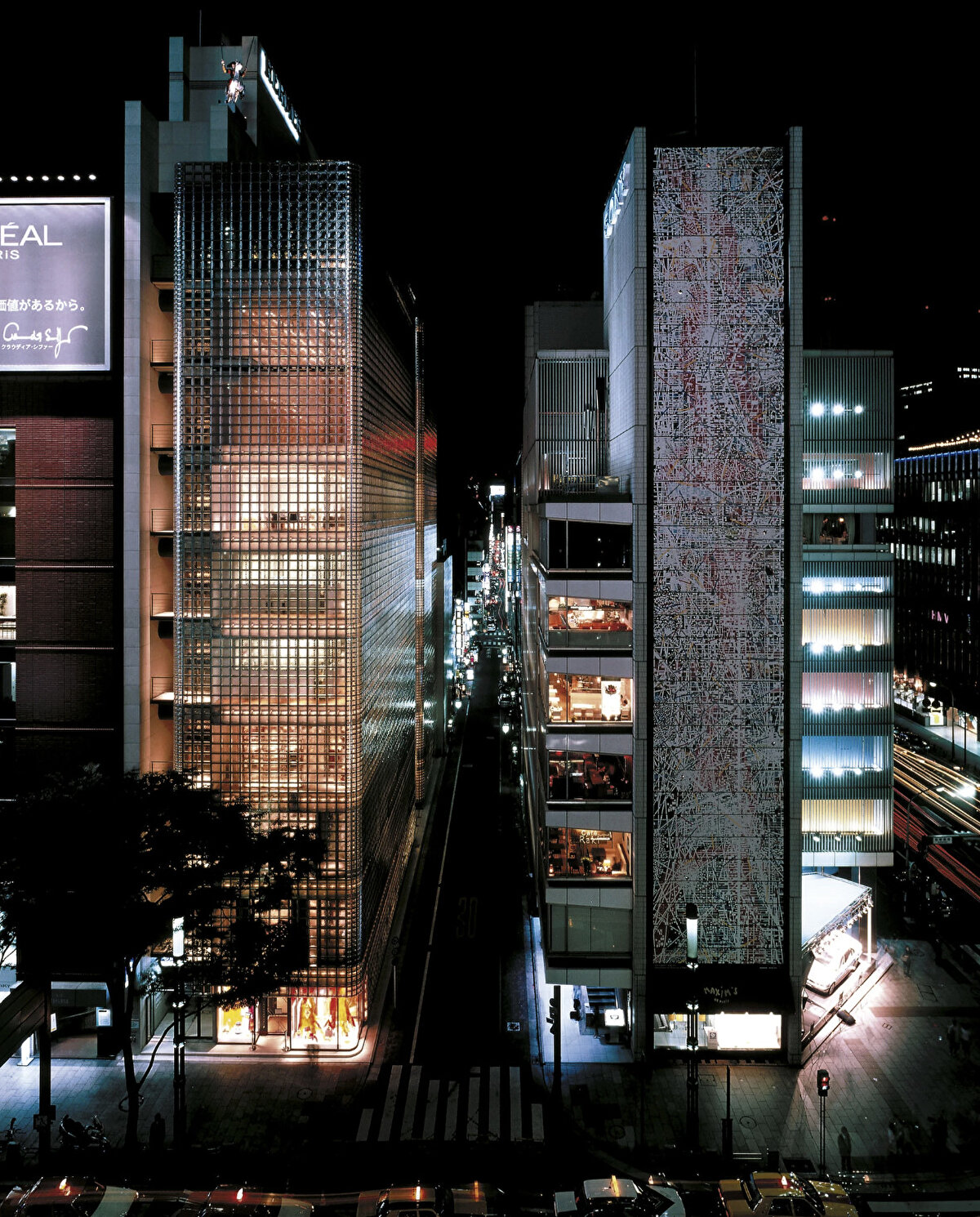 Located in Tokyo's Ginza district, Maison Hermès was designed by Renzo Piano Building Workshop between 1998 and 2001 and serves as the brand's headquarters in Asia. The 13-storey building houses shopping areas, workshops, exhibition spaces and offices, with a French garden on the roof. The façade consists of specially manufactured 45x45 cm glass blocks, creating a transparent boundary between the tranquil atmosphere inside and the bustling city life outside.