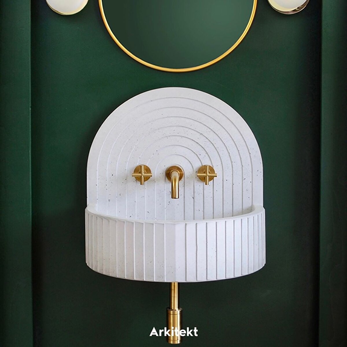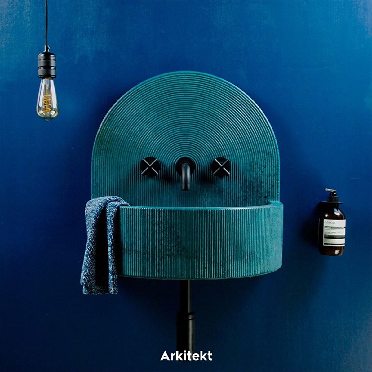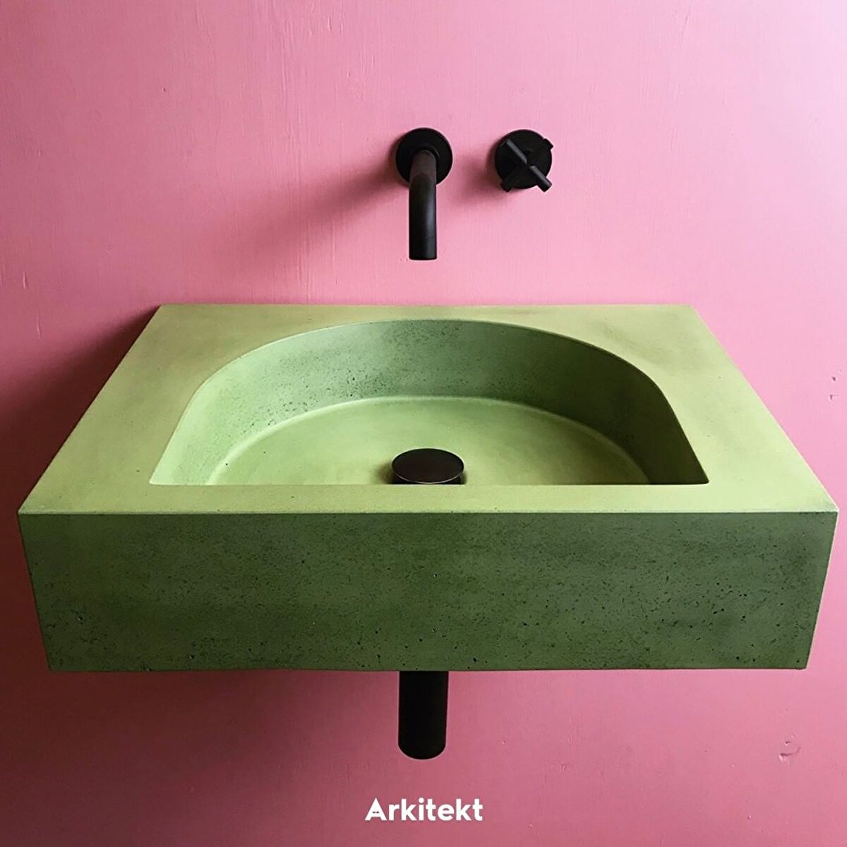 %80 geri dönüştürülmüş malzemeler kullanılarak üretilen beton lavabolar; bazen mimarinin kıvrımlı kavislerinden esinleniyor bazen de net bir çizgisel hat tanımlıyor.