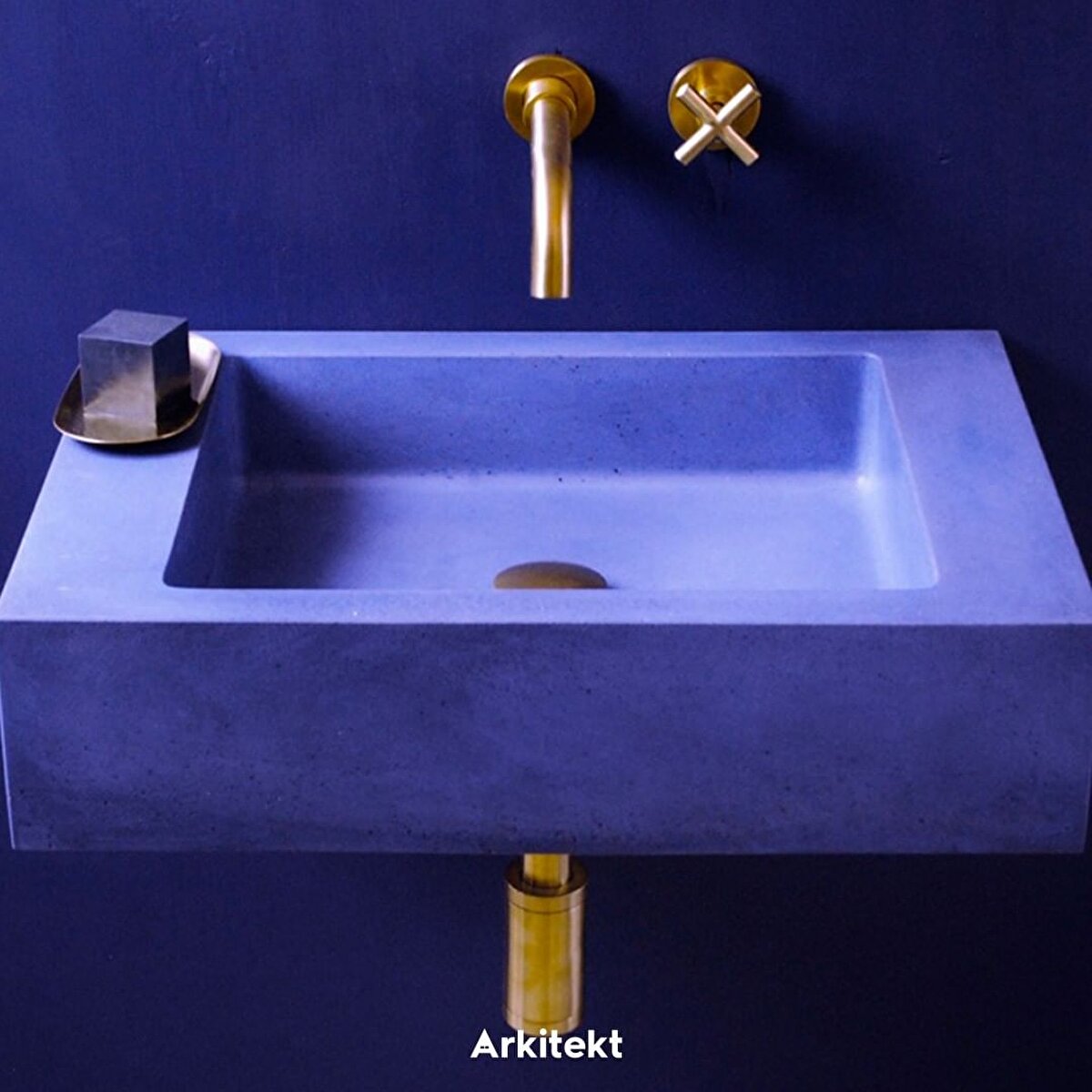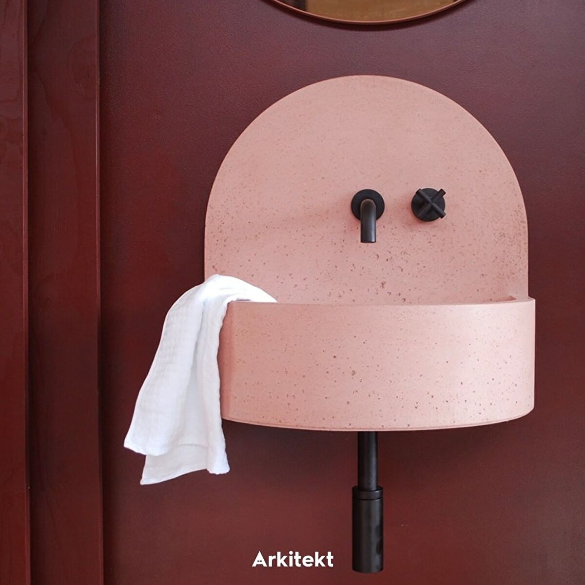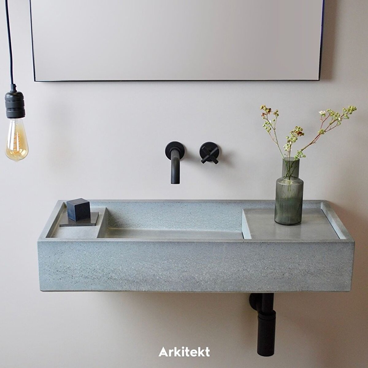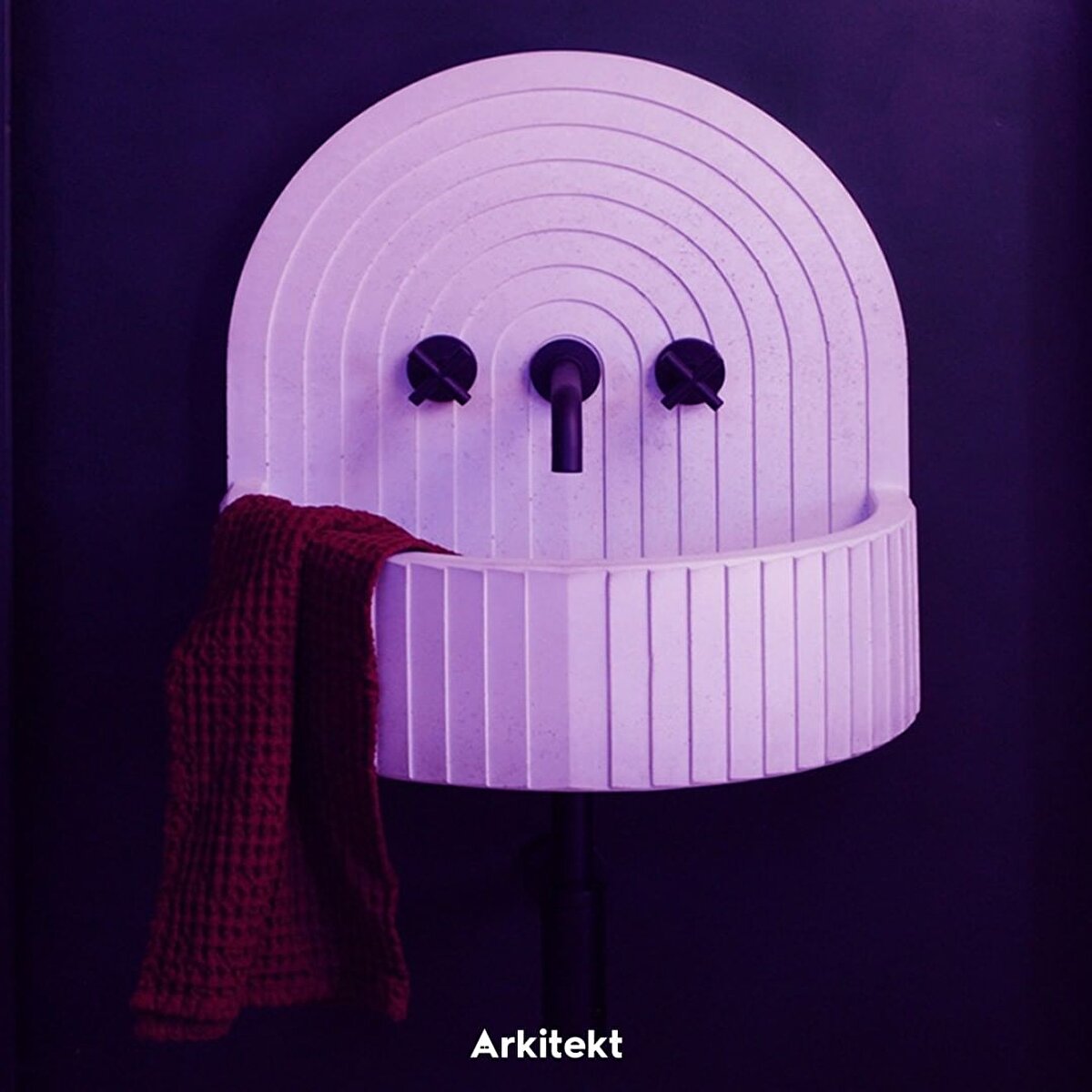 %80 geri dönüştürülmüş malzemeler kullanılarak üretilen beton lavabolar; bazen mimarinin kıvrımlı kavislerinden esinleniyor bazen de net bir çizgisel hat tanımlıyor.