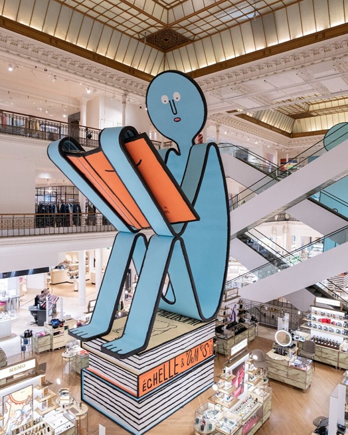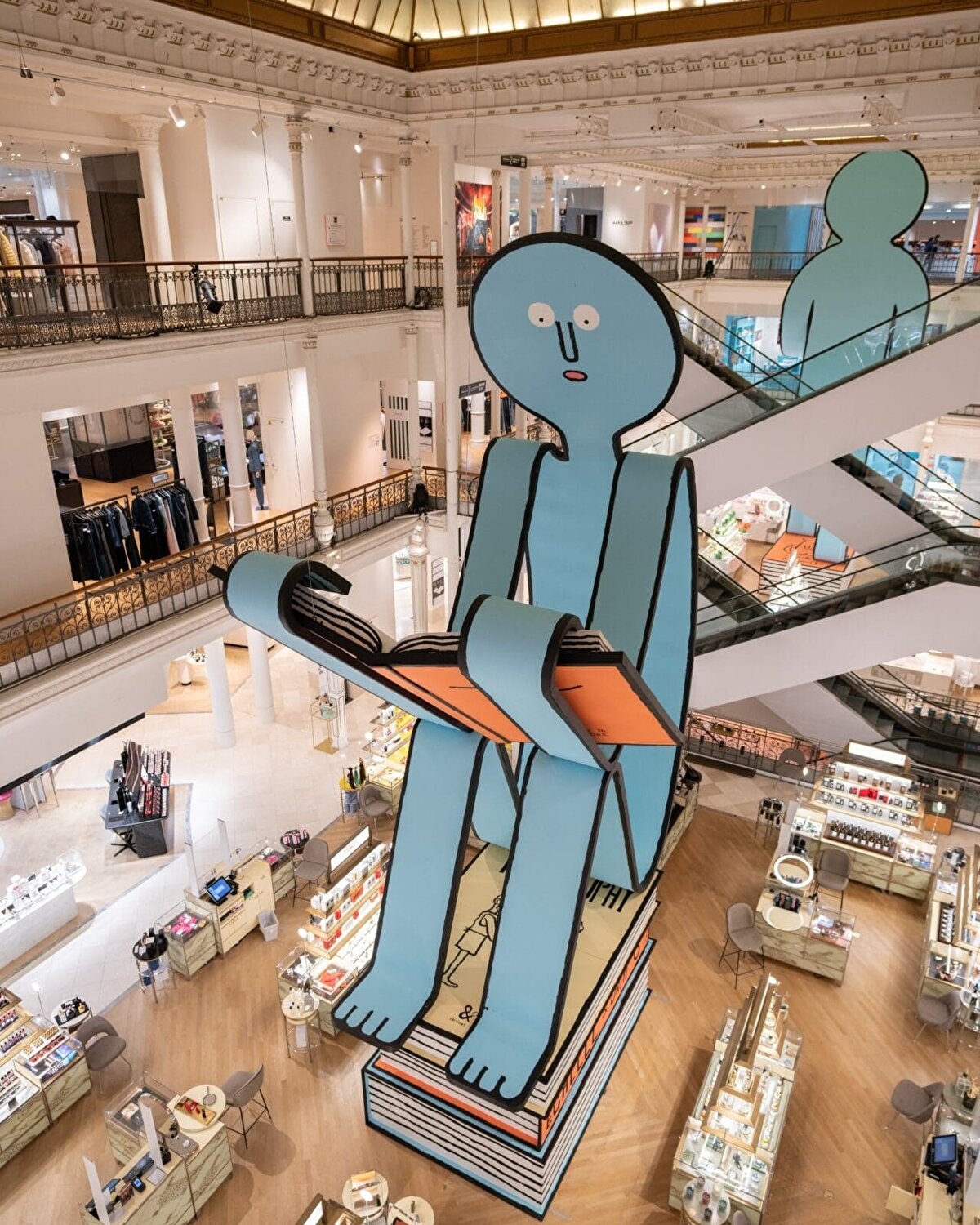 Sanatçı Jean Jullien'in iki dev heykeli, Paris'teki Le Bon Marché mağazasında sergileniyor. Jullien'in çalışmaları kağıttan iki mavi insanı tasvir ediyor: biri kitap okurken, diğeri ise kollarını binanın balkonlarına doğru uzatıyor. Sanatçının eğlenceli illüstrasyonları aynı zamanda mağazanın içindeki olağanüstü kitaplar ve alanı dolduran tuhaf yüzler kafeye renk katıyor. Bu sürükleyici mağaza-sergi deneyimi, Phamily First ajansı ve Kore markası NouNou'nun işbirliğiyle gerçekleştiriliyor.