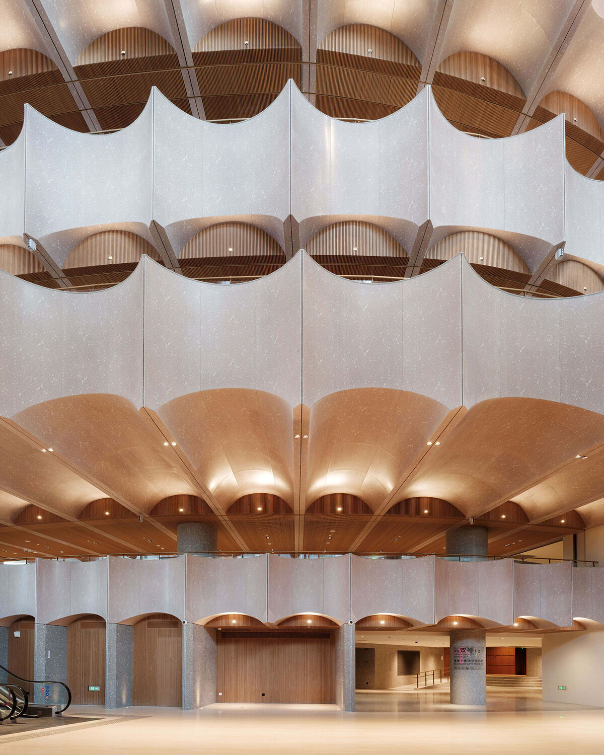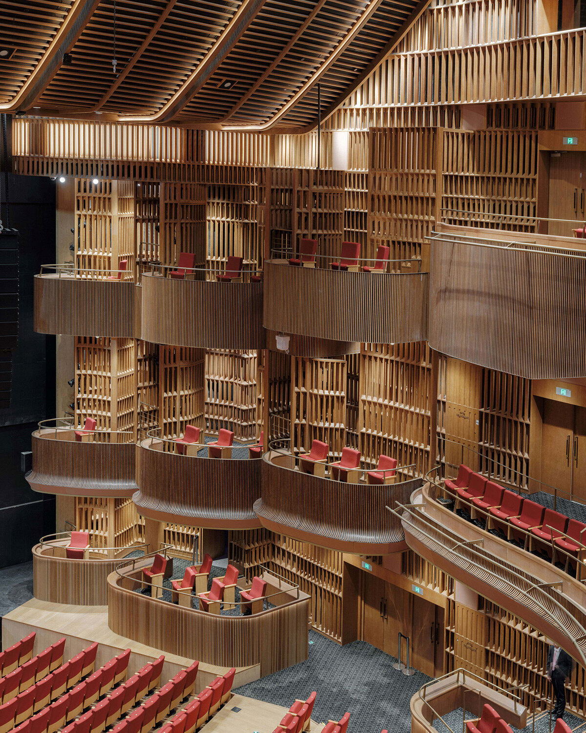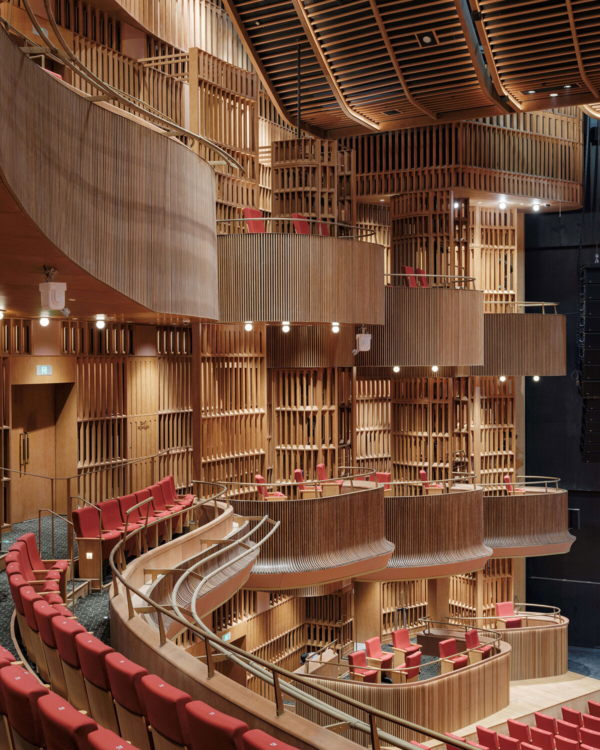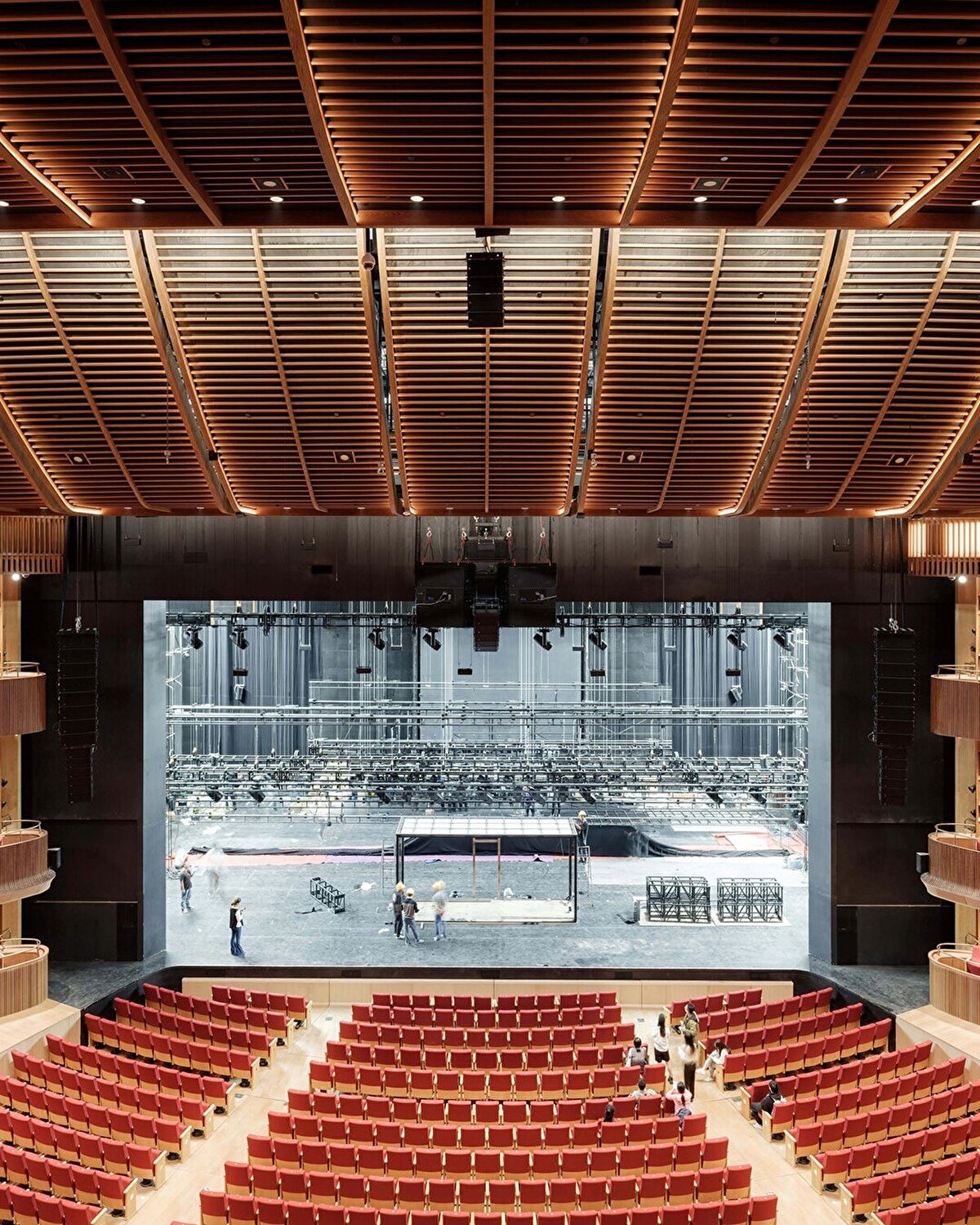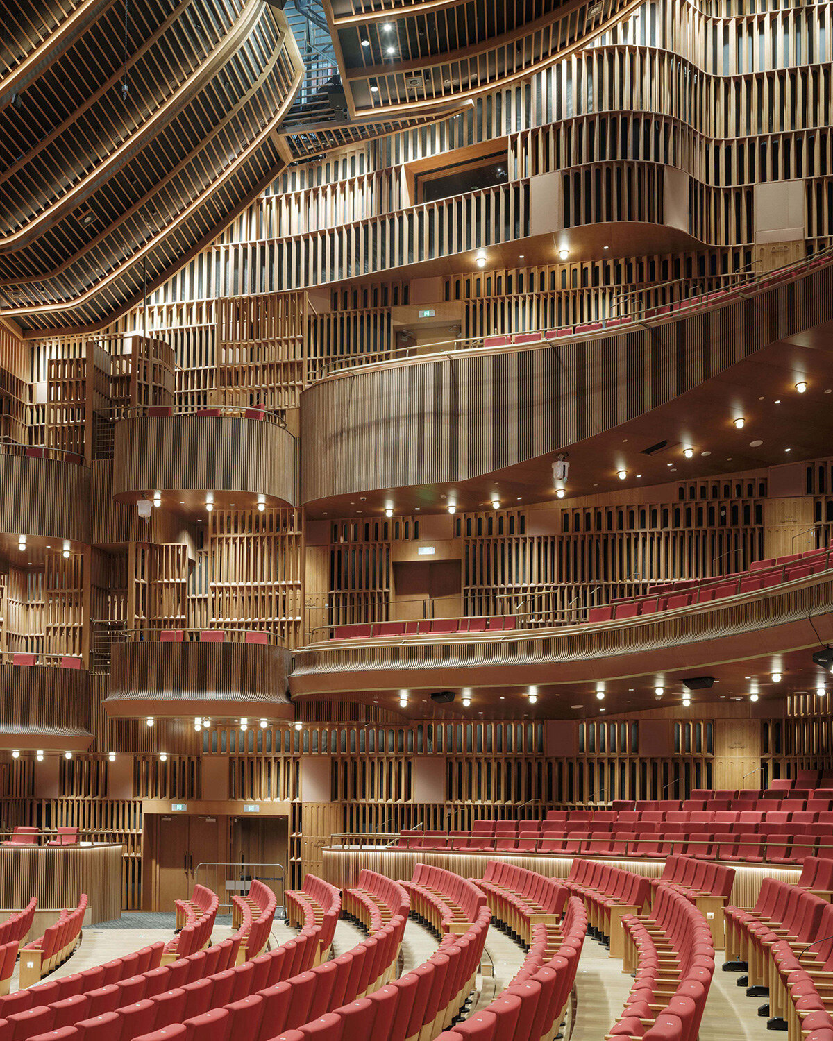 In the 2,500-seat theater, oak wood creates a warm ambience. Here, the repeating arch layout not only reflects the arena concept, but also helps to meet the acoustic requirements of the theater.