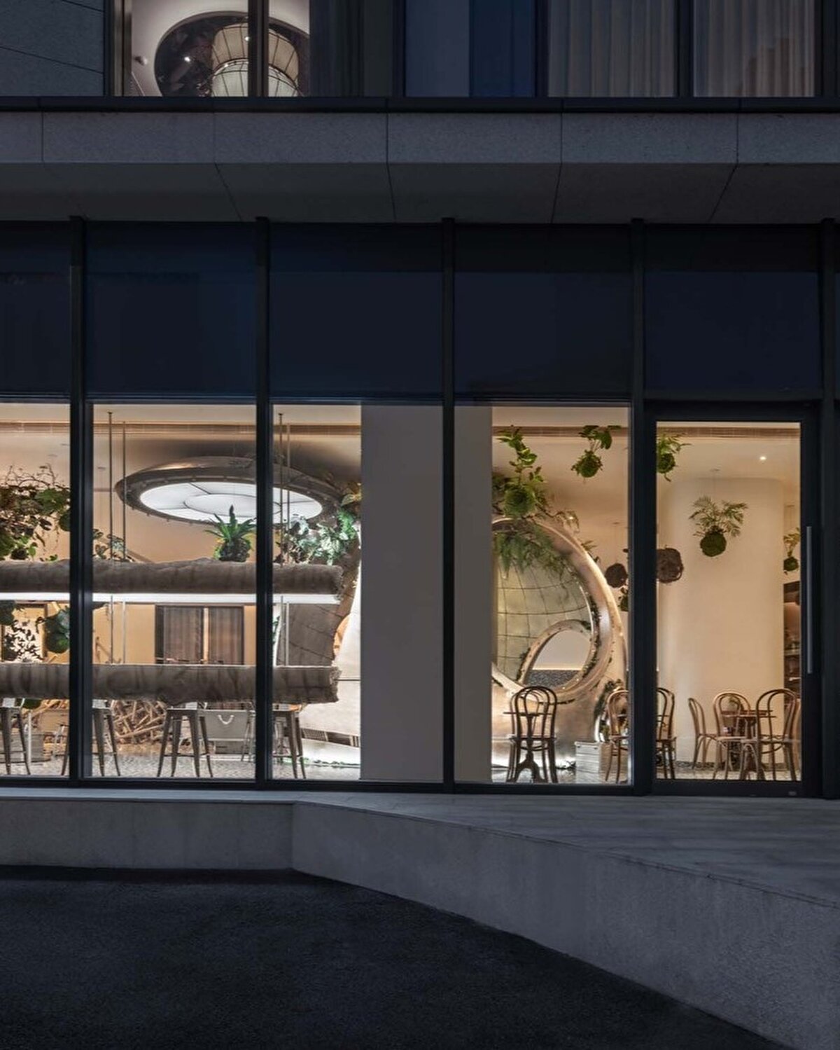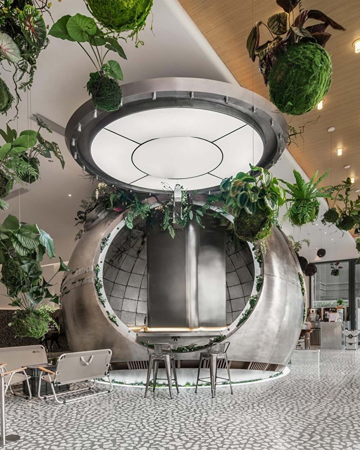 Aydınlatma tasarımı, mekânsal atmosferin belirlenmesinde merkezi bir rol oynuyor. Kapsülün kapak ve menfezlerinden gelen noktasal ışık kaynakları, üretim alanını sahne gibi öne çıkarırken, oturma alanlarını düşük seviyeli ve loş bir ışıkla çevreliyor. Aynalı ve metal yüzeyler, ışığı çoğaltarak mekânda farklı derinlikler algısı oluşturuyor. Bu yaklaşım, ziyaretçilerin mekânı hem görsel hem de tematik olarak deneyimlemesini sağlıyor.