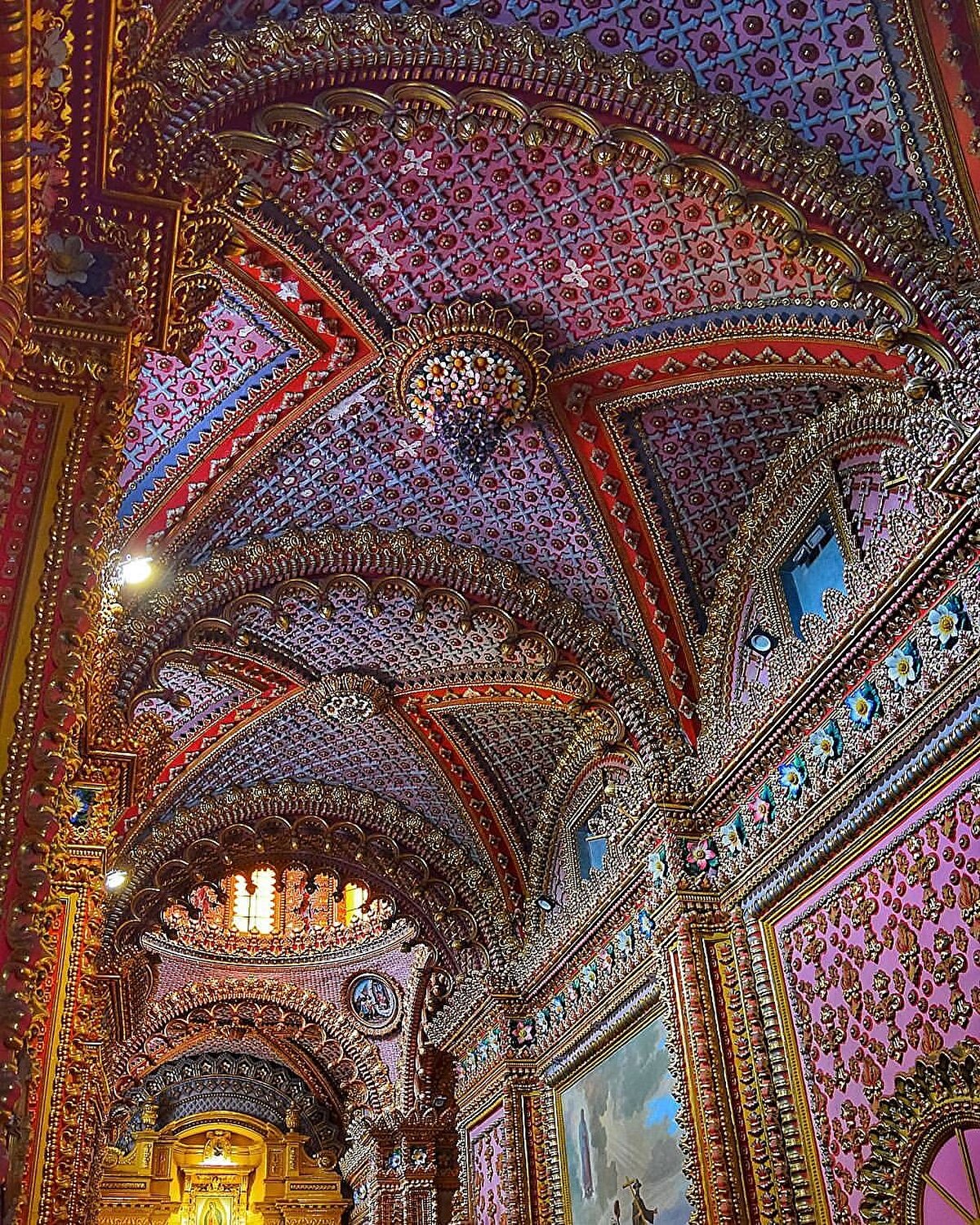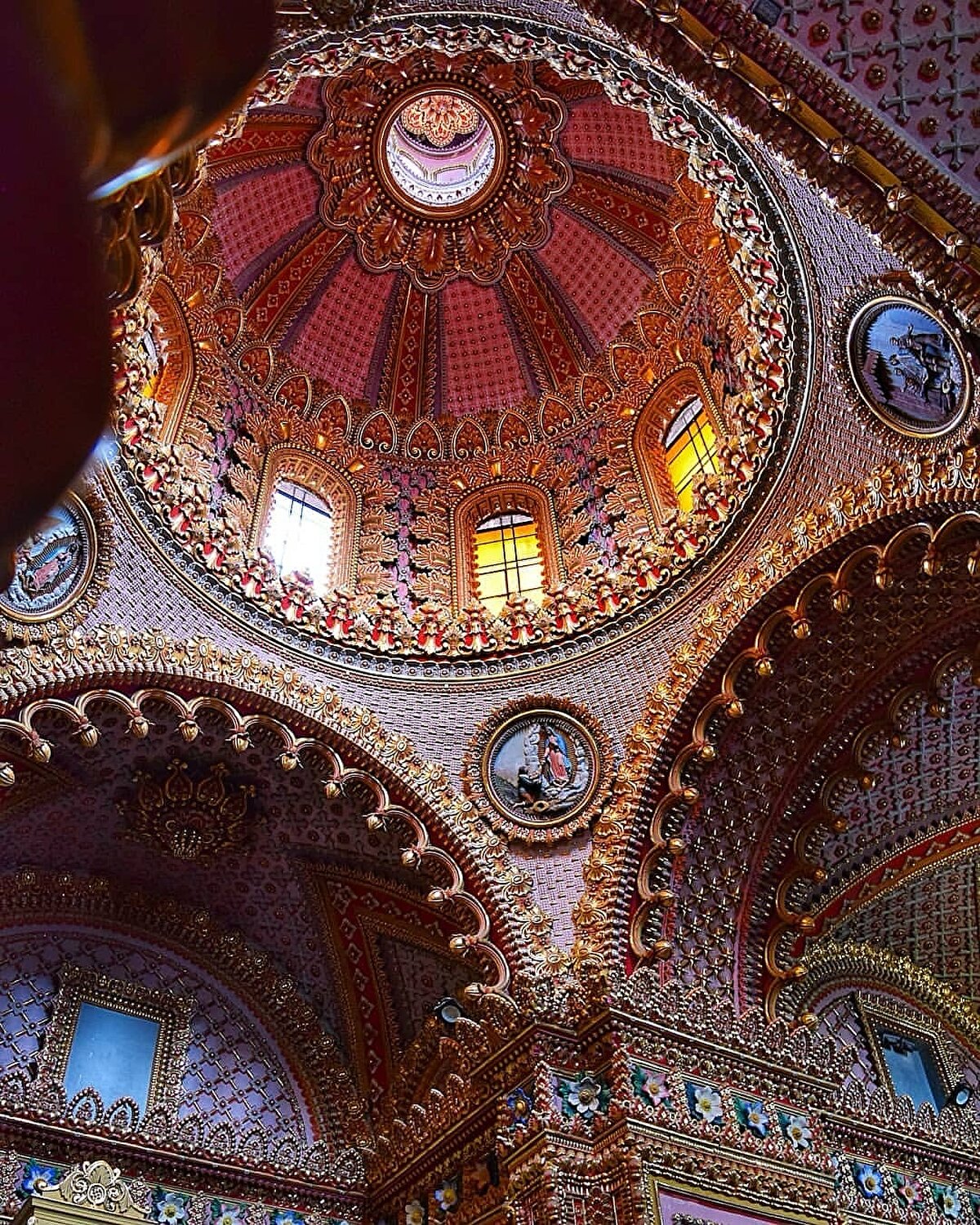 Santuario de Guadalupe, located on the outskirts of Morelia, was built in 1758 in the Baroque style. Dedicated to Our Lady of Guadalupe, its simple exterior balances the intensity of the interior's ornamentation. The intricate carvings, gold leaf details and vivid frescoes covering the main nave and side walls reinforce the spatial effect of the Baroque aesthetic. The decorative compositions covering the ceiling surfaces add depth to the interior with the play of light and shadow.