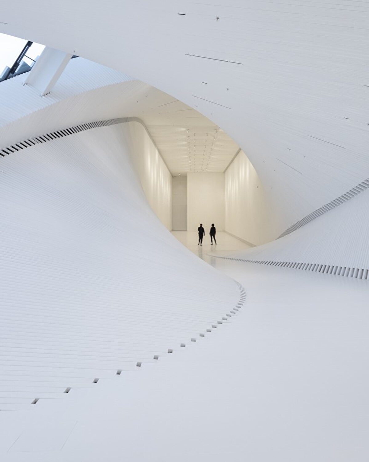Yapının bükülen formu, iç mekânda üç farklı galeri alanı oluşturuyor: Yüksek tavanlı ve doğal ışık alan geniş bir sergi alanı, formun döndüğü kısımda yer alan ve ziyaretçilere perspektif değişimi yaşatan bölüm ve son olarak, daha alçak tavanlı, karanlık ve kontrollü bir sergi alanı.