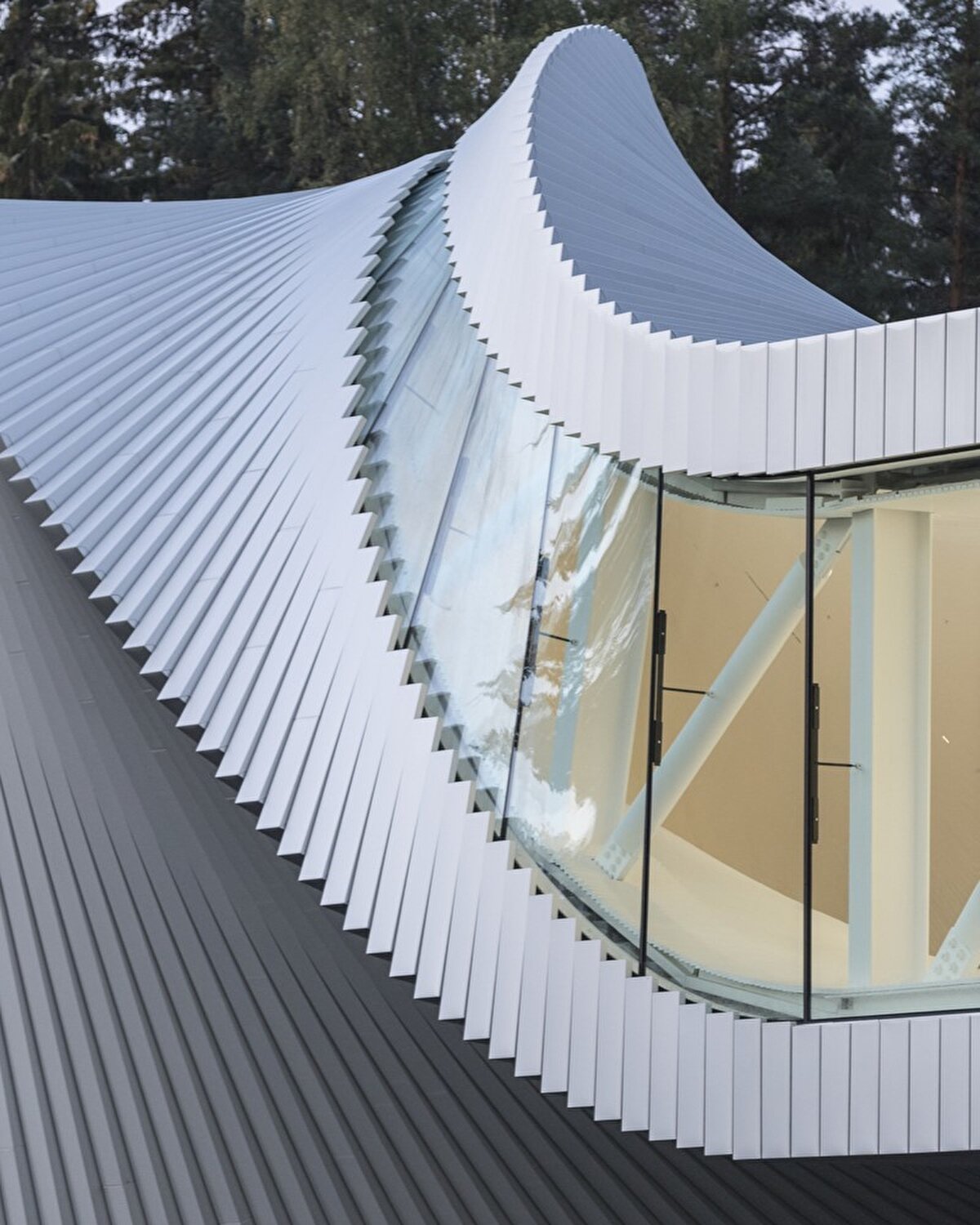 Dış cephe, 40 cm genişliğinde beyaz alüminyum panellerden oluşuyor ve bu paneller bükülen formu vurguluyor.