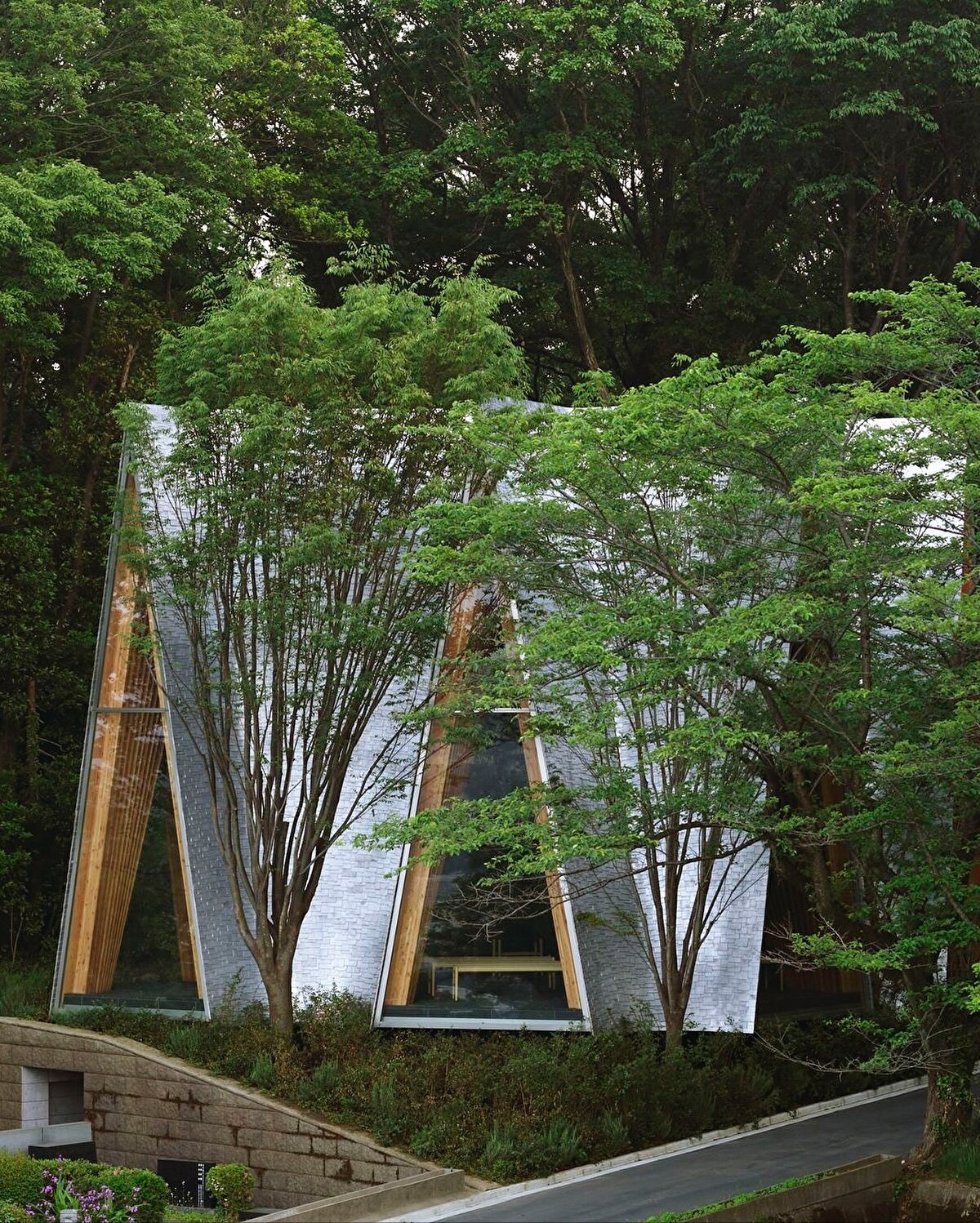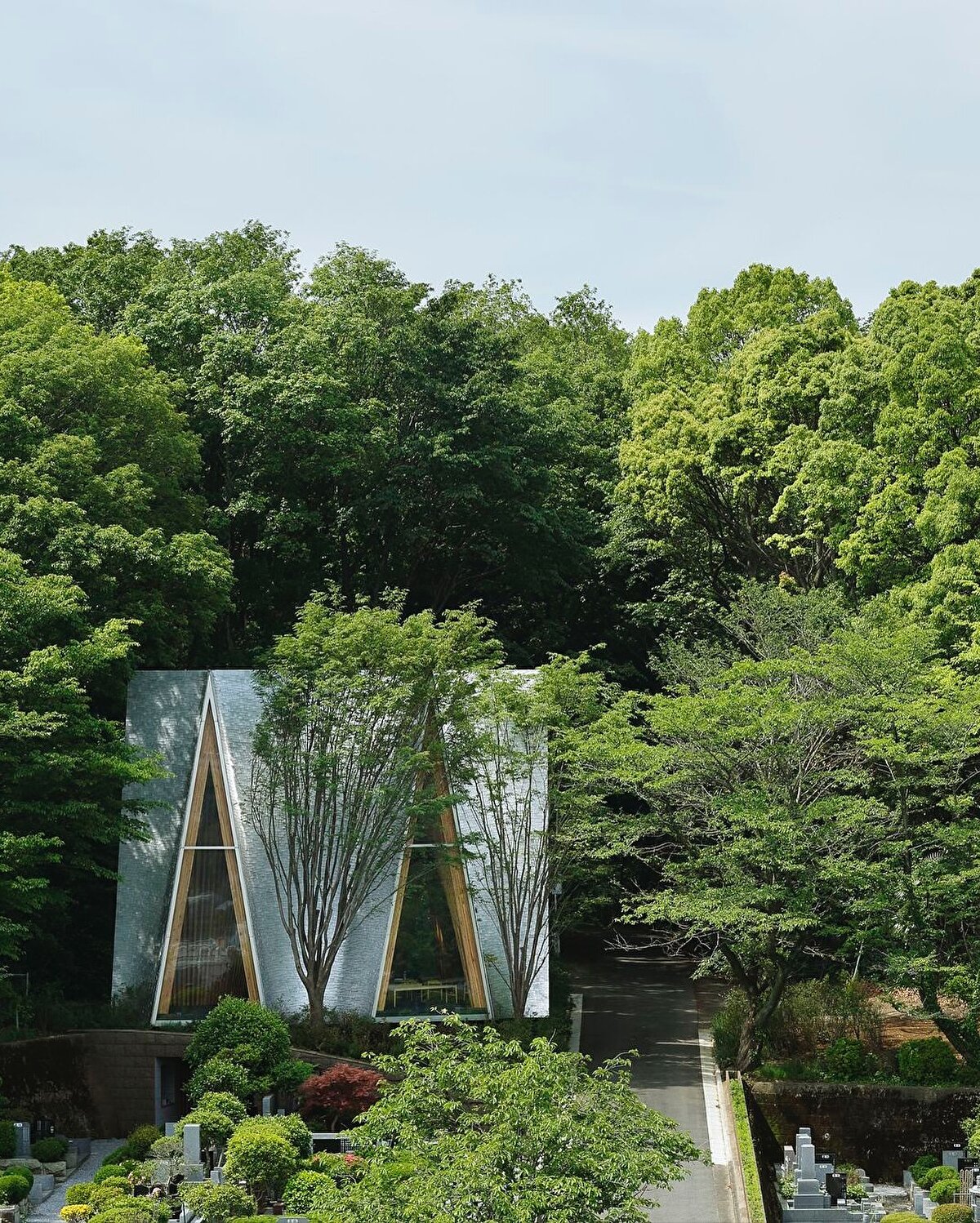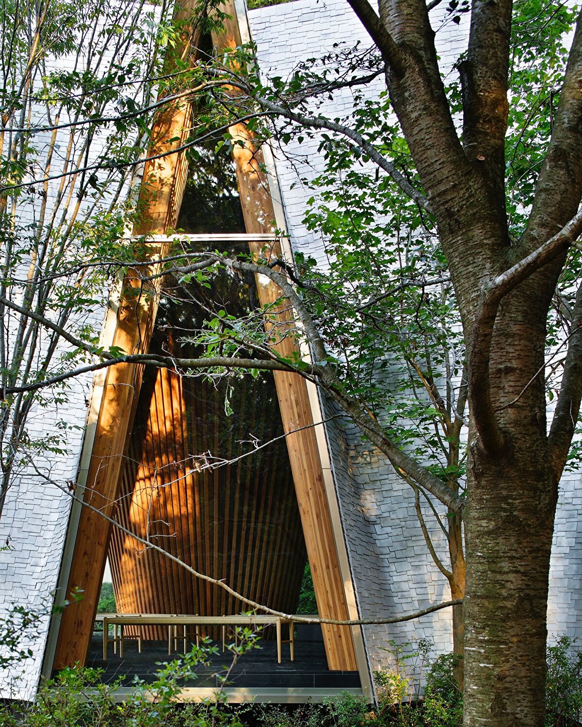 Sayama Forest Chapel, Hiroshi Nakamura & NAP @hiroshi_nakamura_naparchitects tarafından 2013 yılında, Saitama'daki Sayama göl koruma ormanının eşiğinde, doğal çevreyle kurduğu ilişki üzerine kurgulanıyor. Yapı, geleneksel Japon Gassho tipolojisinden esinlenen, birbirine yaslanan iki eğimli kiriş sistemiyle ormana yönelen bir mimari jest oluşturuyor. Alüminyum döküm kiremitlerle kaplanan çatı yüzeyi, zanaatkâr üretimiyle doğal ışığı kırarak çevredeki ağaçların hareketini mekâna yansıtıyor. Küçük üçgen bir parselde konumlanan yapı, içe doğru eğimli duvarlarıyla hem fiziksel hem de simgesel olarak ormana yönelen bir boşluk tarifliyor.