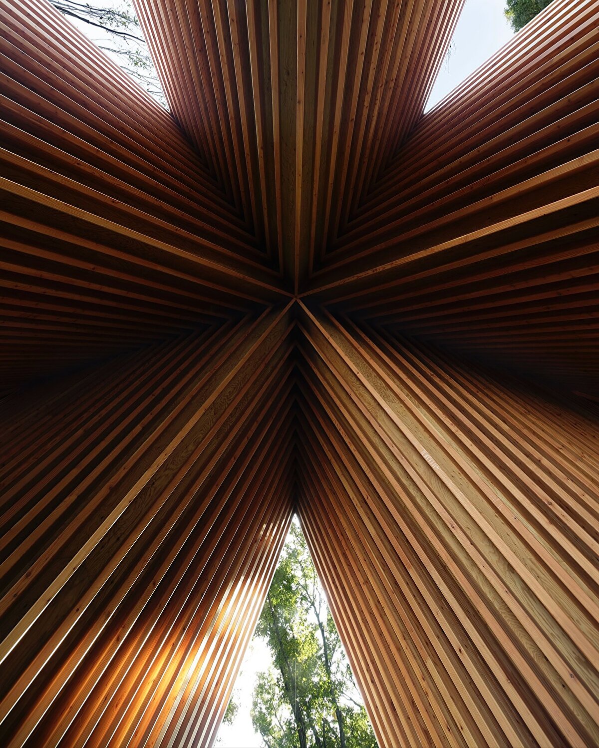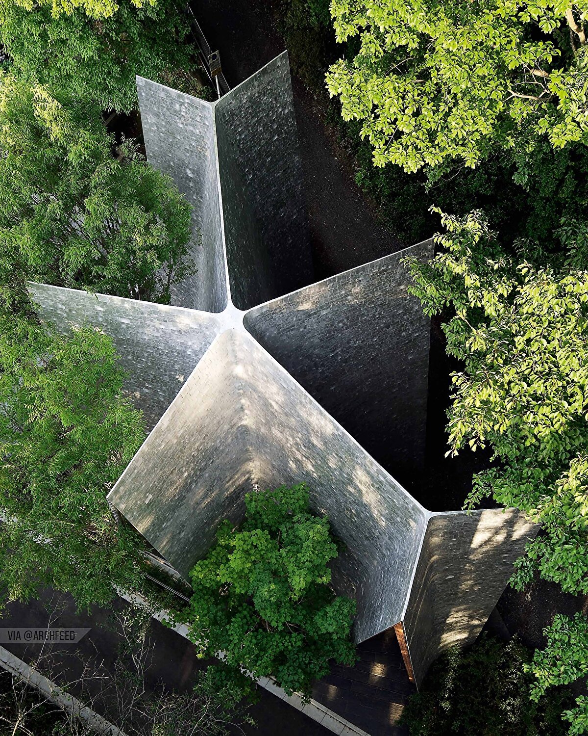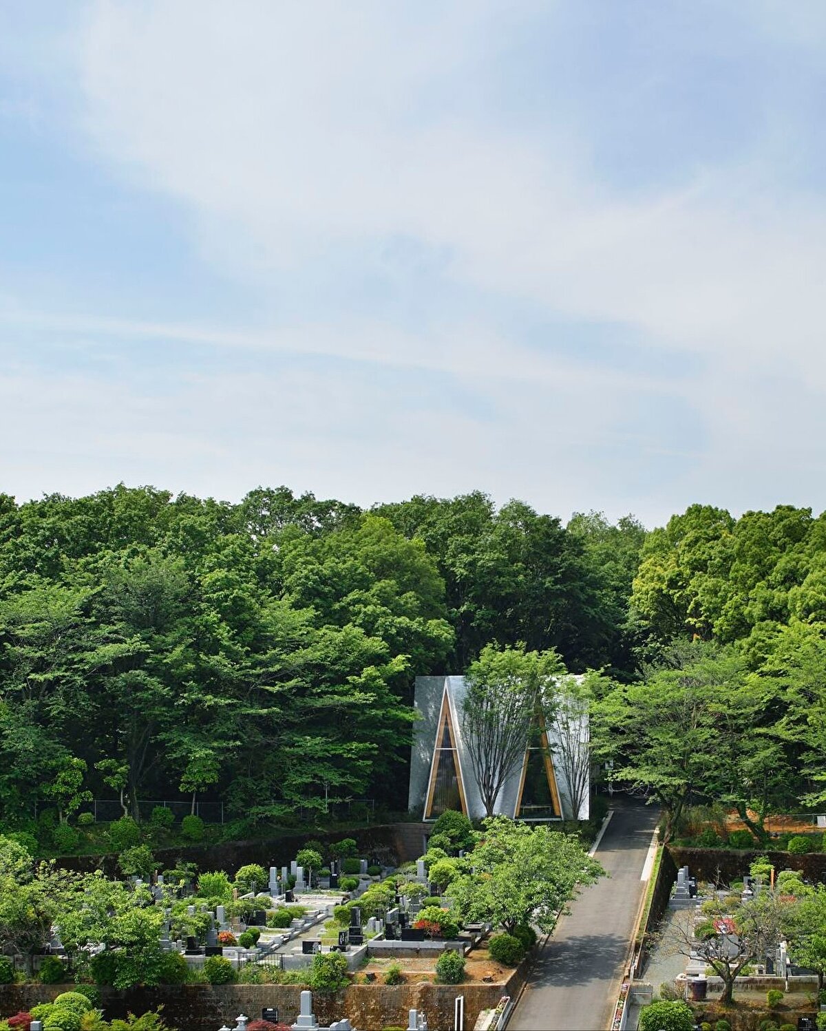 Sayama Forest Chapel, Hiroshi Nakamura & NAP @hiroshi_nakamura_naparchitects tarafından 2013 yılında, Saitama'daki Sayama göl koruma ormanının eşiğinde, doğal çevreyle kurduğu ilişki üzerine kurgulanıyor. Yapı, geleneksel Japon Gassho tipolojisinden esinlenen, birbirine yaslanan iki eğimli kiriş sistemiyle ormana yönelen bir mimari jest oluşturuyor. Alüminyum döküm kiremitlerle kaplanan çatı yüzeyi, zanaatkâr üretimiyle doğal ışığı kırarak çevredeki ağaçların hareketini mekâna yansıtıyor. Küçük üçgen bir parselde konumlanan yapı, içe doğru eğimli duvarlarıyla hem fiziksel hem de simgesel olarak ormana yönelen bir boşluk tarifliyor.