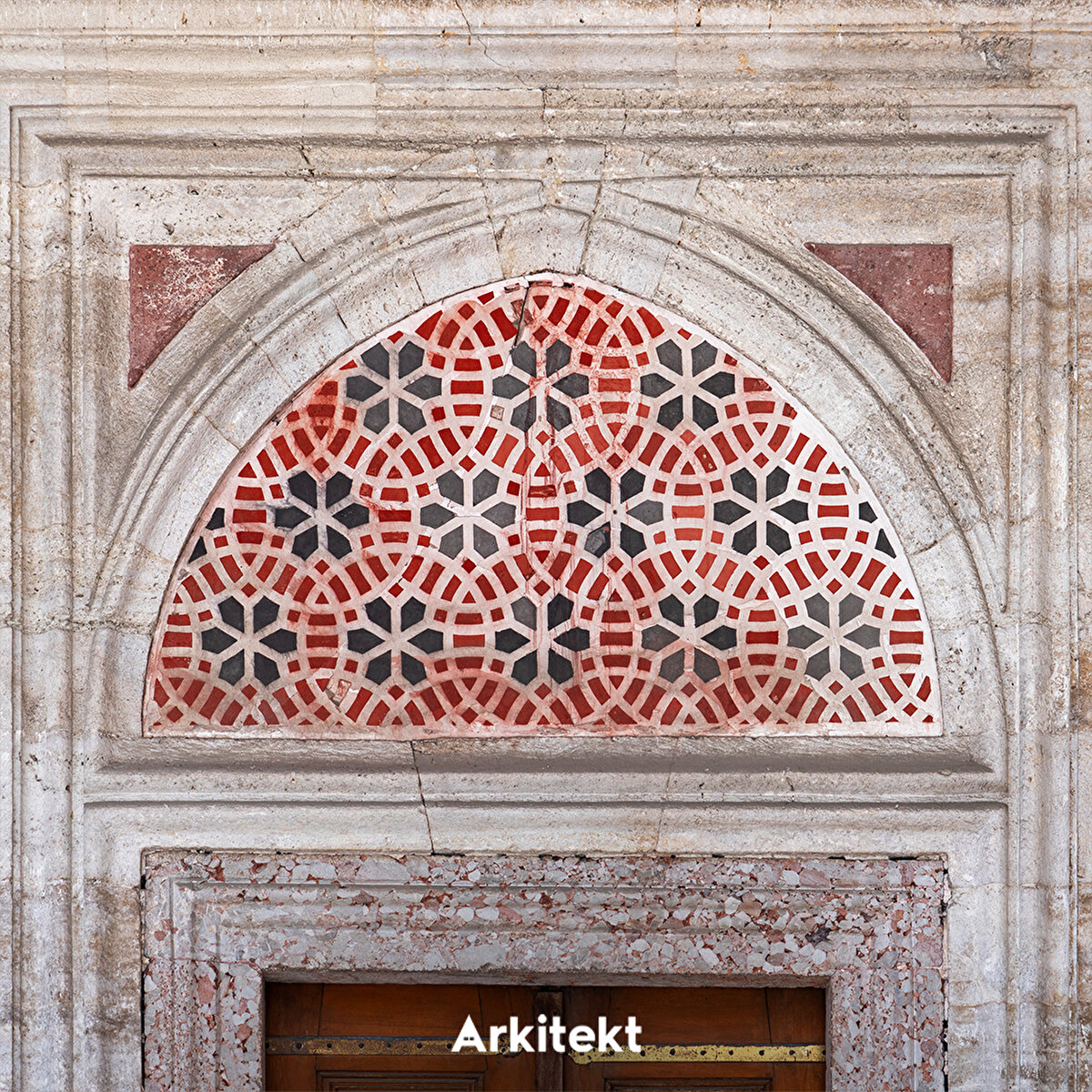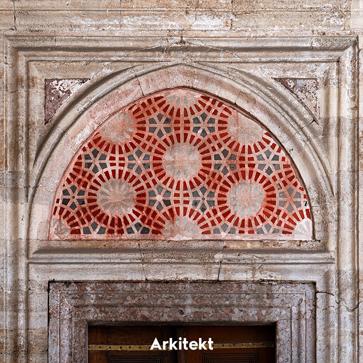 Bu avluda bulunan 24 pencere alınlığı, renkli alçı işçiliğiyle yapılmış olup geometrik ve bitkisel motiflerle bezenmiştir. Alınlıklardaki süslemeler, avlunun Doğu ve Batı yönlerinde simetrik olarak karşılıklı biçimde konumlandırılmıştır.