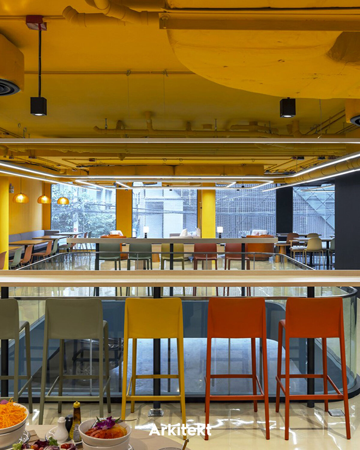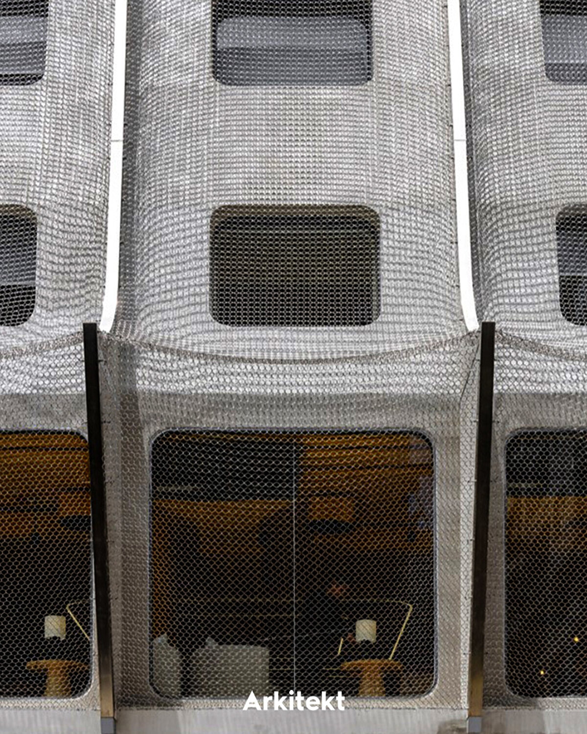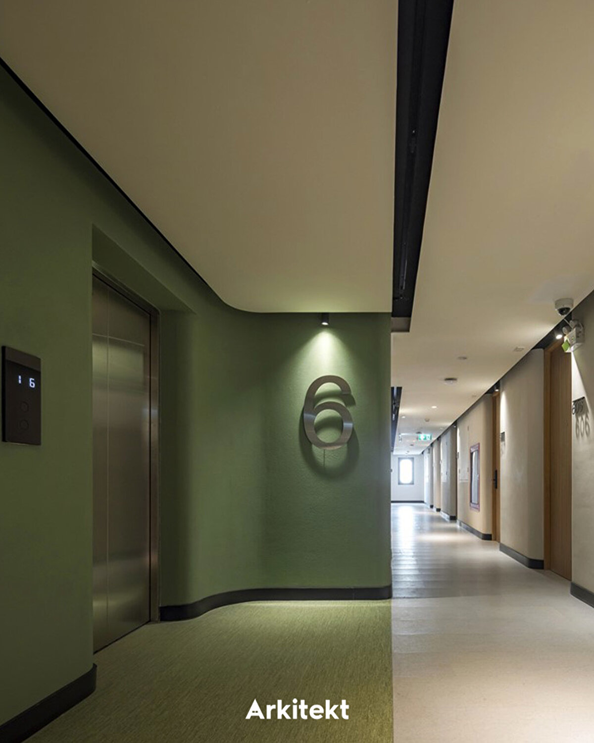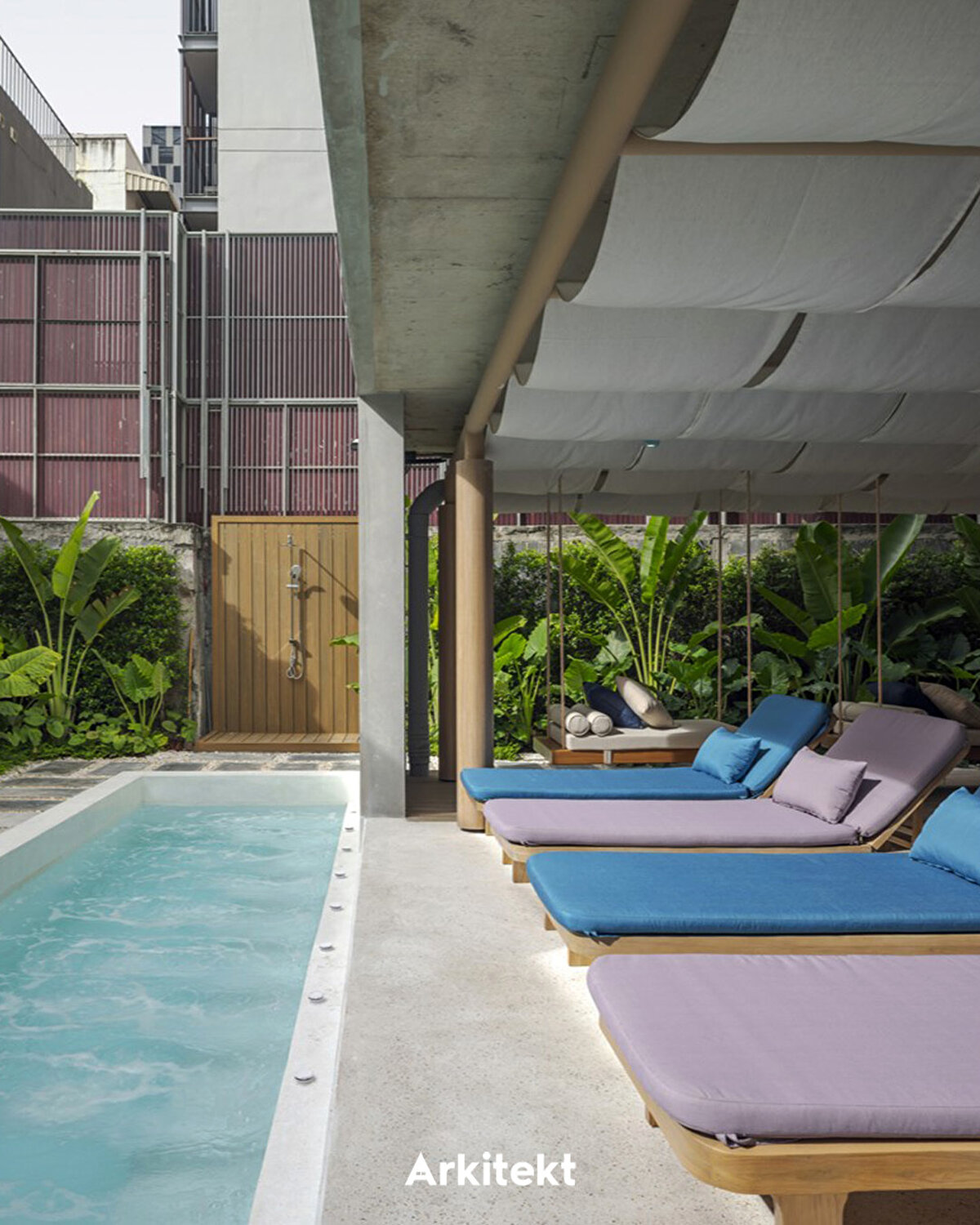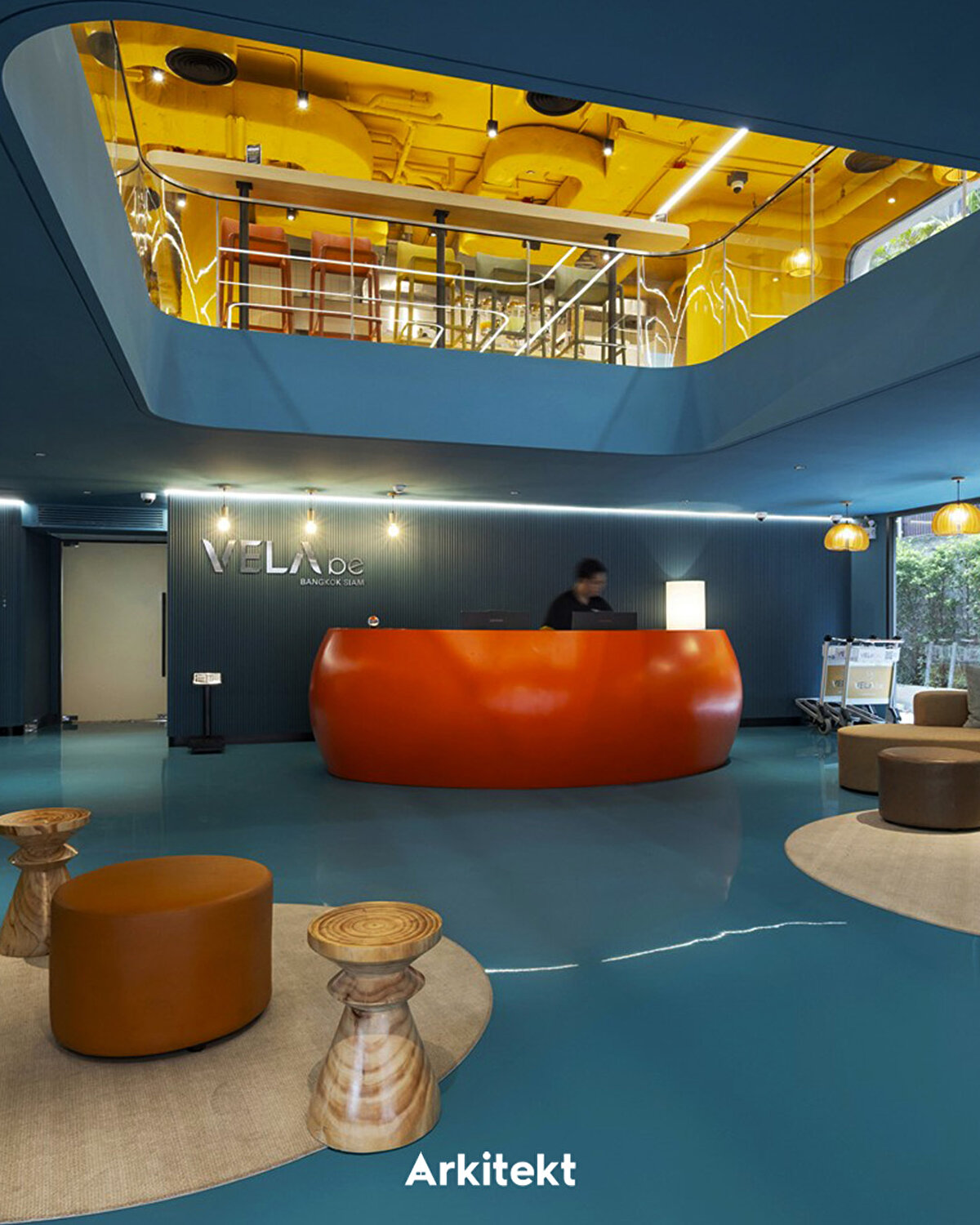 The design hotel that opened in Bangkok's Siam Square features traditional Thai architectural motifs on its facade. The design incorporates the Pun-Lom element, seen in Thai homes, with carved details, and the facade is completed with stainless steel chains, referencing the mosquito nets used in the past. The interior, which uses a vibrant palette inspired by the country's cultural colors, features a lobby reception desk shaped like orange pebbles. The gallery opening provides visual continuity with the common area on the upper floor. The pool in the rear section creates a tranquil atmosphere within the design, which is enlivened by colors and patterns. On each floor, the elevator lobbies are defined by different colors. As the tones gradually soften toward the rooms, the spatial transitions within the hotel become a layered experience