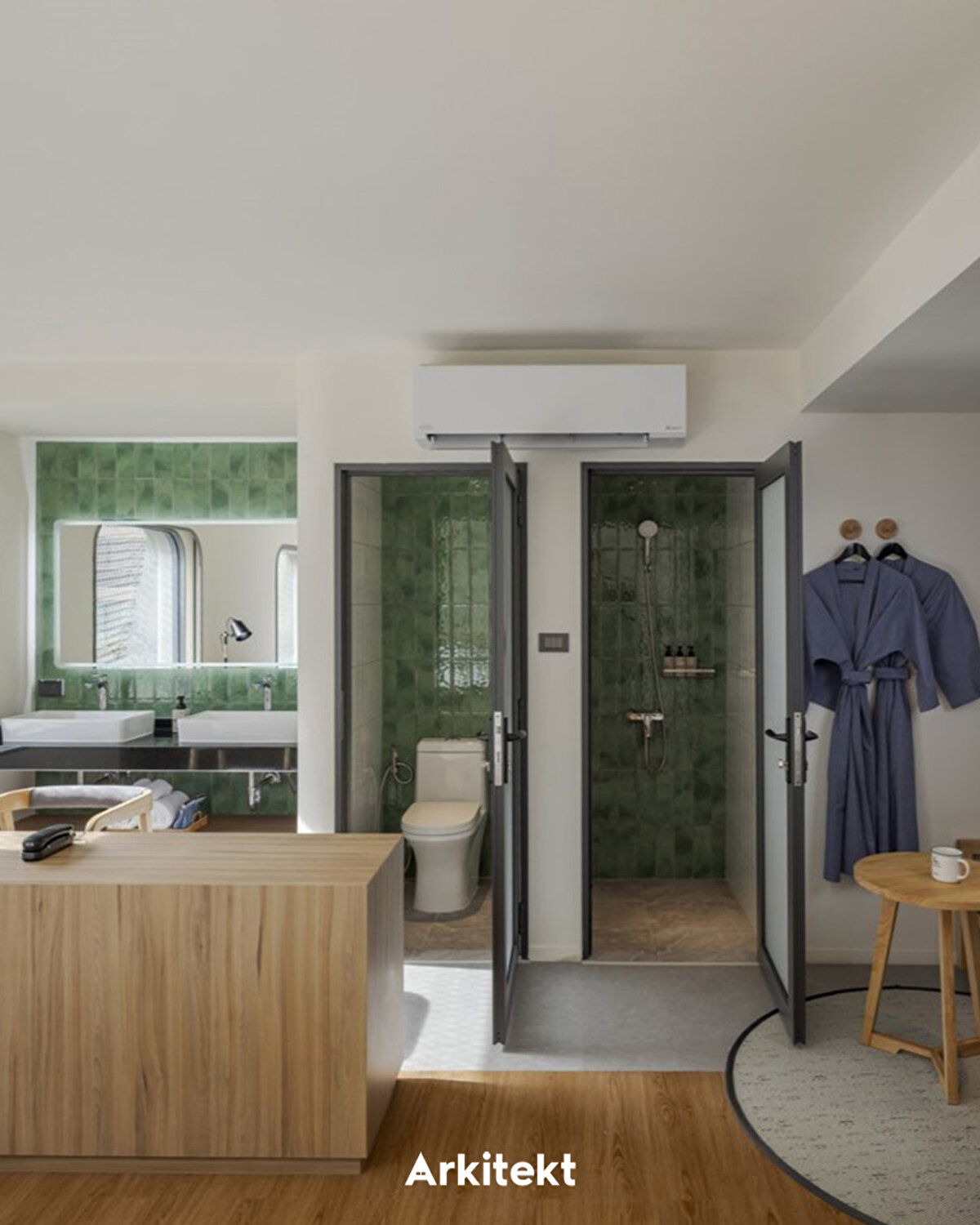 Bangkok'un Siam Square'de açılan tasarım oteli, cephesinde geleneksel Tay mimari motiflerine yer veriyor. Tasarımda, Tay evlerinde görülen oyma detaylı Pun-Lom öğesi kullanılıyor ve cephe paslanmaz çelik zincirlerle tamamlanarak geçmişte kullanılan cibinliklere gönderme yapıyor. Ülkenin kültürel renklerinden esinlenen canlı bir paletin kullanıldığı iç mekânda, lobi turuncu çakıl formundaki resepsiyon masasıyla dikkat çekiyor. Galeri açıklığı ise üst kattaki ortak alanla görsel süreklilik sağlıyor. Arka bölümde yer alan havuz, renk ve desenlerle hareketlenen tasarımın içinde dingin bir atmosfer oluşturuyor. Katlarda farklı renklerle tanımlanan asansör holleri ve odalara yaklaşırken yumuşayan tonlar, otel içindeki mekânsal geçişleri aşamalı bir deneyime dönüştürüyor.