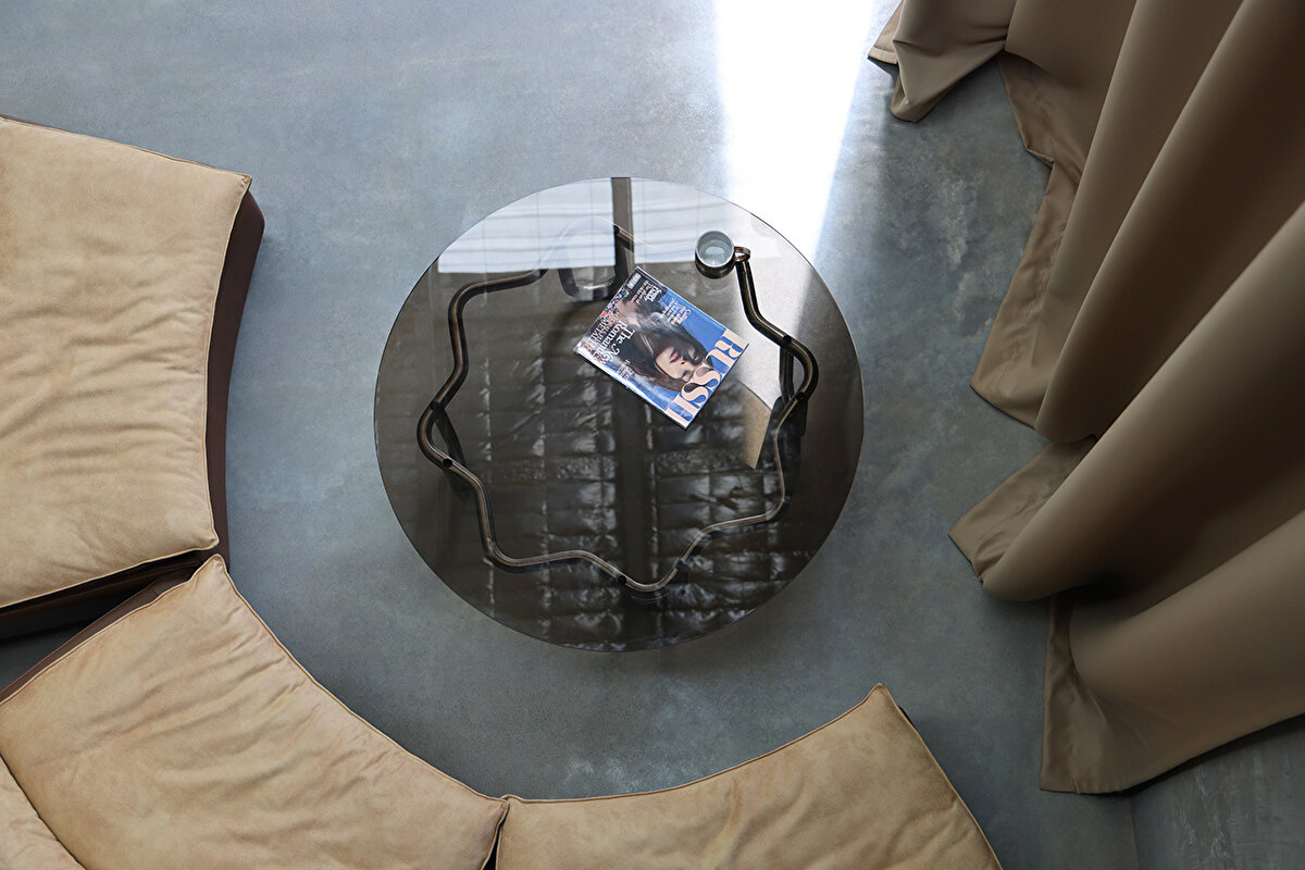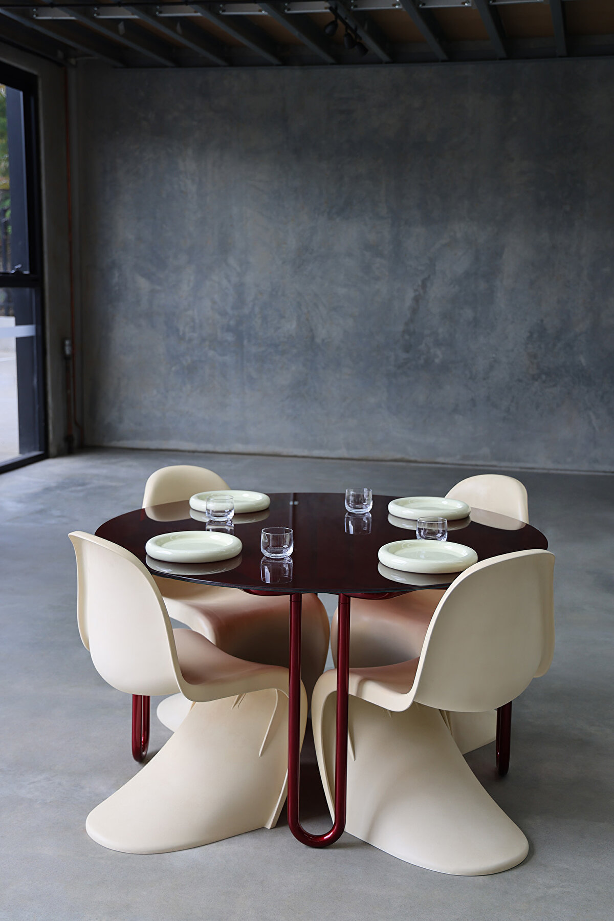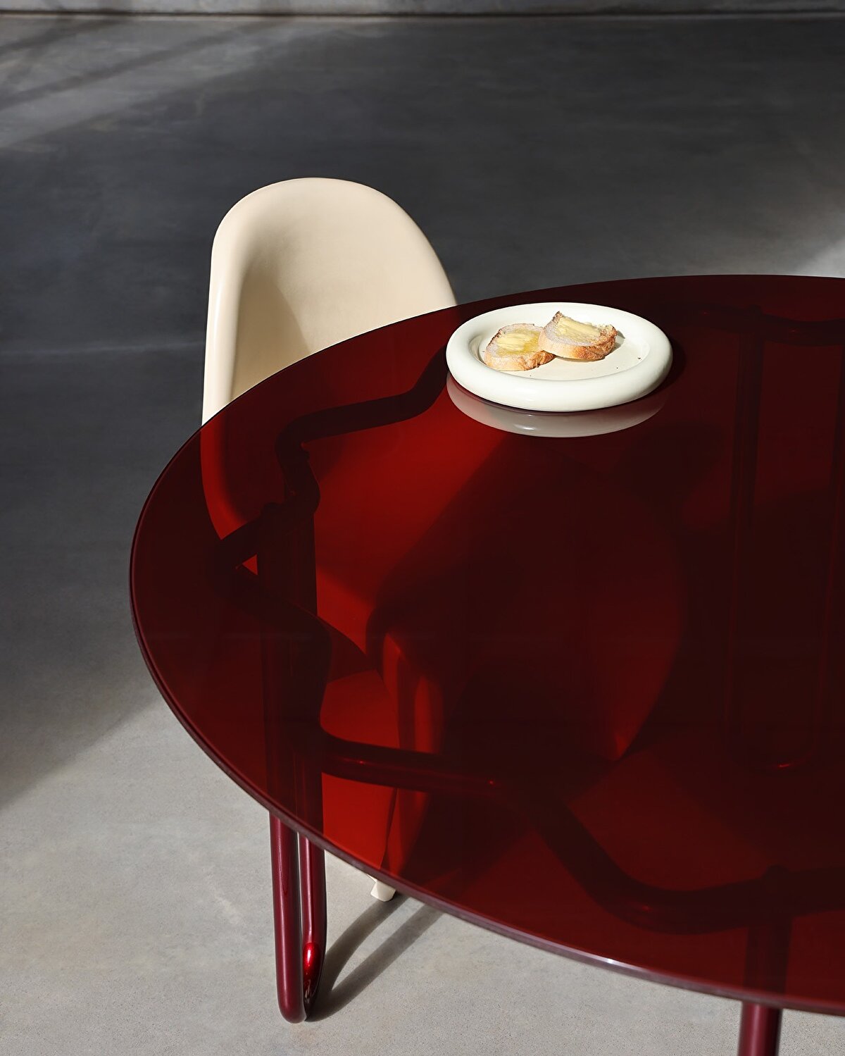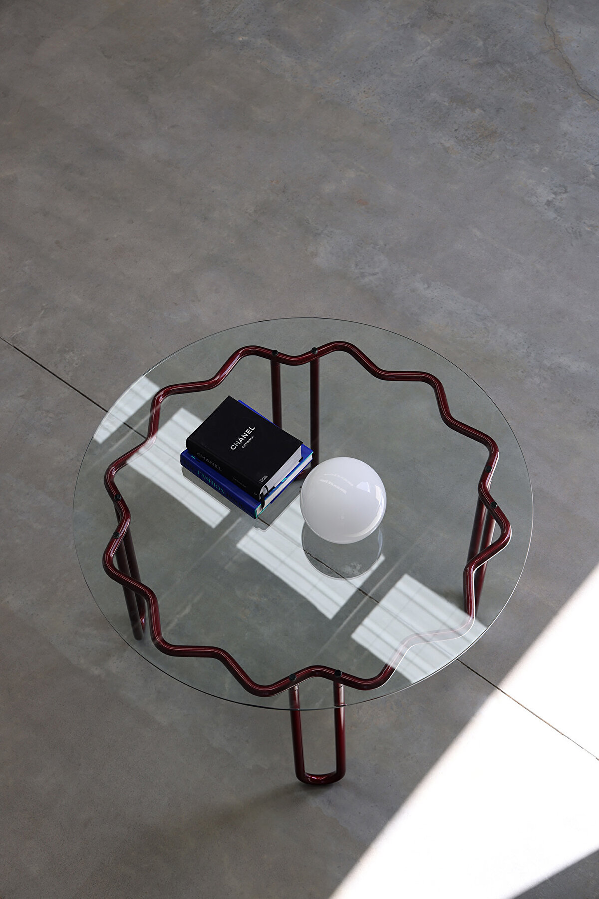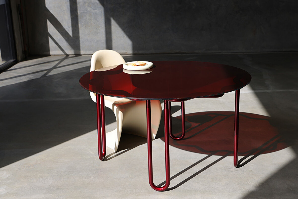 Yonder Tables, silindirik çelik strüktürü ve yarı saydam cam yüzeyiyle biçimlenen modüler bir masa serisi olarak karşımıza çıkıyor. TUBULAA @tubulaa_ tarafından tasarlanan koleksiyon, geniş ve kavisli ayak detaylarıyla dengeli, akıcı bir form dili sunuyor.