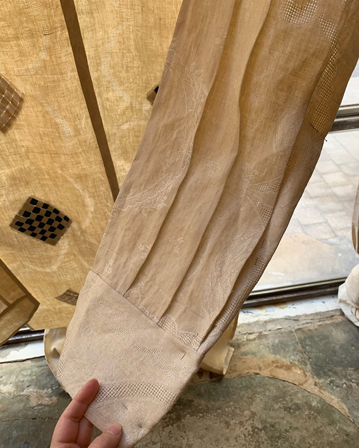 Made from vintage fabric, this unique shirt-curtain represents a fusion of art and function, blending the shirt with the elegance of the curtain.