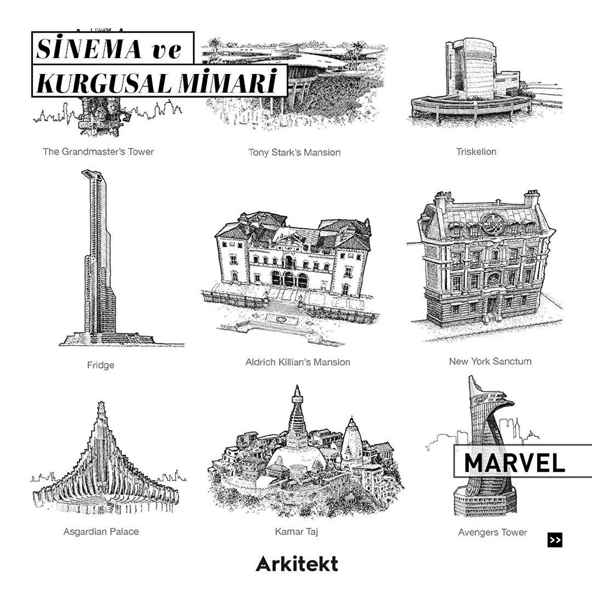 Game of Thrones ve Star Wars'un karizmatik; Harry Potter ve Marvel'ın eğlenceli dünyasına diğer filmlerin eşlik ettiği bu serimiz, size tek bir gönderide onlarca farklı ve özel mekan vadediyor. Sizin favorinizi merak ediyor ve ekliyoruz: 'Sinema ve mimari birbirine çok yakışıyor!'