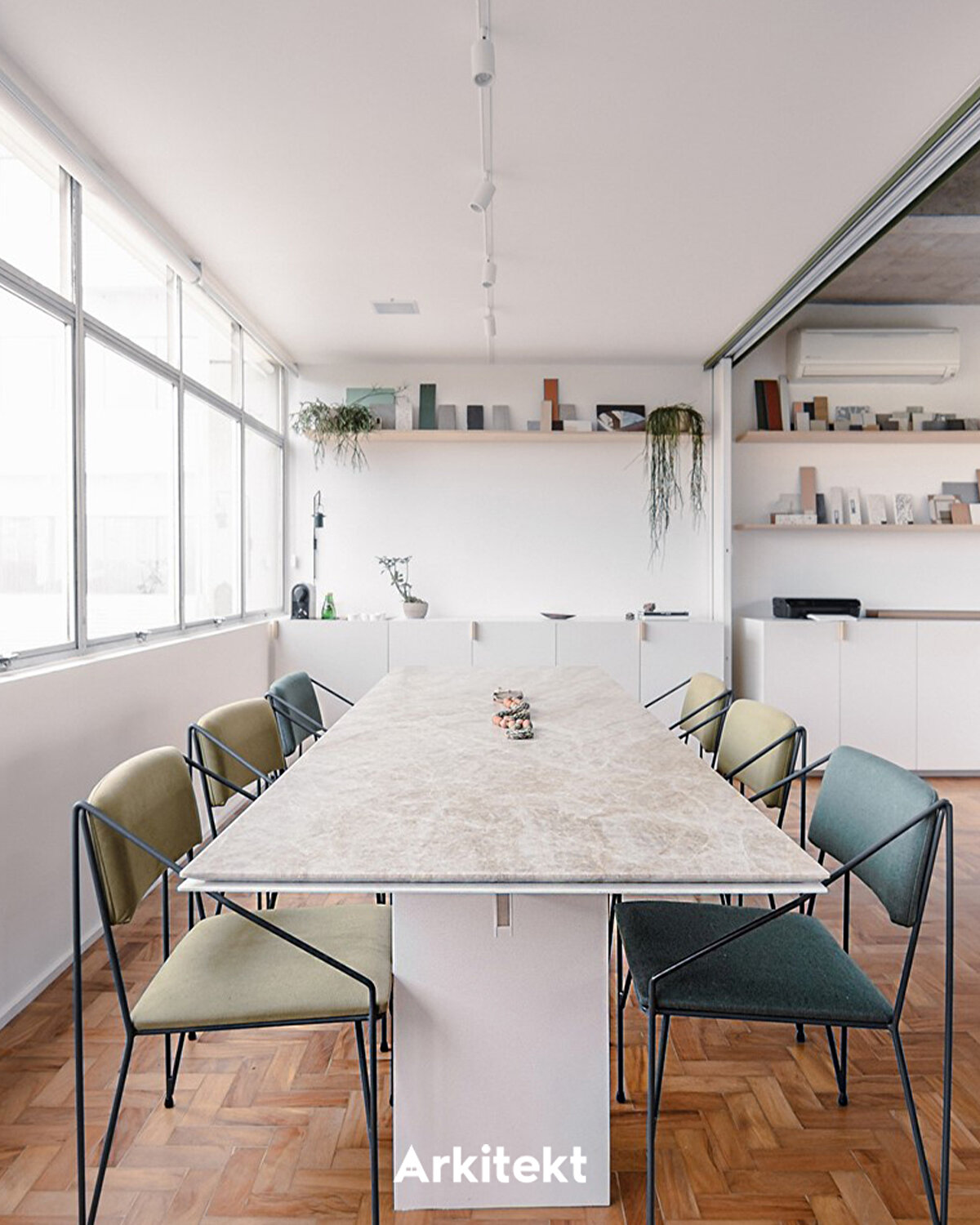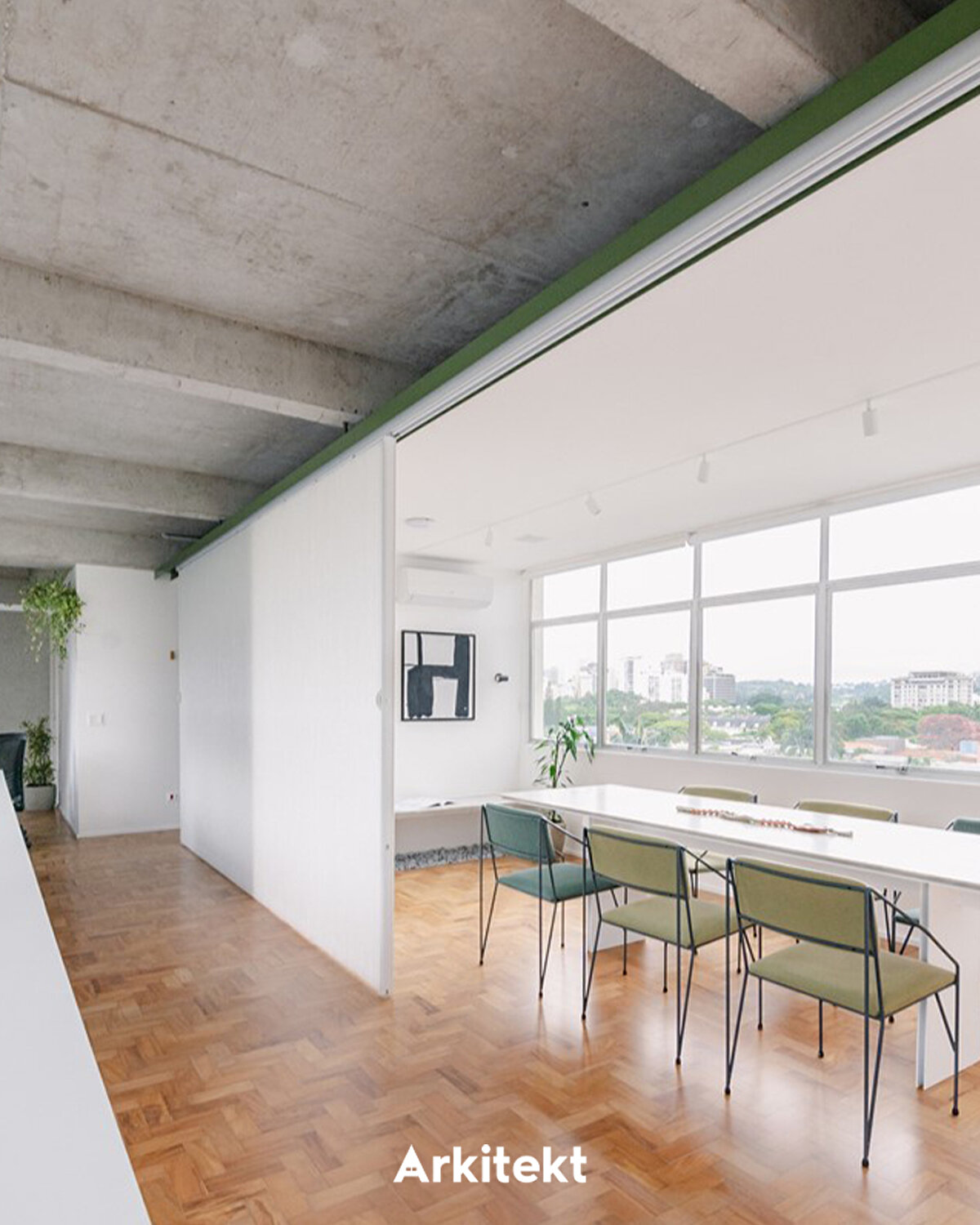 São Paulo'nun ünlü Faria Lima caddesinde bulunan ofis, şehrin tipik koşuşturması içinde, kreatif aktiviteyi desteklemeyi amaçlayan alanın bir öğesi olarak öne çıkıyor. Işıltı ve dengeli yapı ile karakterize edilen atmosfer, açık renk ahşap ve beyazın birleşimiyle saflık ve huzur sunuyor.. Dış bitki örtüsüyle etkileşim içinde, zaman zaman malzeme ve bitkilerde beliren yeşillik; çıplak betonla birlikte São Paulo mimarlık ofisinin simgesi haline geliyor.