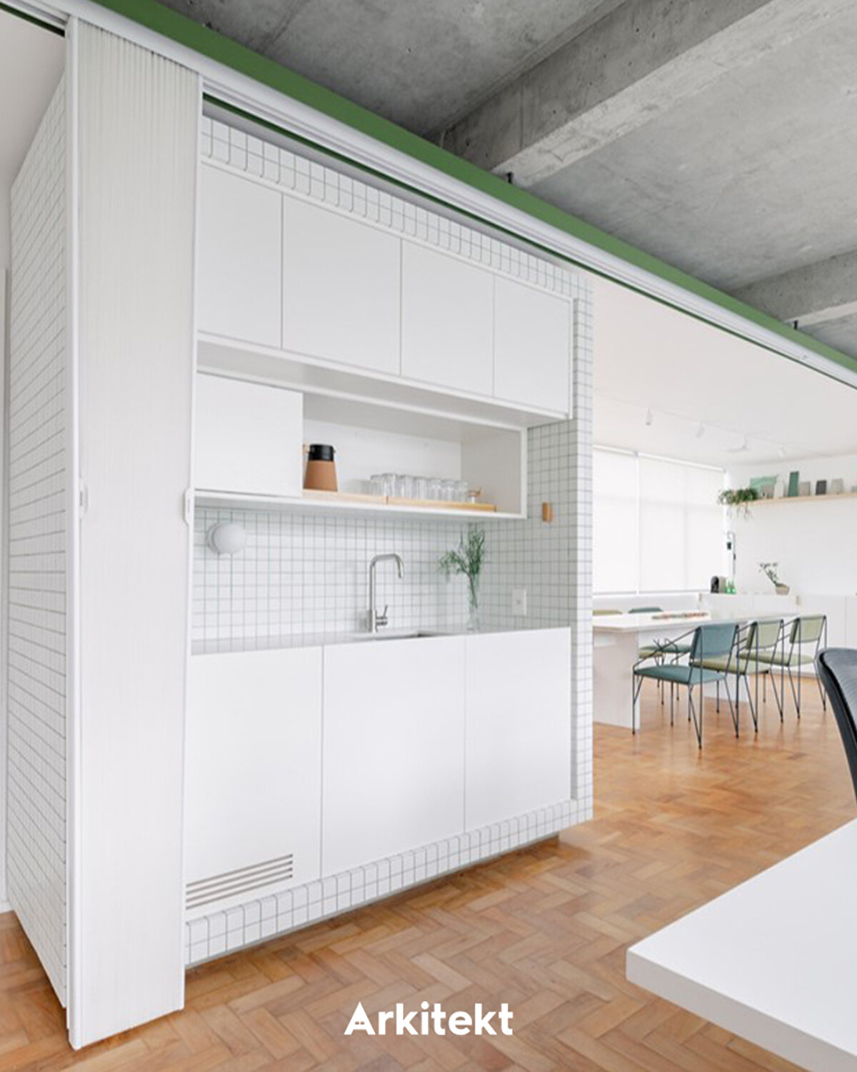 Kiler ortamı, başlangıçta aşırı derecede doğrusal bir formata sahip olan toplantı alanının orantısını düzeltmek amacıyla banyoların hidrolik duvarından yararlanılarak oluşturuluyor. Bu alan, çevreye bağlanan fayanslarla asılmış bir kutu şeklinde tasarlanıyor.