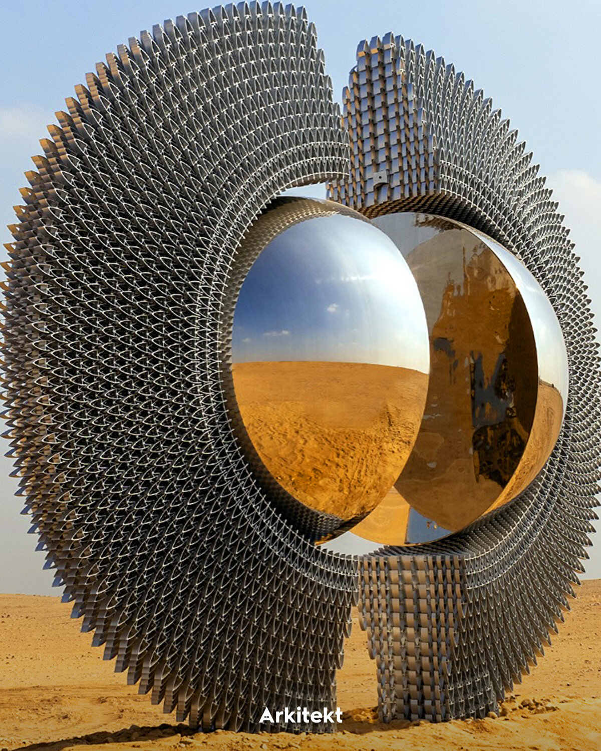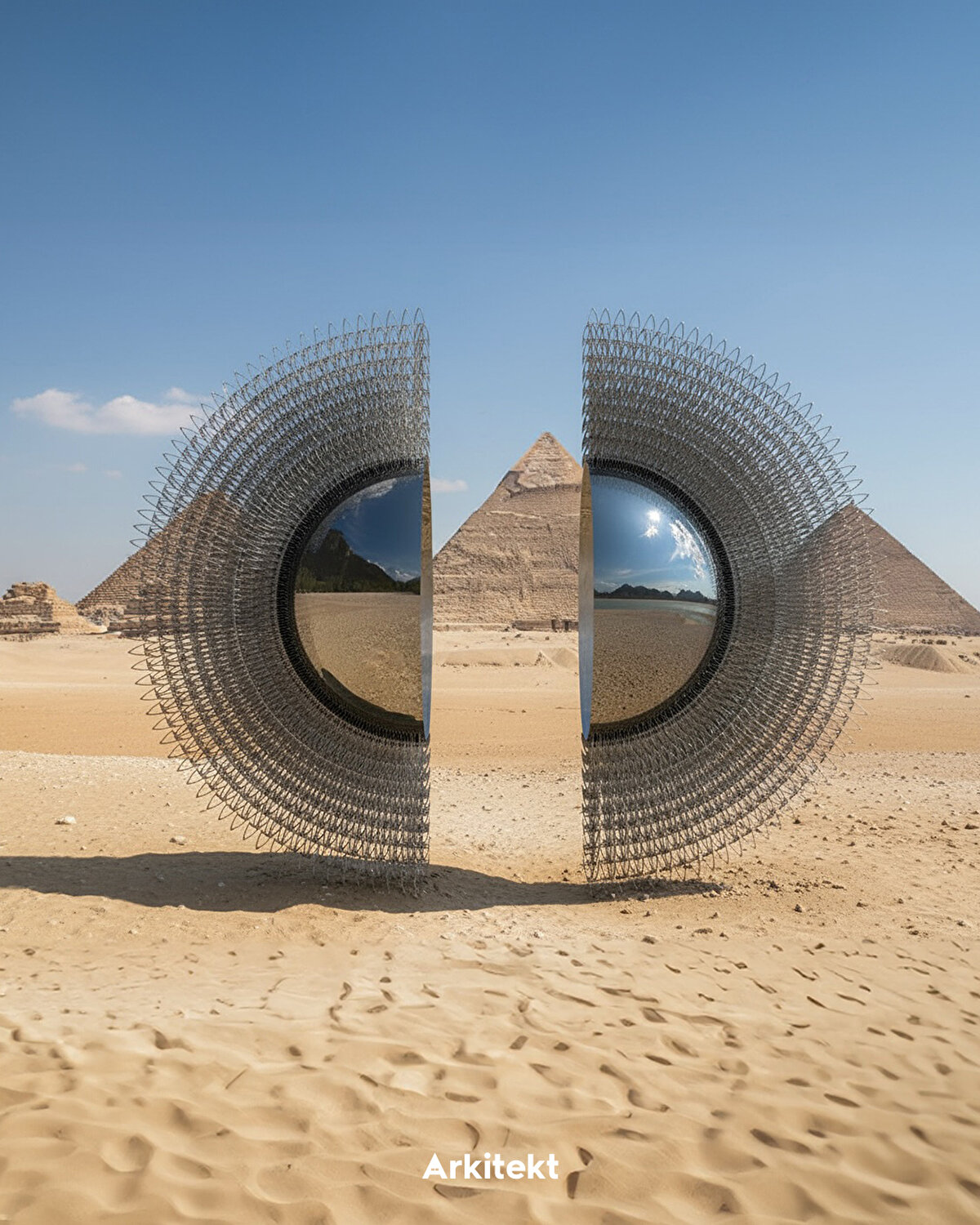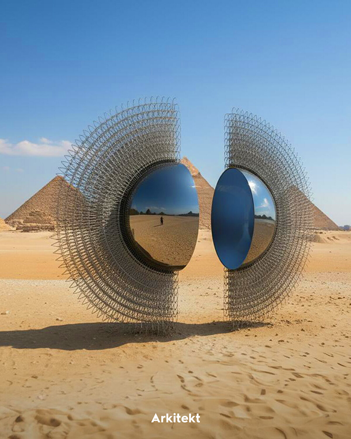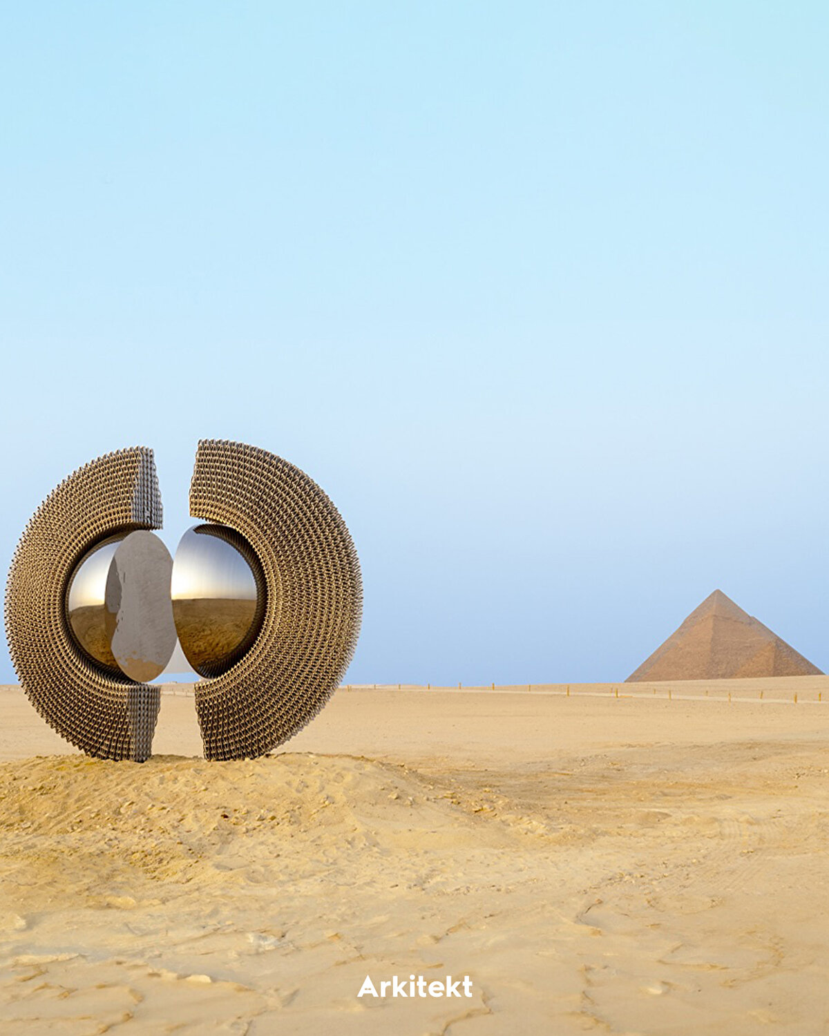 Sanatçı @mertegekose 'nin “The Shen" adlı çalışması, Art D'Égypte 2025 kapsamında Giza Piramitleri'nin önünde sergileniyor. Eser, @asassanat atölyelerinde alüminyumdan üretiliyor ve formunu Antik Mısır'ın sonsuzluk ve bütünlük sembolü Shen halkasından alıyor. @aycaokay 'ın küratöryel çerçevesi, yapının matematiksel oranları ve yansıtıcı yüzeyleri üzerinden insan–madde–çevre ilişkisini algısal bir deneyim hâline getiriyor. The Shen", bulunduğu arkeolojik peyzaj içinde ölçek, oran ve malzemenin etkileşimini görünür kılıyor; alüminyum yüzeyleri çevreyi ve izleyiciyi yansıtarak mekân ile izleyici arasında görsel bir diyalog oluşturuyor. - Artist @mertegekose's work titled “The Shen" is being exhibited in front of the Giza Pyramids as part of Art D'Égypte 2025. The work is produced from aluminum in the @asassanat workshops and takes its form from the Shen ring, a symbol of eternity and wholeness in Ancient Egypt. Within @aycaokay's curatorial framework, the sculpture's mathematical proportions and reflective surfaces transform the human–material–environment relationship into a perceptual experience. “The Shen" makes the interaction of scale, proportion, and material visible within its archaeological setting; its aluminum surfaces reflect both the surroundings and the viewer, creating a visual dialogue between the space and the audience.