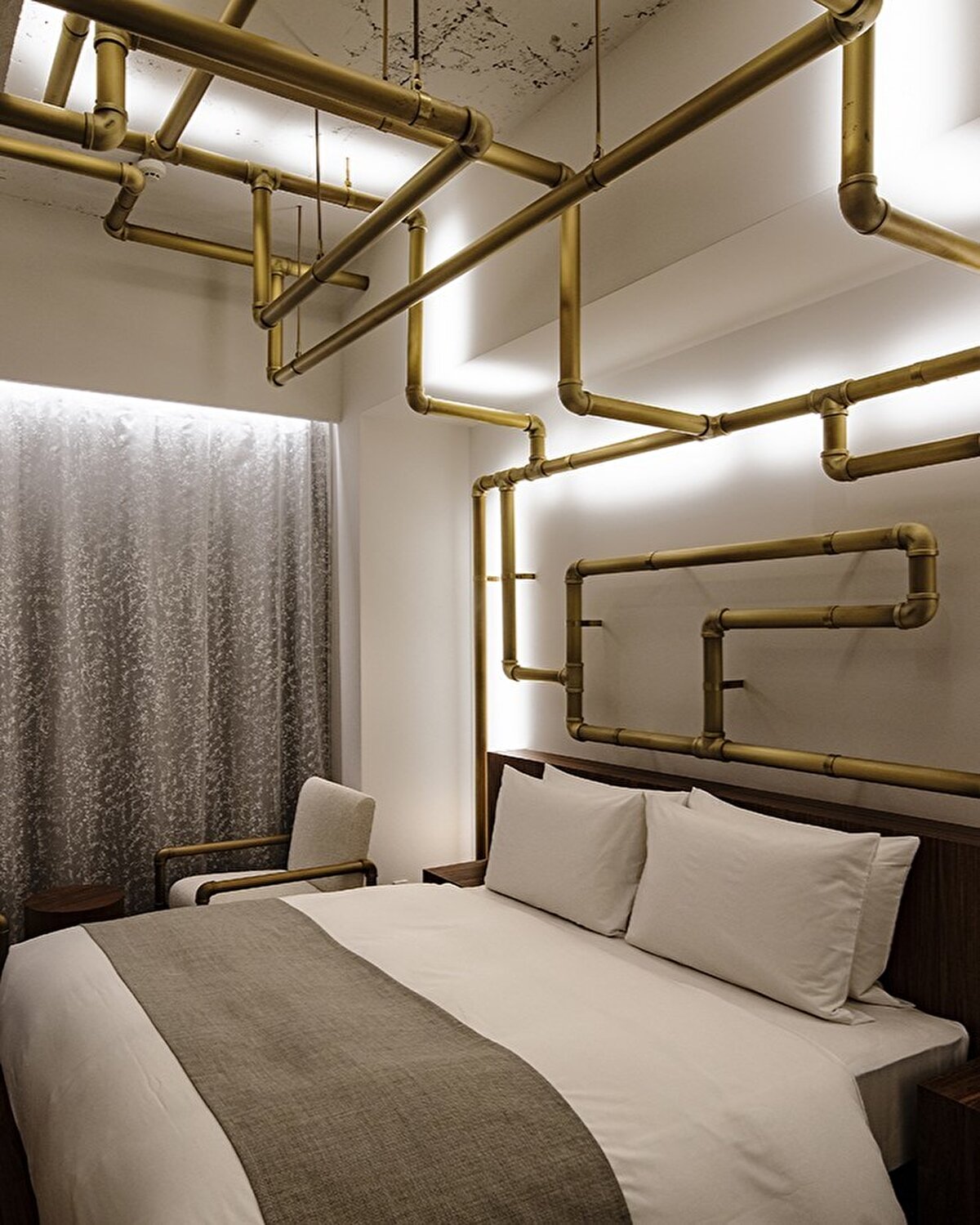 The renovated hotel, named “Heritage Tower", features reception, restaurant and relaxation areas on the lower level, and unique rooms on the upper floors by designers Jasper Morrison, Michele de Lucchi and Fujimoto. In addition, the large atrium is adorned with Leandro Erlich's Lighting Pipes installation. While Fujimoto's room stands out with its furniture integrated with plants, Erlich's room features a different interpretation of the artwork.