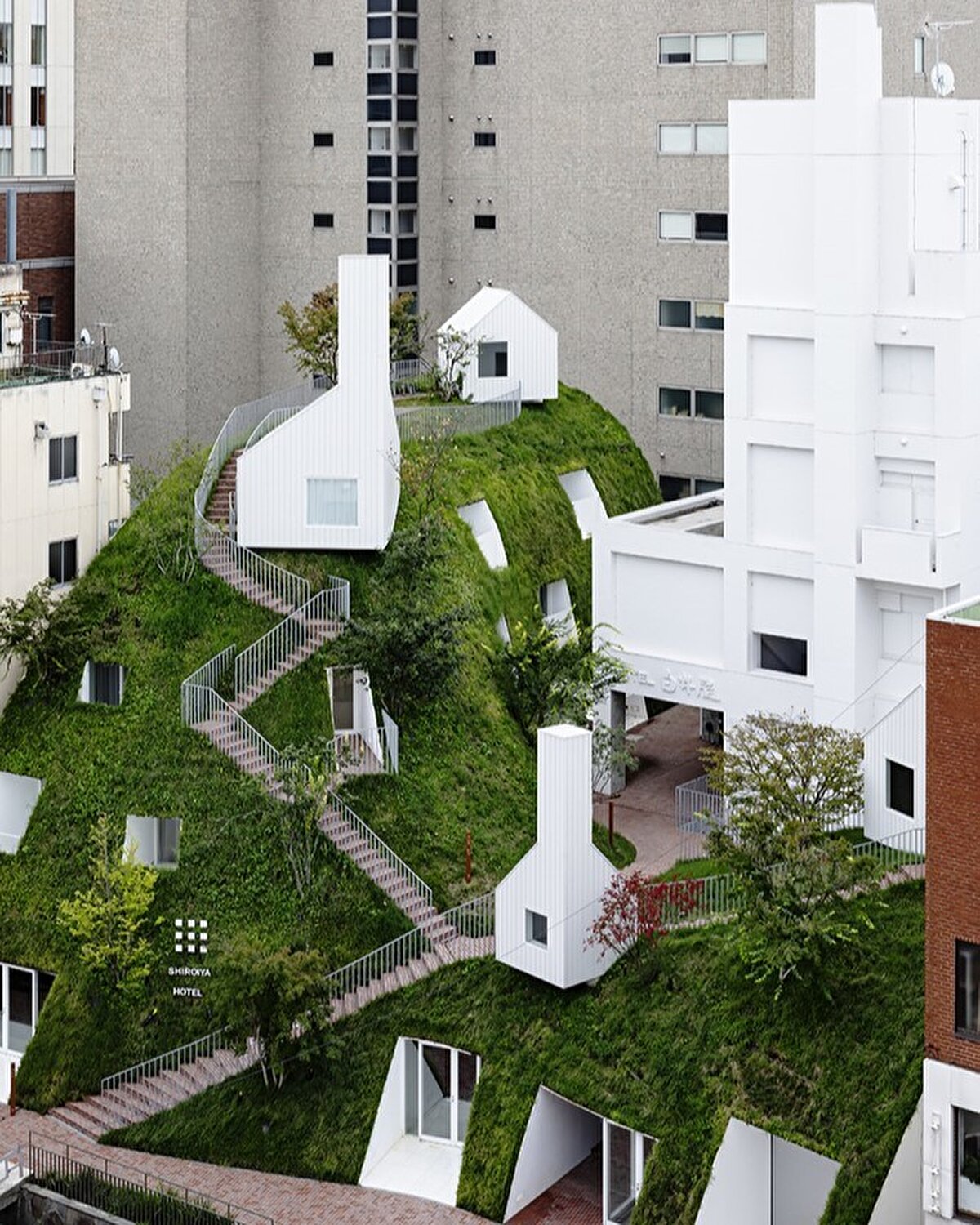 Sou Fujimoto Architects, Japonya'nın Maebashi kentindeki 1970'lerden kalma Shiroiya Oteli'ni yenileyerek çarpıcı bir dönüşüm gerçekleştirdi. Orijinal binanın iç katları kaldırılıyor ve yerine, kabinlerin bulunduğu çimenli bir tepe ve geniş bir merkezi atriyum ekleniyor.