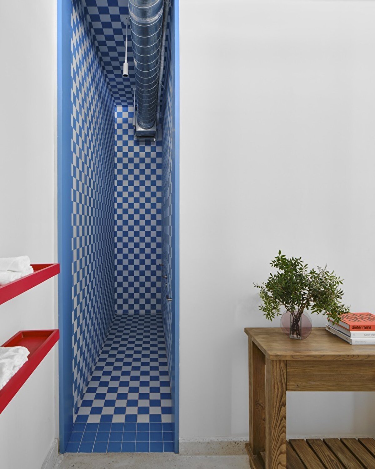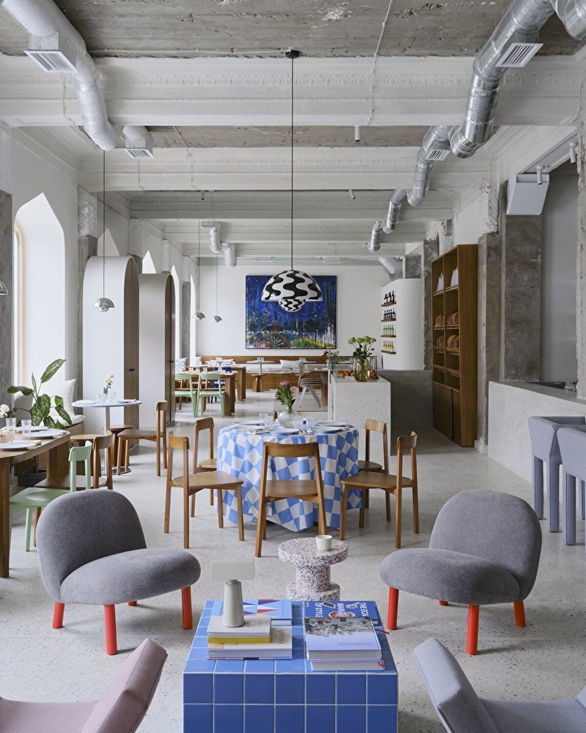 Mekanda, açık gri terrazzo, beyaz duvarlar ve çıplak beton gibi doğal malzemeler kullanılırken, sedir ağacı ve renkli detaylarla sıcak bir atmosfer oluşturuluyor. Yerel zanaatkarlar tarafından üretilen mobilyalar ve Kazak yurtlarından ilham alan döşemeli sandalyeler, mekana özgün bir karakter katıyor.