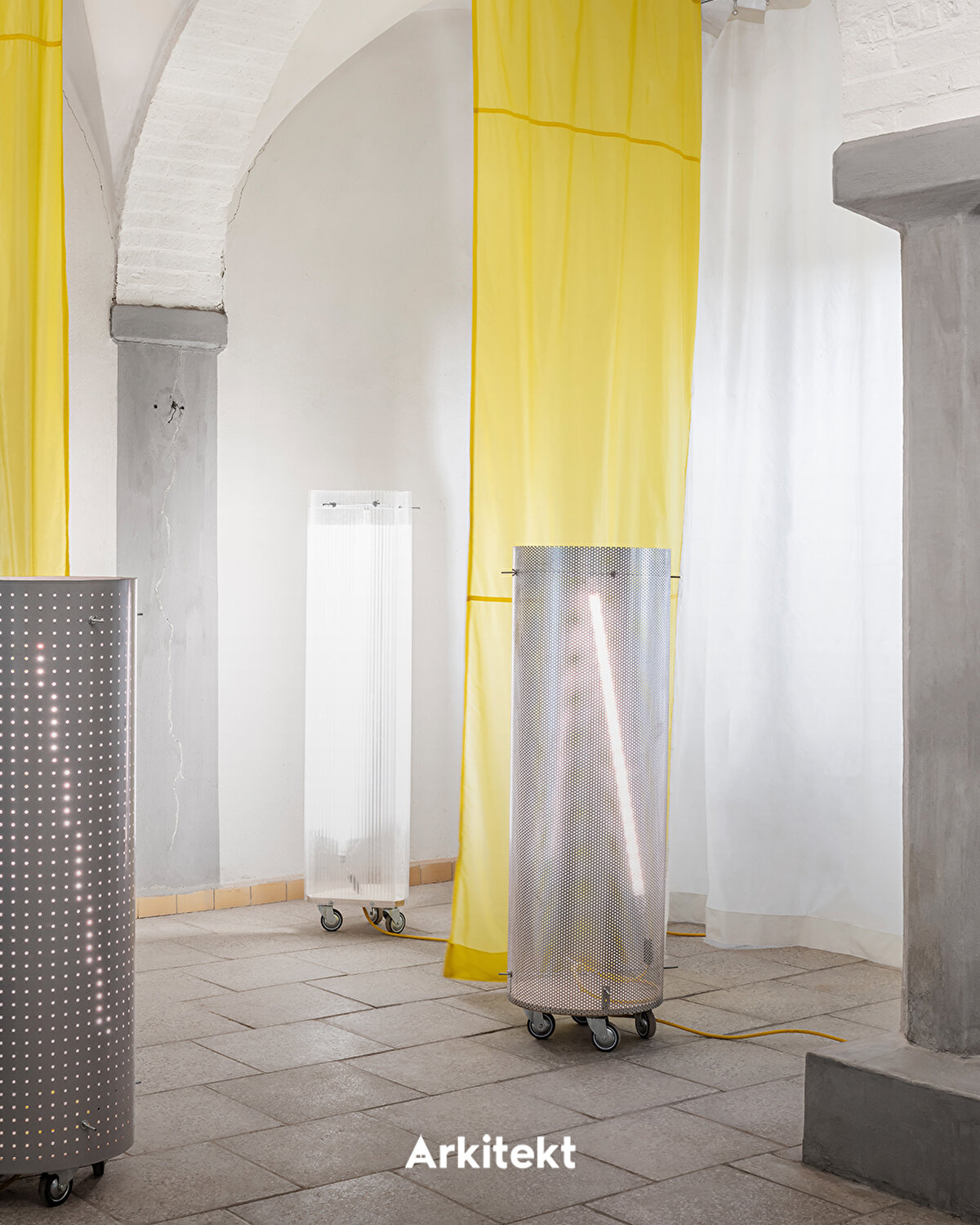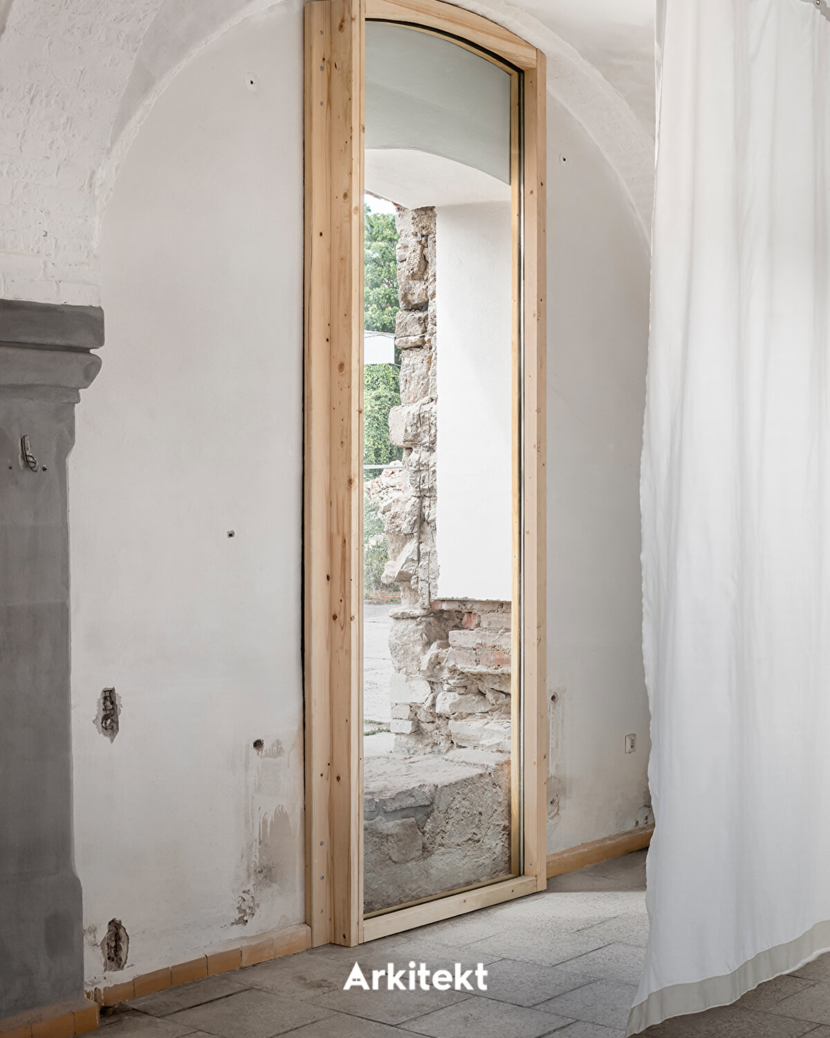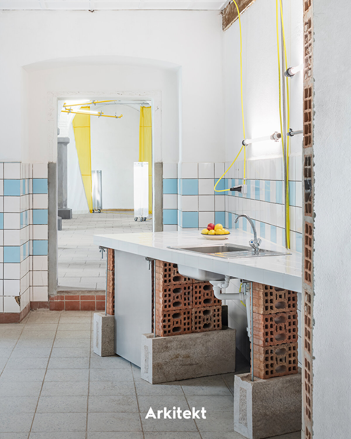 Rather than making major interventions to the existing structure, the students opted for prototypical, reversible, temporary, and fragmented interventions. They repurposed old sinks at various points in the building, used bricks salvaged from wall openings to seal an old doorway, and gave new life to old heating pipes as kitchen furniture and cable conduits. The existing structure was complemented by windows created from waste glass, curtains made from used sailcloth, and a canopy constructed from recycled garage doors.