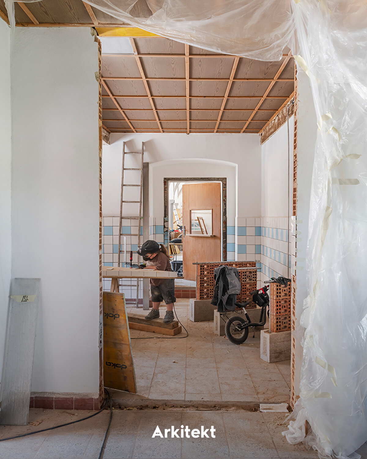 The students documented the existing condition down to the smallest detail—from peeling plaster to a crooked radiator. Furthermore, they cataloged materials found on-site one by one, testing their properties on improvised and experimental small-scale structures. This process enabled them to both grasp the tectonics of the existing building and "intuitively" recognize the potential inherent in the materials at hand.