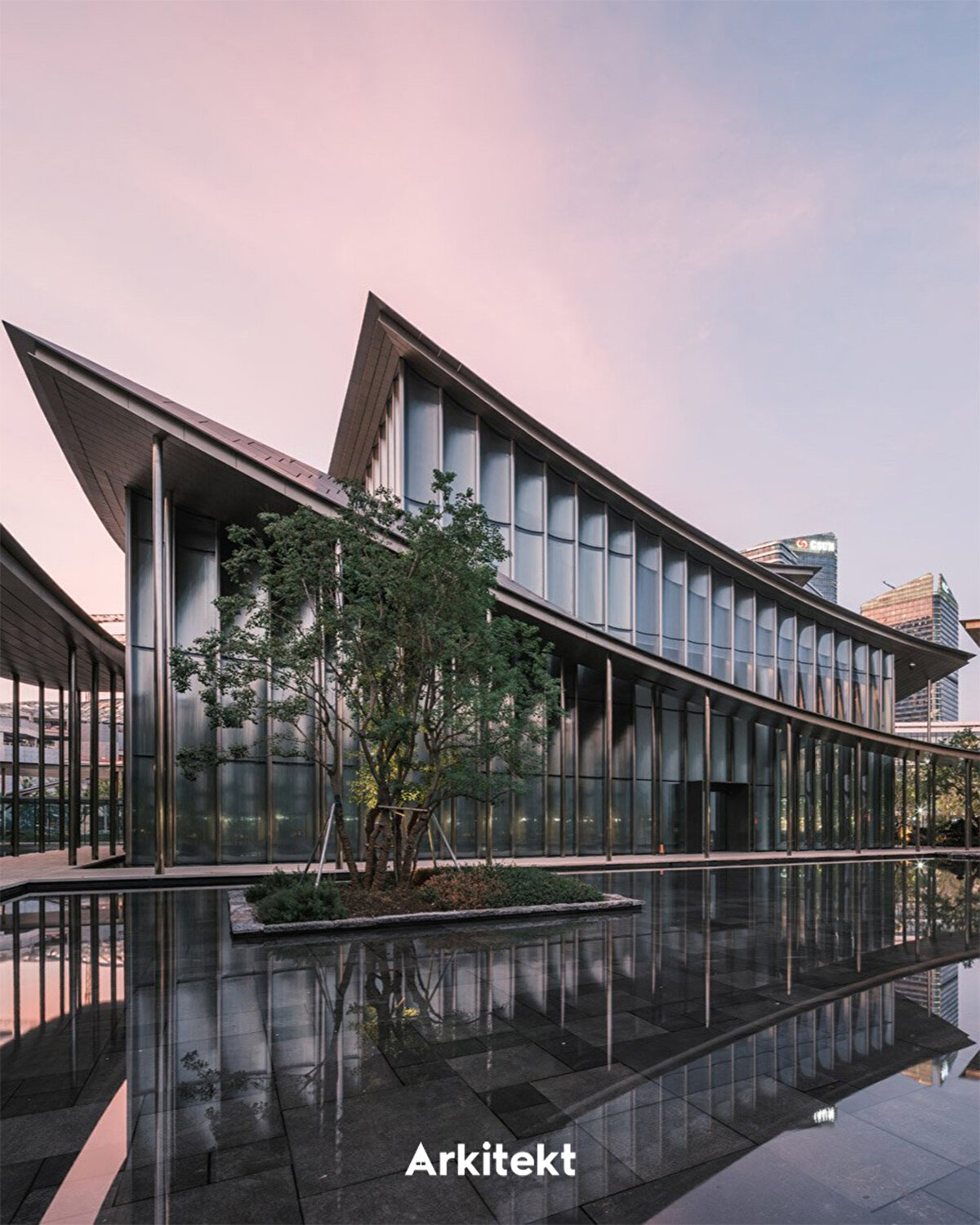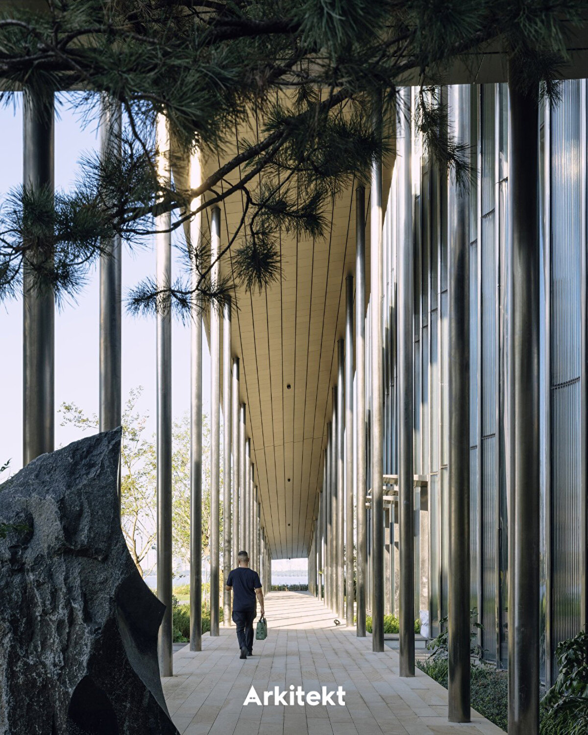 Four large pavilions house the main galleries, while the other pavilions accommodate the entrance hall, a multipurpose hall, a theater, and a restaurant. The facades of the pavilions are clad in rippled and curved glass with warm-toned stainless steel. On the other side of the museum, the Suzhou Ferris Wheel along the Jinji Lake waterfront offers visitors the opportunity to view the museum from above.