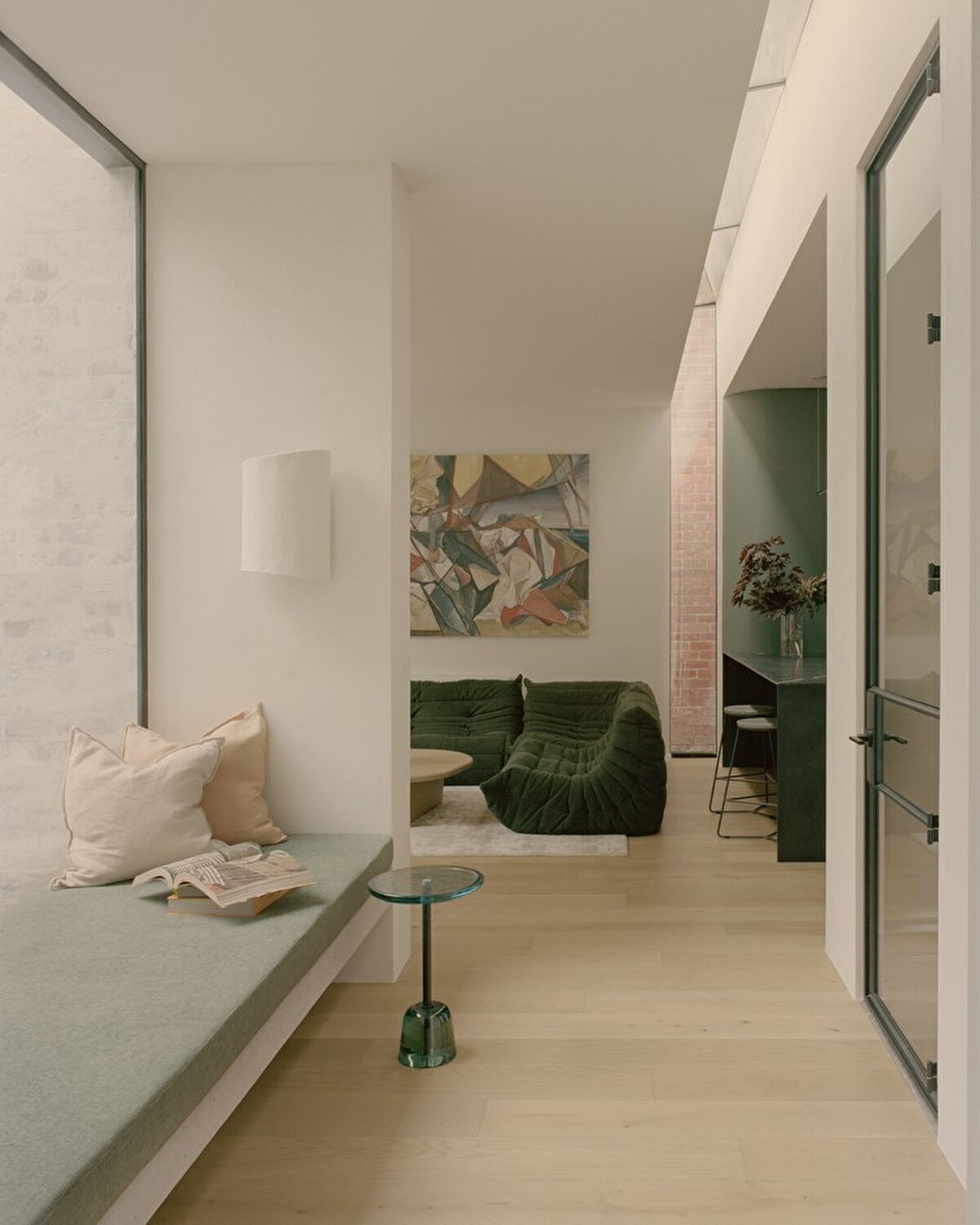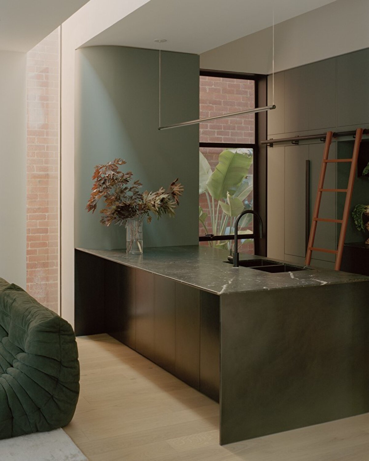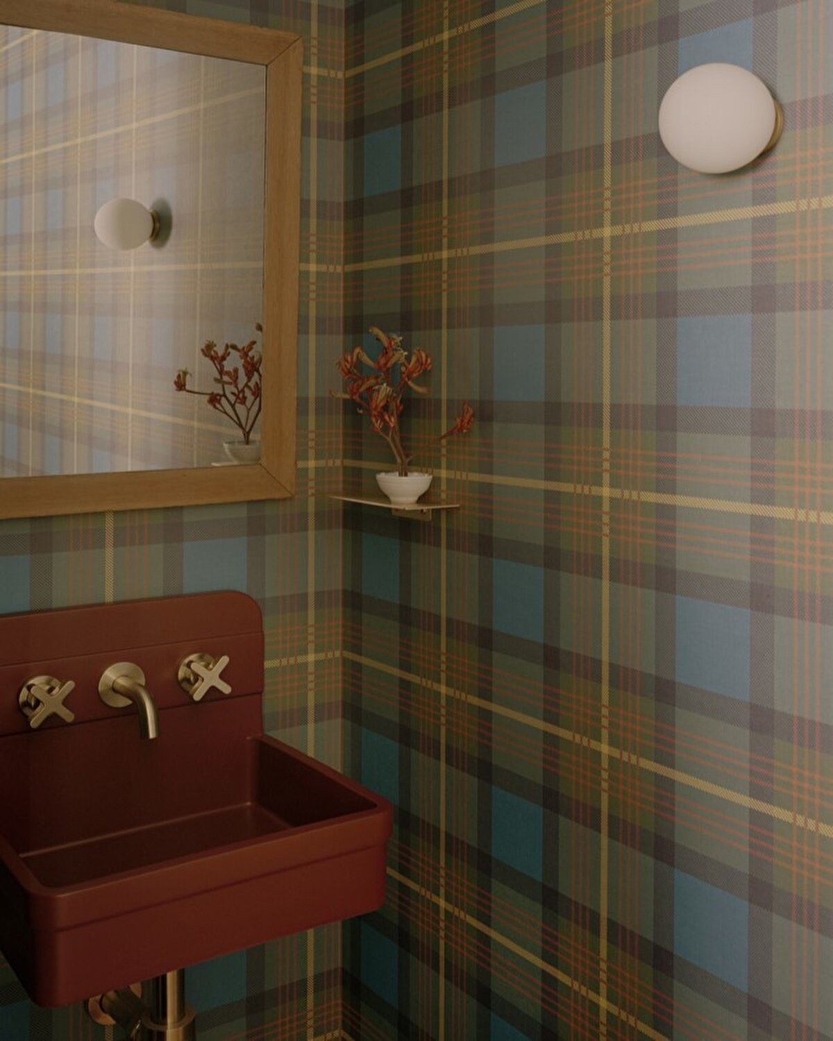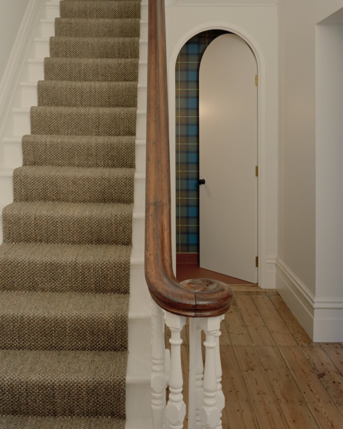 Yeniden düzenlenen iç mekânda, mutfakta el ile patine edilmiş siyah çelik dolaplar ve turuncu iç detaylar kullanılıyor, küçük bir misafir tuvaletinde İskoç kökenini yansıtan ekose duvar kâğıdı tercih ediliyor.