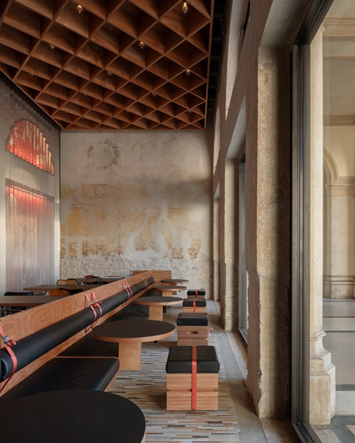 Ana salonda, çok katmanlı ahşaptan yapılmış kasetli bir tavan ve çok renkli mozaik bir zemin bulunuyor. Mobilyalar, AMAA ve Nero/Alessandro Neretti iş birliğiyle özel olarak tasarlanmış olup, New York metro bankları ve Donald Judd'ın işleri referans alınarak geliştiriliyor.