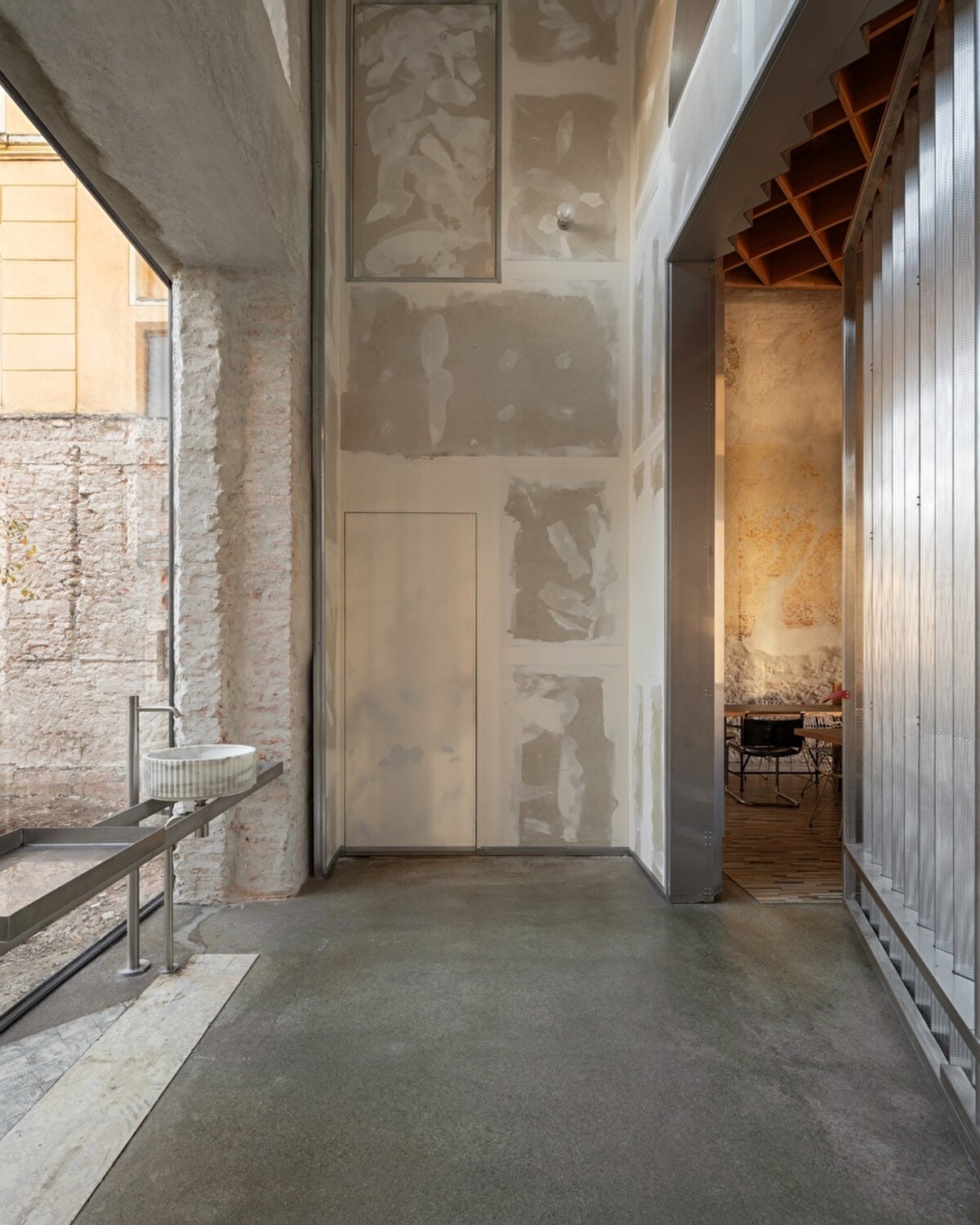 Yapının ana girişi, meydan cephesinde yer alıyor. Girişin solunda açık mutfak ve bar alanı bulunuyor. Barın arkasındaki merdiven, üst kattaki restoran bölümüne ulaşımı sağlıyor. Sağ tarafta ise ana salon yer alıyor. Bu salon, çeşitli tarihi müdahalelerin izlerini taşıyor ve katlanmış, delikli paslanmaz çelikten yapılmış bir duvarla bölünüyor. Bu duvar, iç mekânda yarı saydam bir perde etkisi oluşturuyor ve arkasındaki büyük kemerleri kısmen görünür kılıyor. Duvarın arkasında, iç avluya açılan bir geçiş alanı bulunuyor. Bu avlu, huş ağaçlarıyla donatılmış bir bahçe olarak tasarlanıyor.