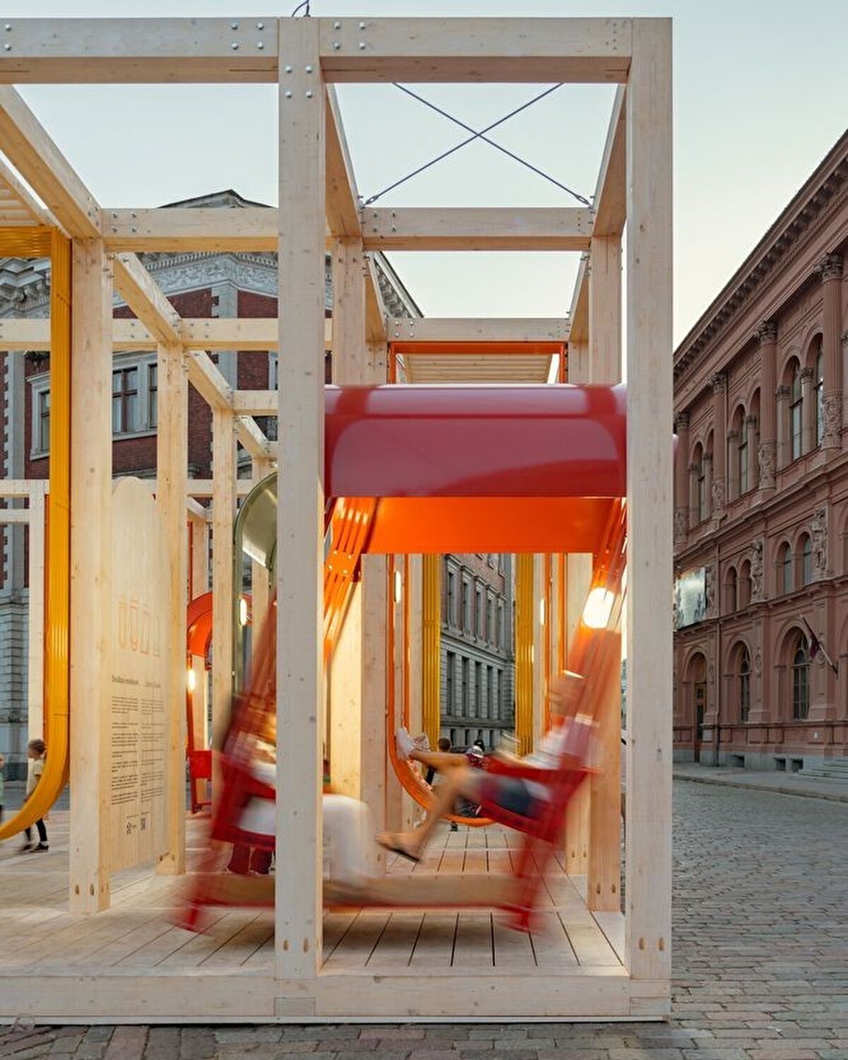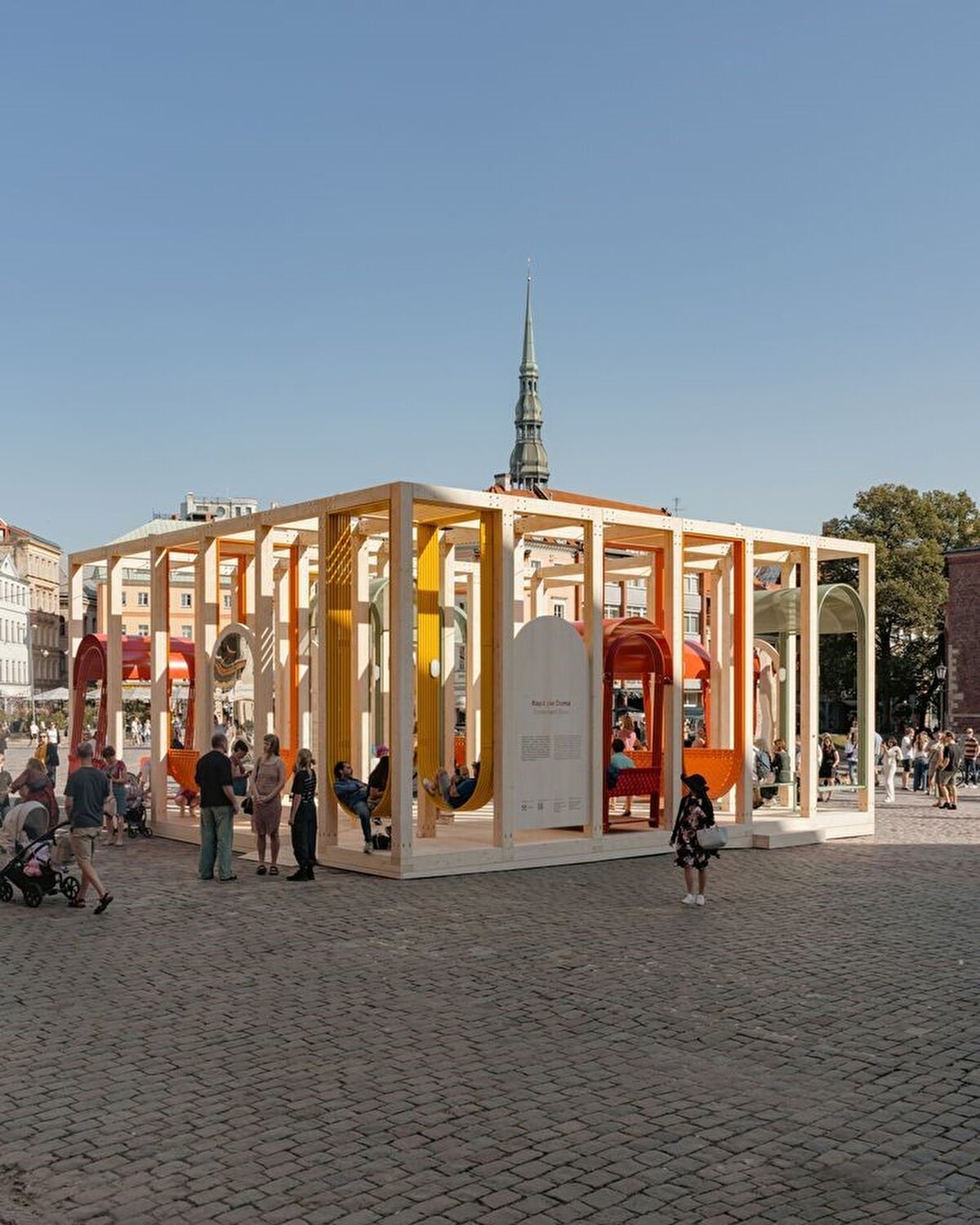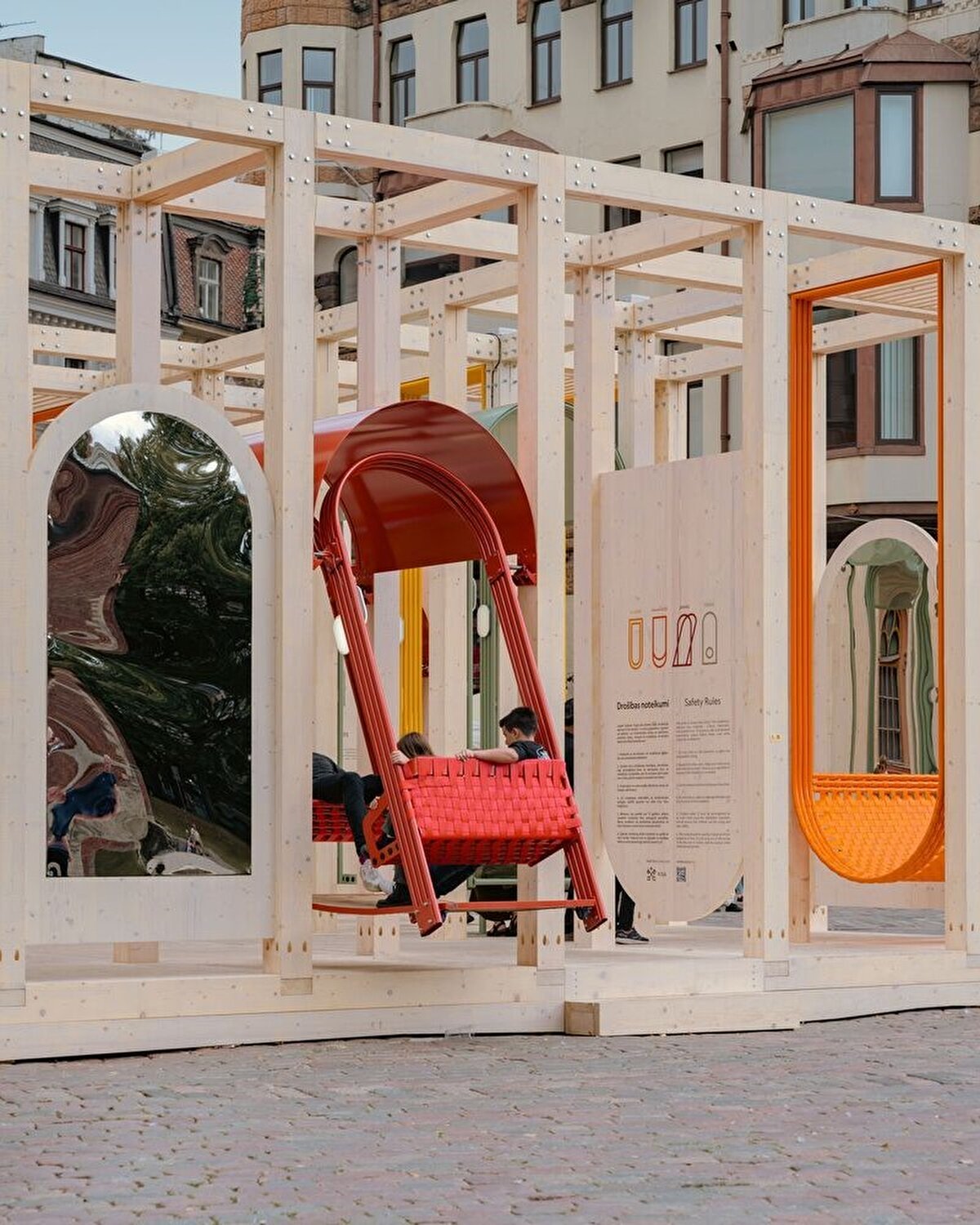 Inspired by Riga's architectural heritage, this interactive experience recreated the geometric elements of the medieval vaults and Dome Cathedral with a contemporary perspective. Visitors could relax in a hammock, enjoy a relaxing picnic, meet their loved ones, play with the reflections in the mirrors, and sway with a view of the church. This space, where old and new meet, invites everyone to relax, interact and let their imagination run wild.