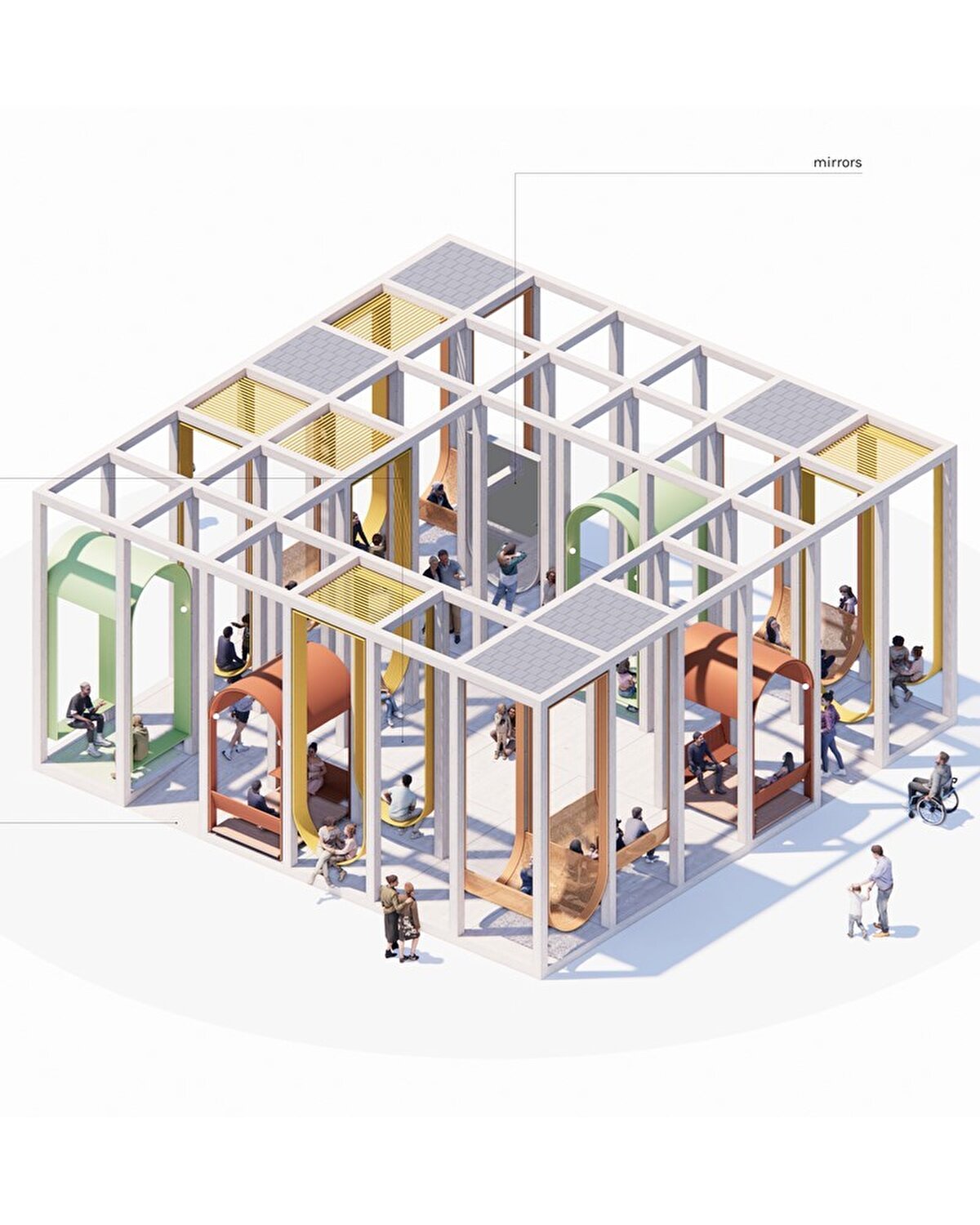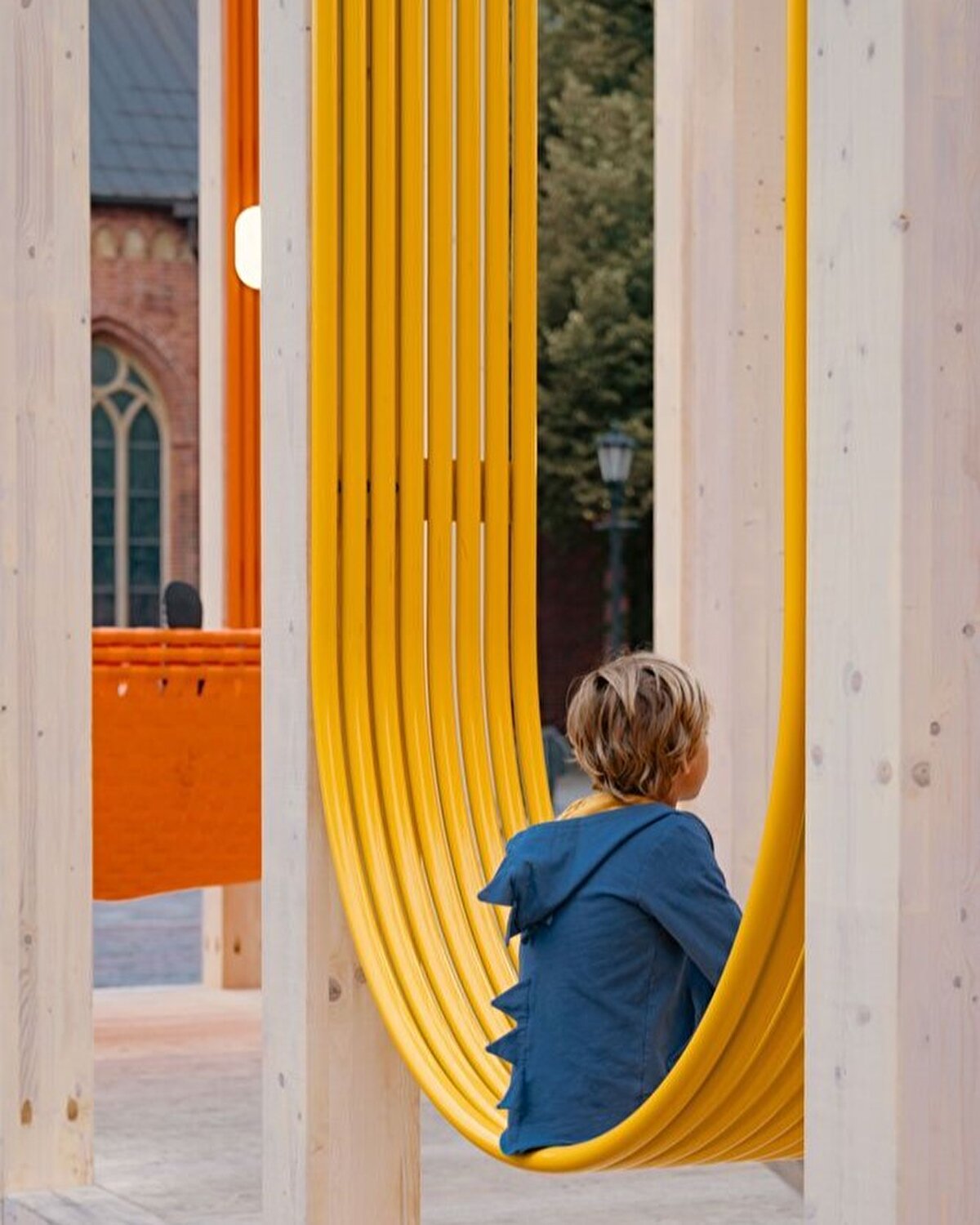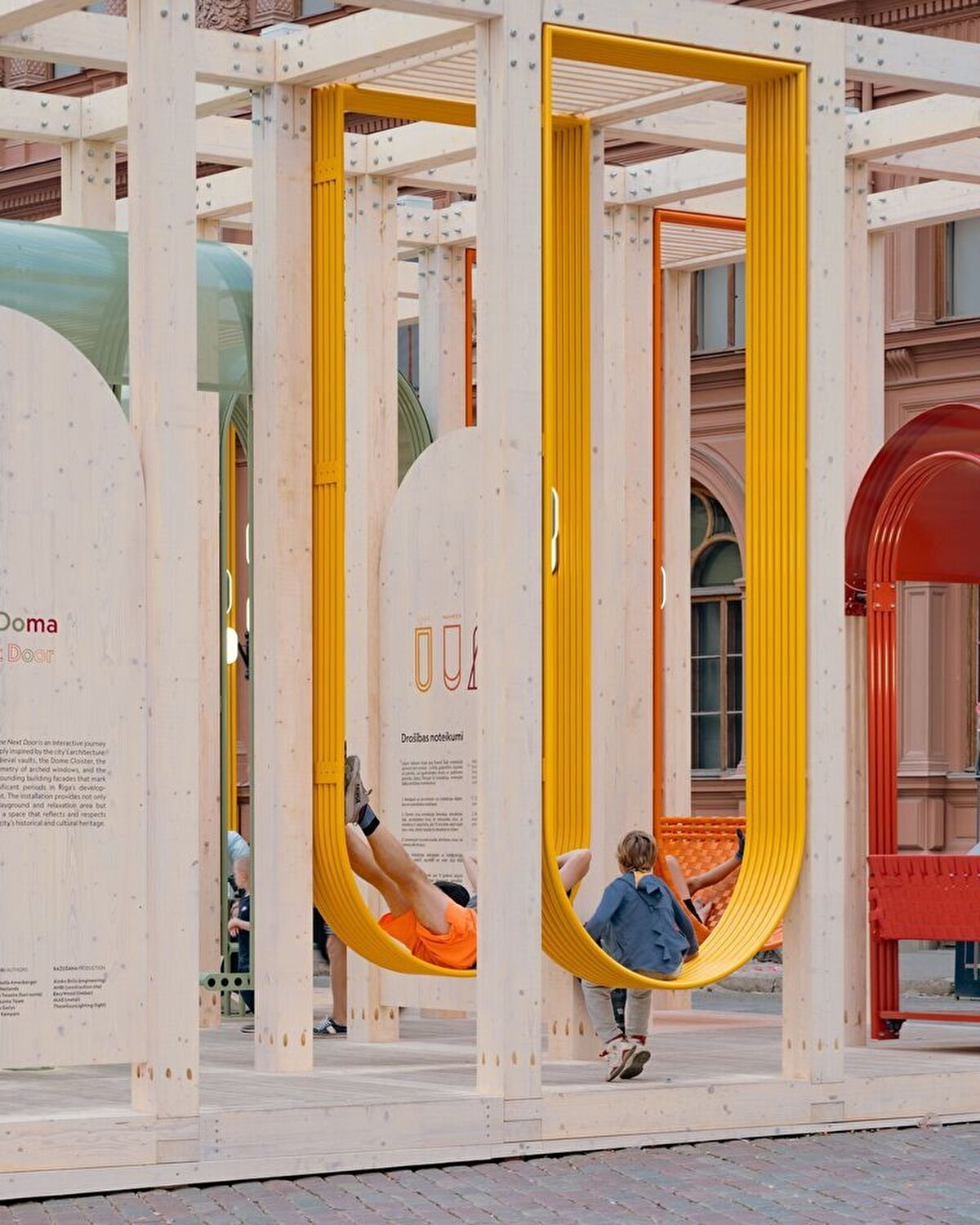 Inspired by Riga's architectural heritage, this interactive experience recreated the geometric elements of the medieval vaults and Dome Cathedral with a contemporary perspective. Visitors could relax in a hammock, enjoy a relaxing picnic, meet their loved ones, play with the reflections in the mirrors, and sway with a view of the church. This space, where old and new meet, invites everyone to relax, interact and let their imagination run wild.