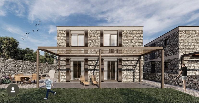 Her bir ev, yöreden çıkan doğal taş cephe kaplaması ile öne çıkıyor. Bu taş kaplama, kat silmeleriyle bölünerek kütlenin taşıdığı yataylık hissi kuvvetlendiriliyor. Silmeler arasında, boydan boya açılmış, alüminyum doğrama ve kepenkli pencereler, iç ve dış mekan arasında zengin bir ilişki kurulmasını sağlıyor. Evlerin önüne eklenen ve ön cephe boyunca devam eden çelik taşıyıcılı, saz üst örtülü pergolalar, dış mekan kullanımını kolaylaştırıyor. Bahçede yer alan köy tipi fırın ve açık mutfak tezgahıysa, bu kullanımı daha da zenginleştiriyor.