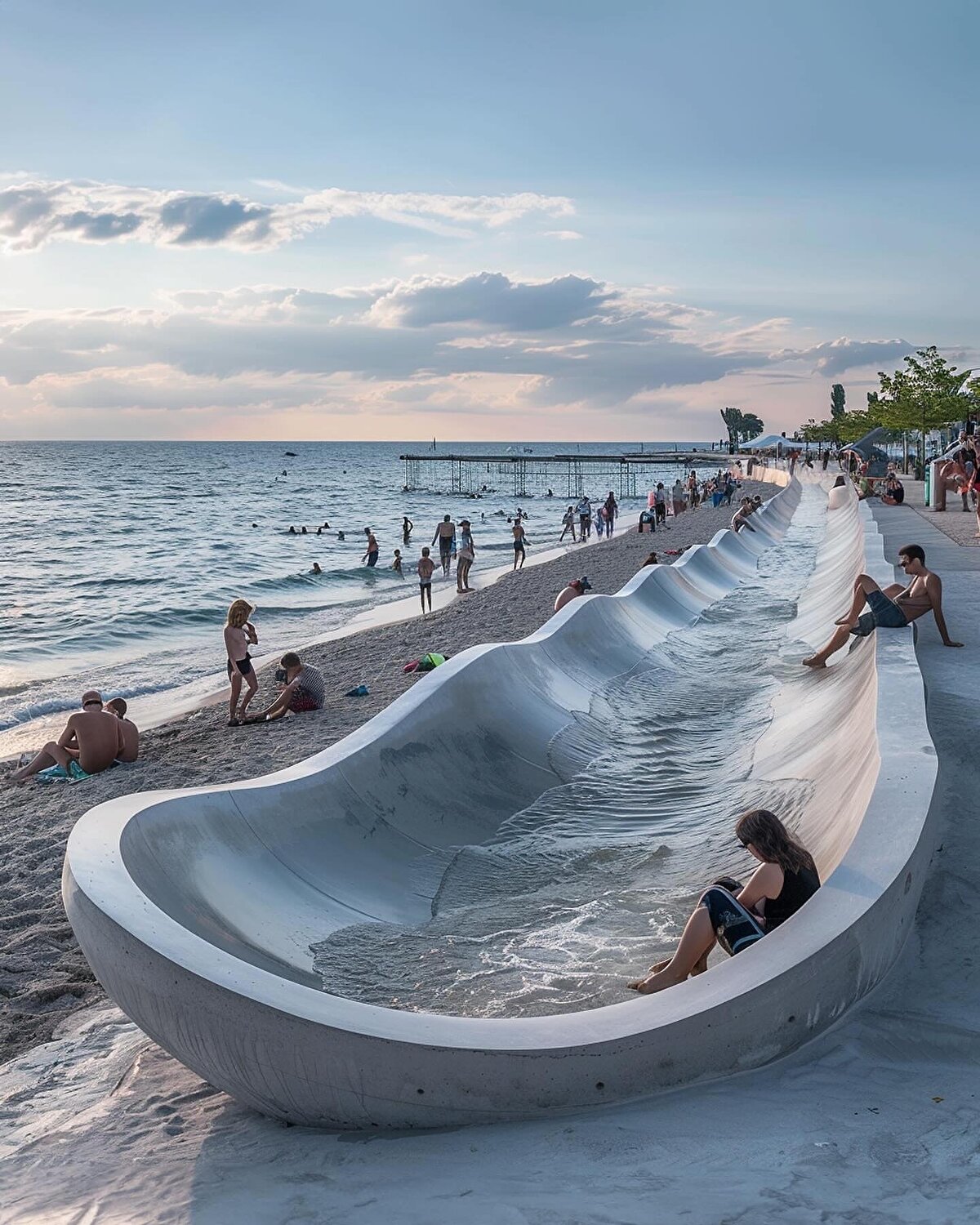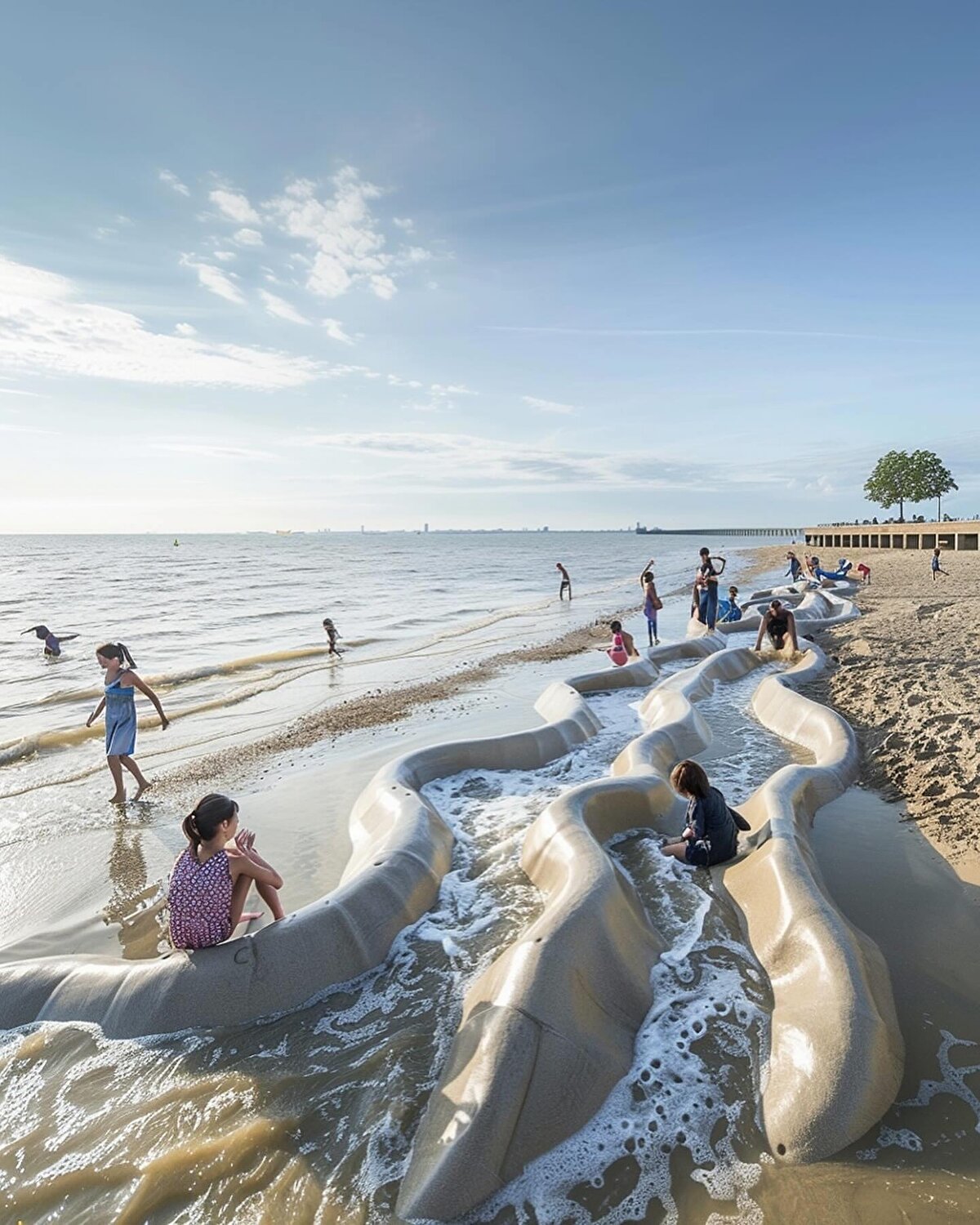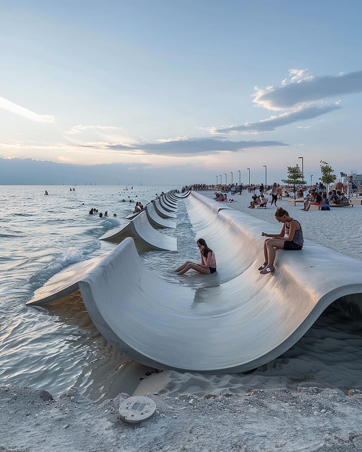 Yapay zeka ve dijital modelleme süreçleri, kıyı mekânlarının tasarımında da yeni formlar ve kullanımlar öneriyor. Blazquez'in dalga formunda tasarladığı yüzeyler, kıyı şeridinin doğal akışına uyum sağlarken, suyla etkileşim kurmaya yönelik bir mekânsal düzen sunuyor. Sert sınırları yumuşatan formlar, hem oturma hem de dinlenme alanı olarak işlev görüyor. @carlosbannon