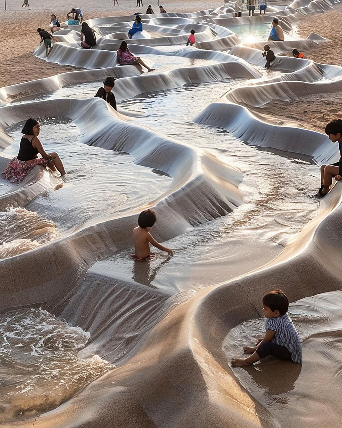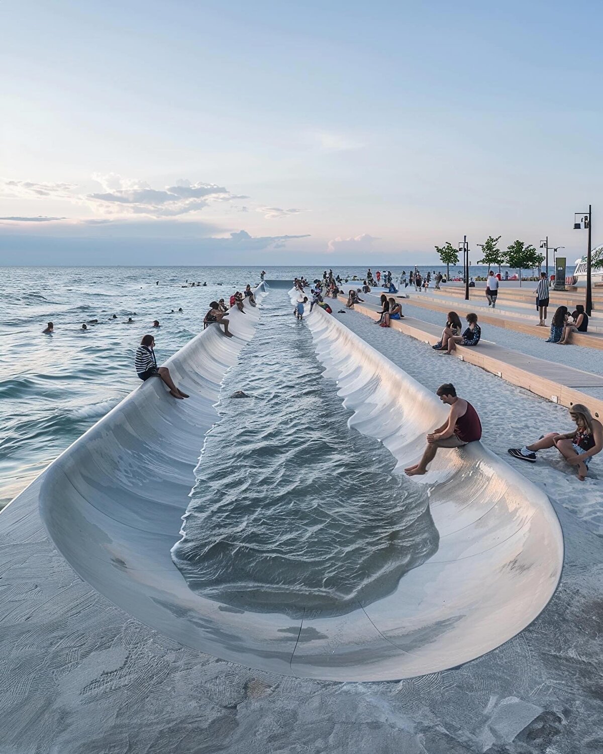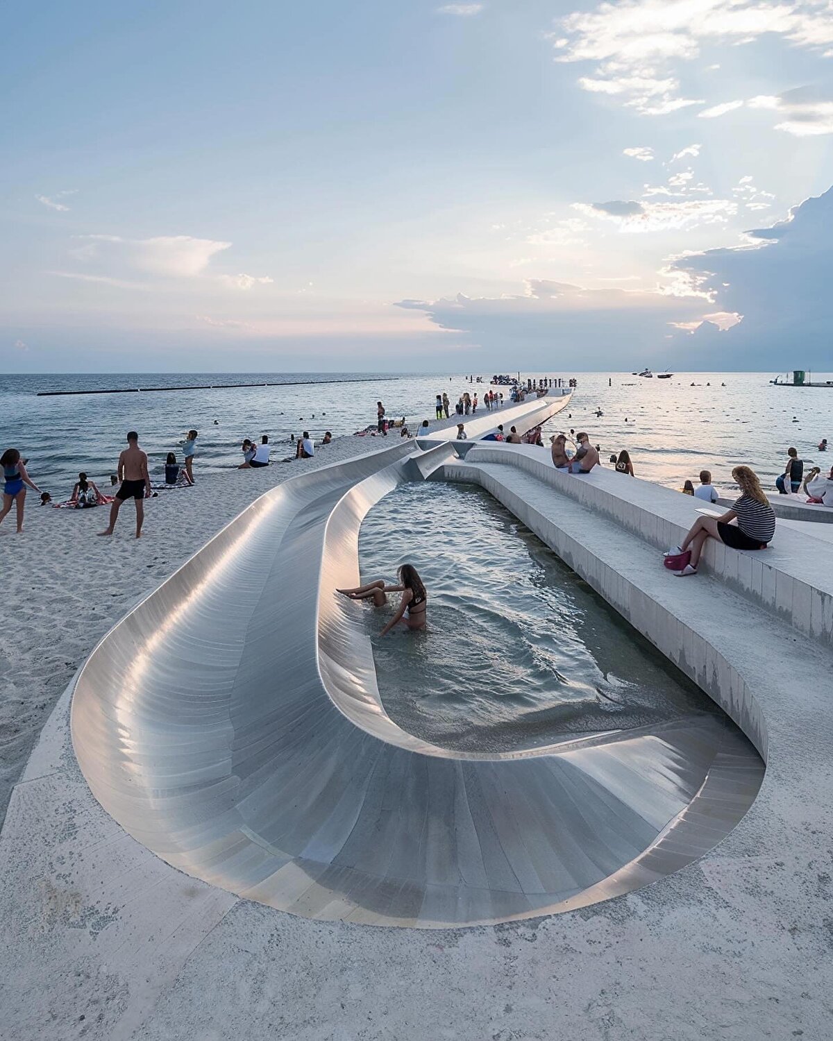 Yapay zeka ve dijital modelleme süreçleri, kıyı mekânlarının tasarımında da yeni formlar ve kullanımlar öneriyor. Blazquez'in dalga formunda tasarladığı yüzeyler, kıyı şeridinin doğal akışına uyum sağlarken, suyla etkileşim kurmaya yönelik bir mekânsal düzen sunuyor. Sert sınırları yumuşatan formlar, hem oturma hem de dinlenme alanı olarak işlev görüyor. @carlosbannon