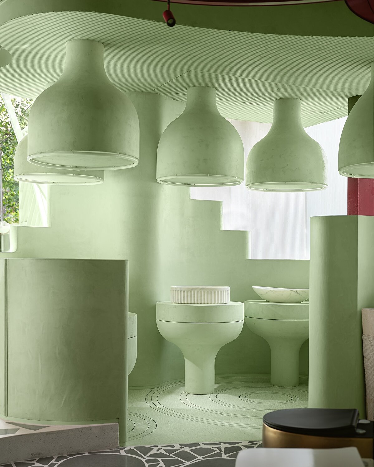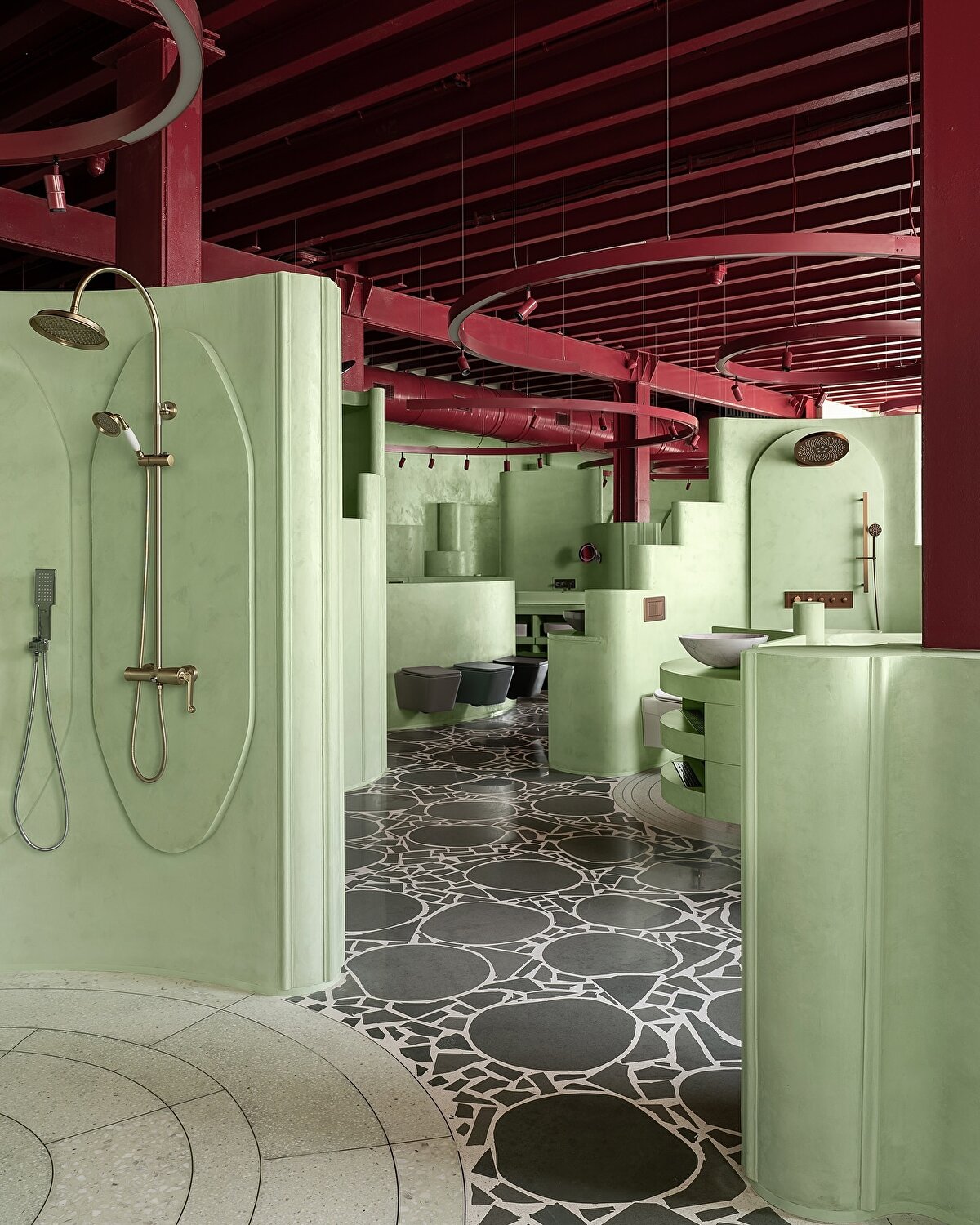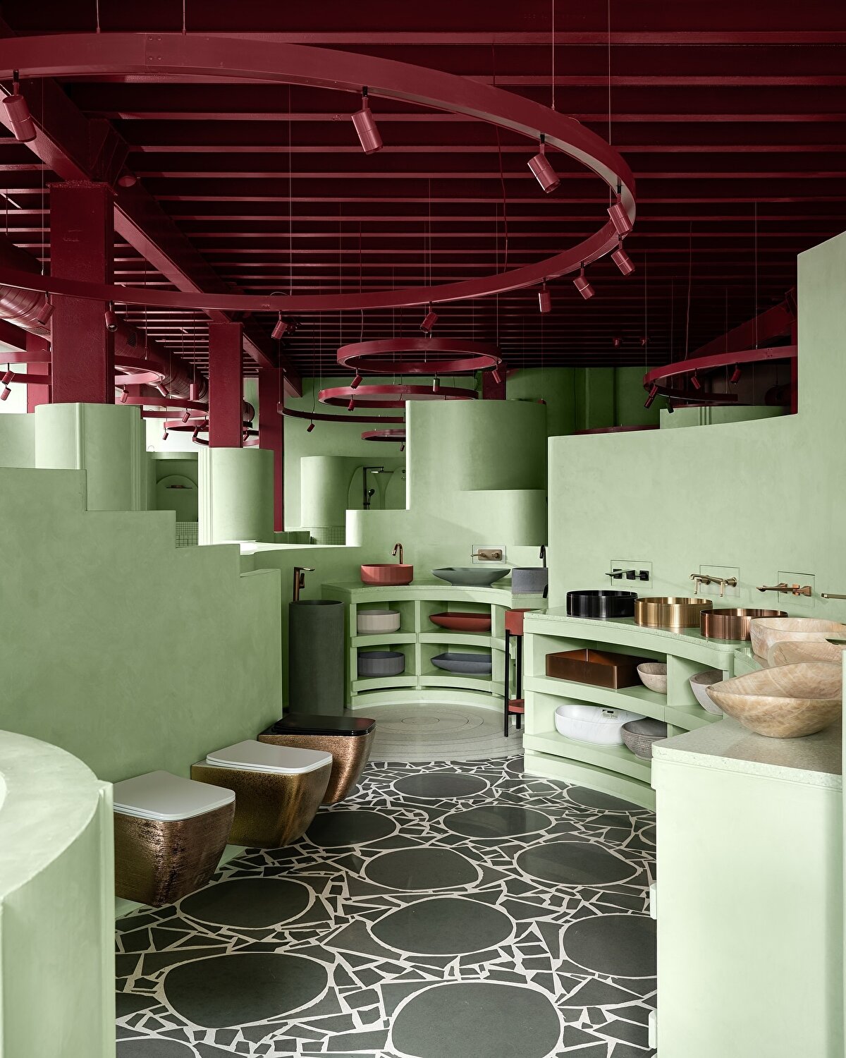 Overlapping circular display units propose a rhythmic circulation, overcoming static exhibition methods. The stone flooring, enriched with different textures, reinforces the horizontal continuity of the space, while the ring-shaped lighting on the ceiling displays the structural elements with a conscious openness. MuseLAB's design approach transforms the showroom into a fiction that encourages spatial exploration rather than a mere display space. @aquant.global