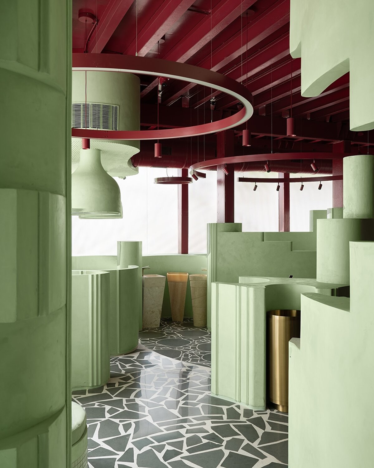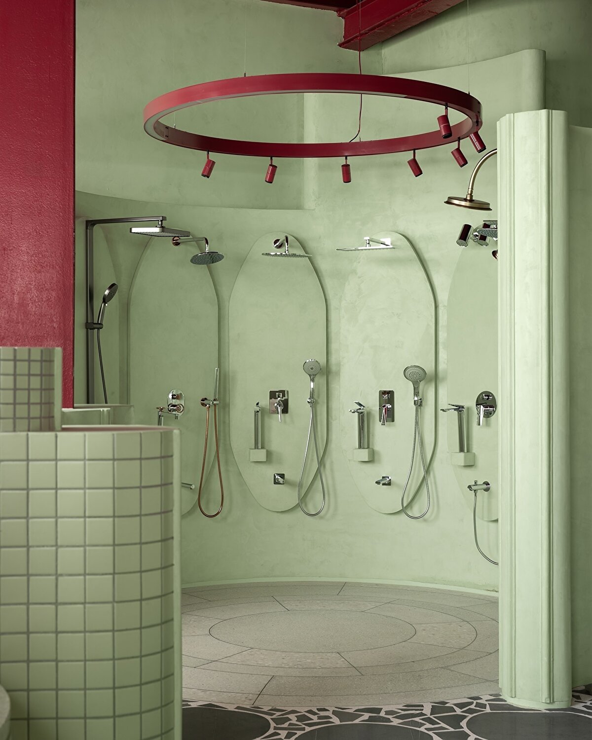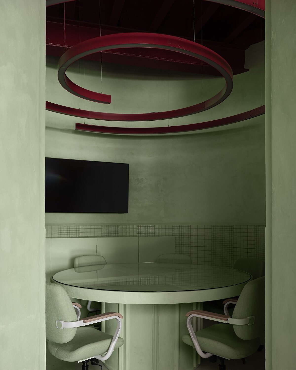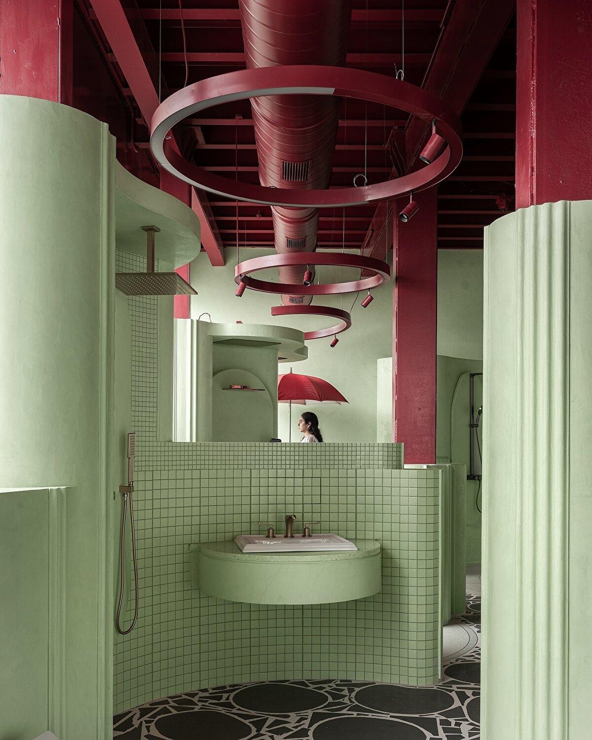 Overlapping circular display units propose a rhythmic circulation, overcoming static exhibition methods. The stone flooring, enriched with different textures, reinforces the horizontal continuity of the space, while the ring-shaped lighting on the ceiling displays the structural elements with a conscious openness. MuseLAB's design approach transforms the showroom into a fiction that encourages spatial exploration rather than a mere display space. @aquant.global