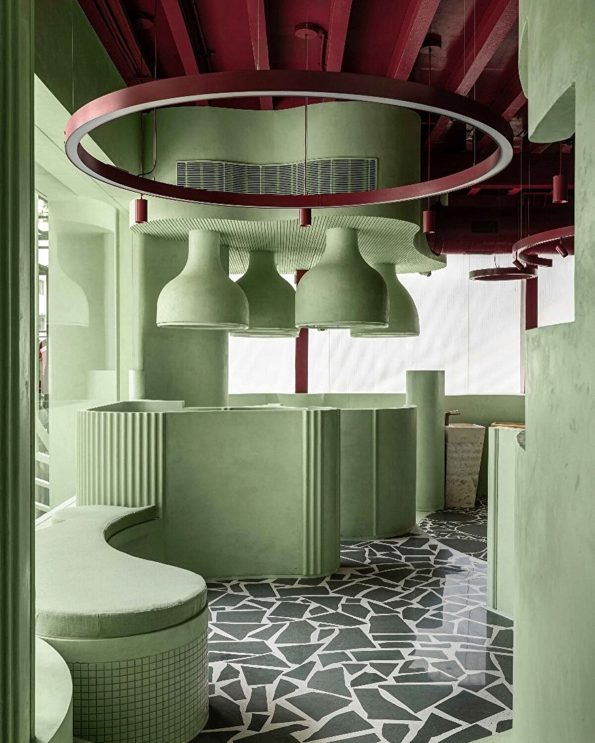 Designed by MuseLAB @muse.lab in Mumbai, the Aquant showroom departs from traditional retail space typologies, offering a spatial experience with geometric compositions and monotone surfaces. The dynamic order of layered volumes creates different perspectives at the intersection of monolithic masses. The translucent and latticed glass facade blurs the boundaries between inside and outside, while the arched entrance emphasises the transition between the masses.