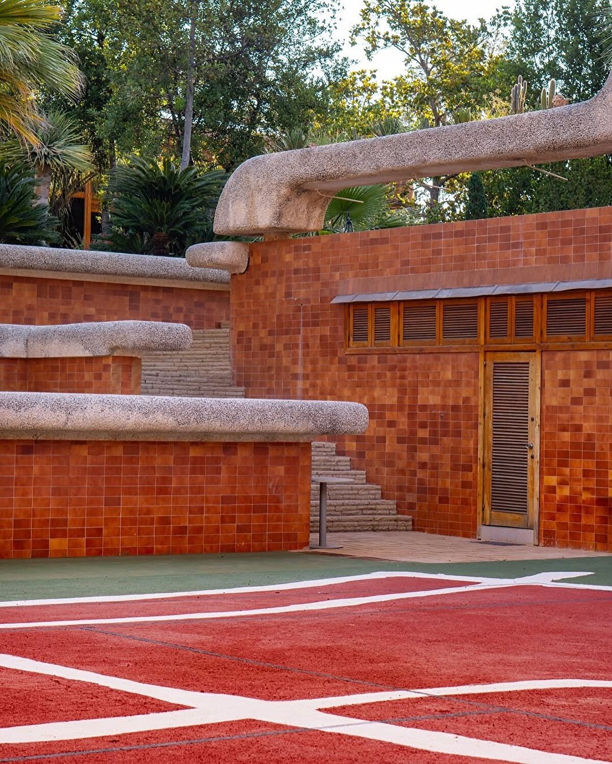 The space is conceived in a way that relates to the surrounding architecture through its use of colour and textural unity. The ceramic cladding on the wall surfaces, together with the textural differences and vegetation, maintain spatial continuity, while the artistic intervention creates an alternative visual narrative on the floor plane.