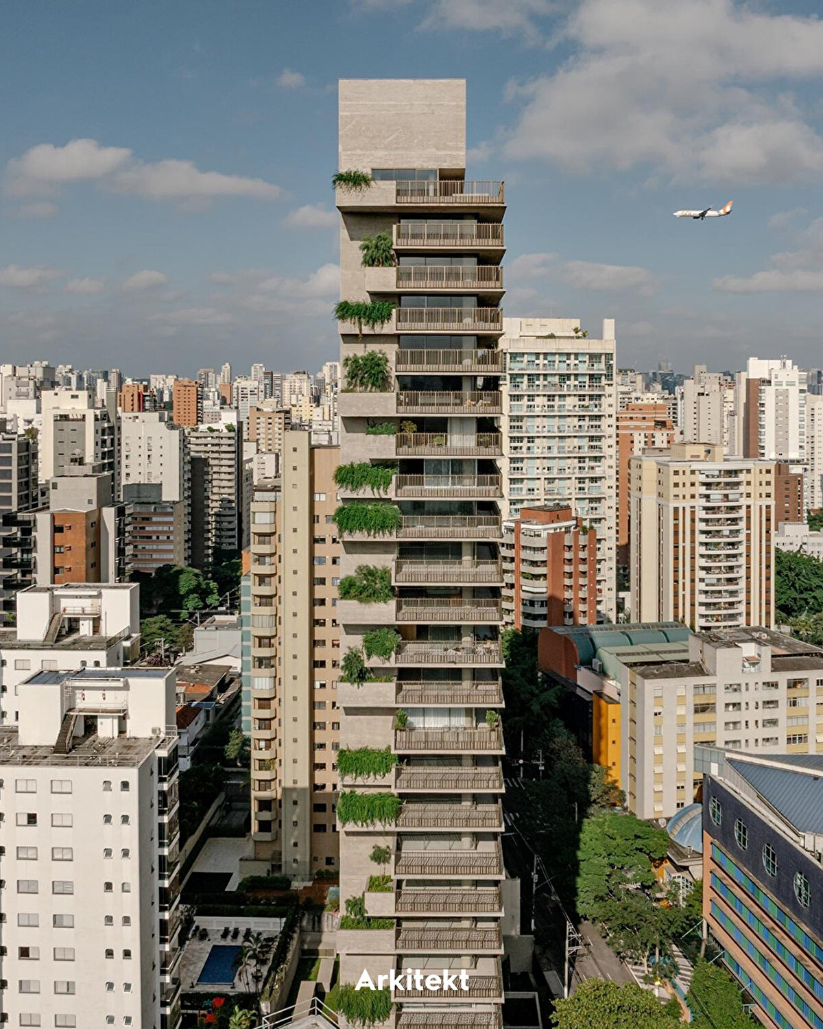 Shaped by single-storey plans of approximately 450 m², the building supports the continuity of open spaces with its large terraces and surrounding walkways. The permeable landscape design at ground level creates a visual and functional transition area between the building and the public space. The Ibaté Building is considered a contemporary example of a vertical garden integrated with the architectural façade within Brazil's 2025 housing production.