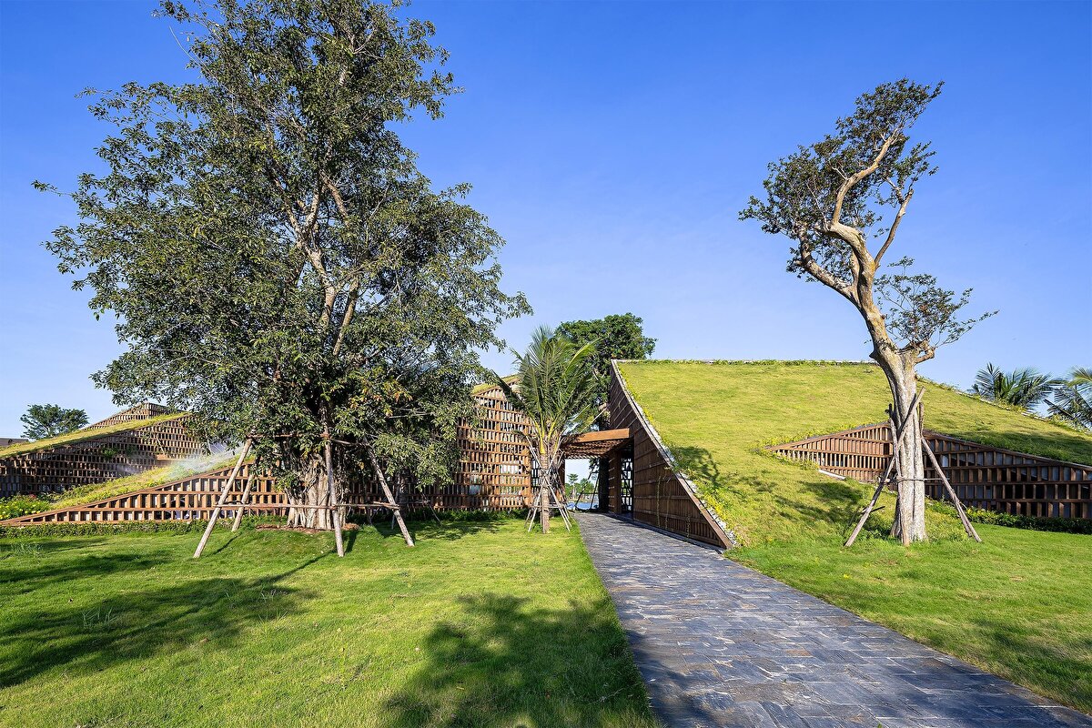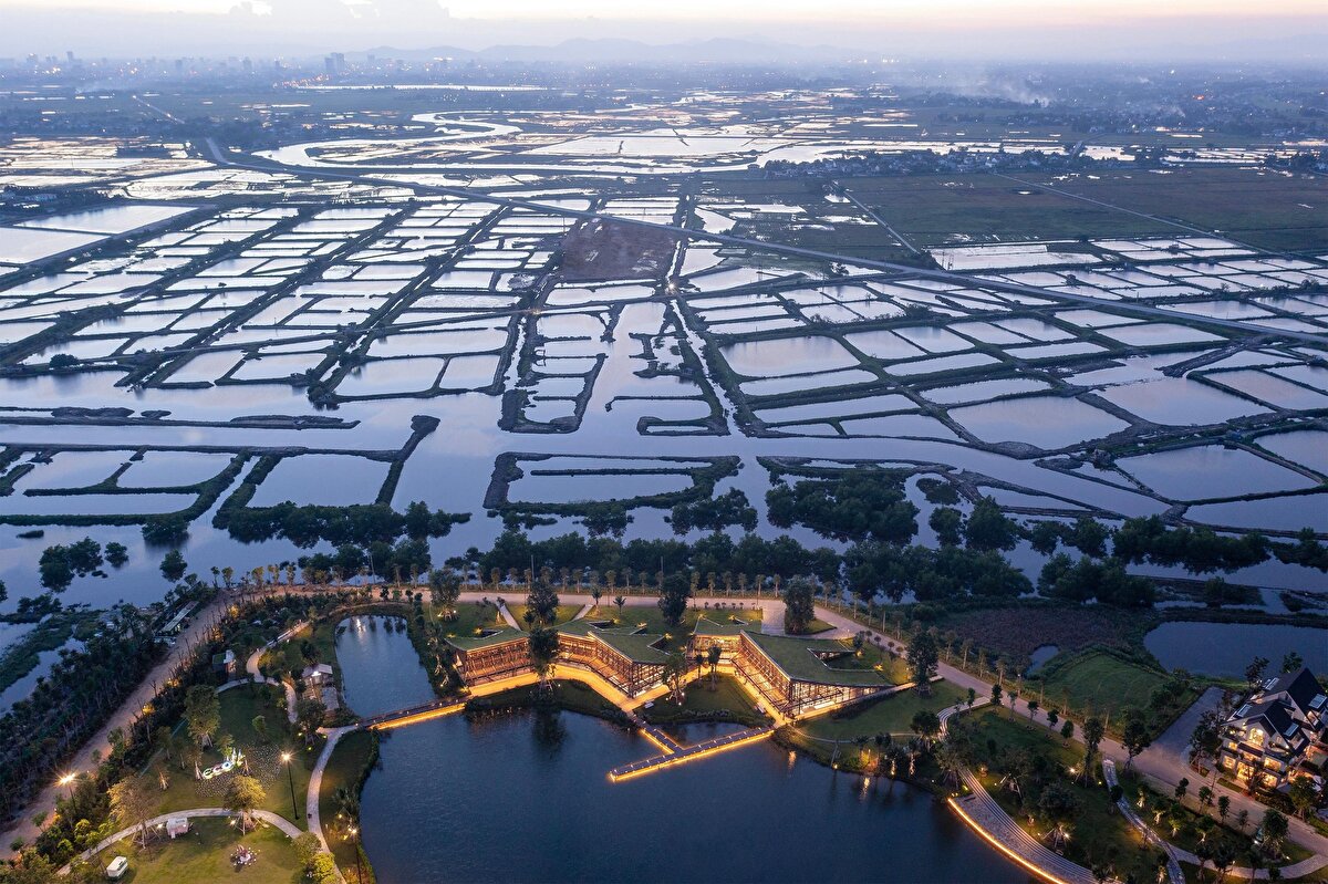 Designed by MIA Design Studio in Vinh and completed in 2023, The Park serves as a public facility integrated with the landscape within the urban environment. The project connects extensive green spaces with the building mass through its placement aligned with the main traffic axis. Functional areas, taking cues from the existing topography, open up towards the lake view, with continuity provided by the hillside gardens.