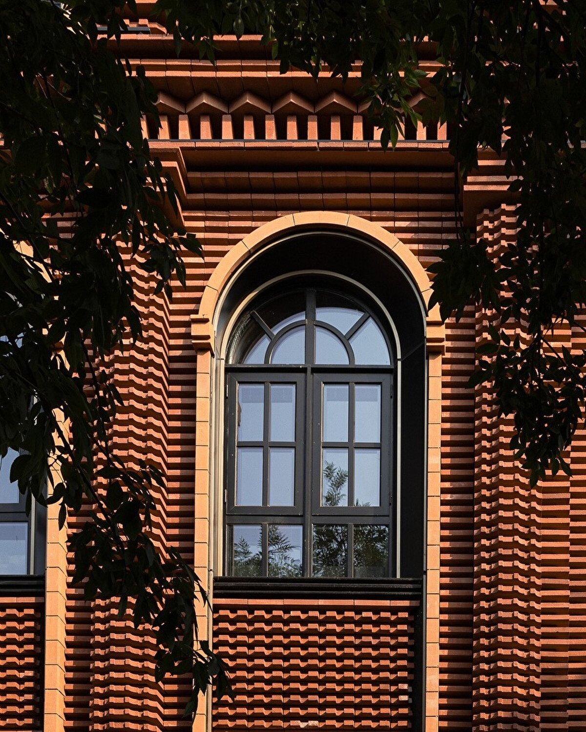 Pencere gölgeliklerinin formundan esinlenen tasarım, inşaat sürecinde yenilikçi bir kesme tekniği kullanarak başlangıçta yoğun olan tuğla yüzeylere boşluklar ekliyor. Böylece katı ve boşluk arasında dinamik bir görsel efekt elde edilerek sınırlar belirsizleştiriliyor. Binanın merkezindeki katmanlı çelik plakalar, dalgalanan su yüzeylerini yansıtan ince bir kesim formuna sahip ve bu, Tianjin'in liman kenti kimliğine bir gönderme yapıyor.