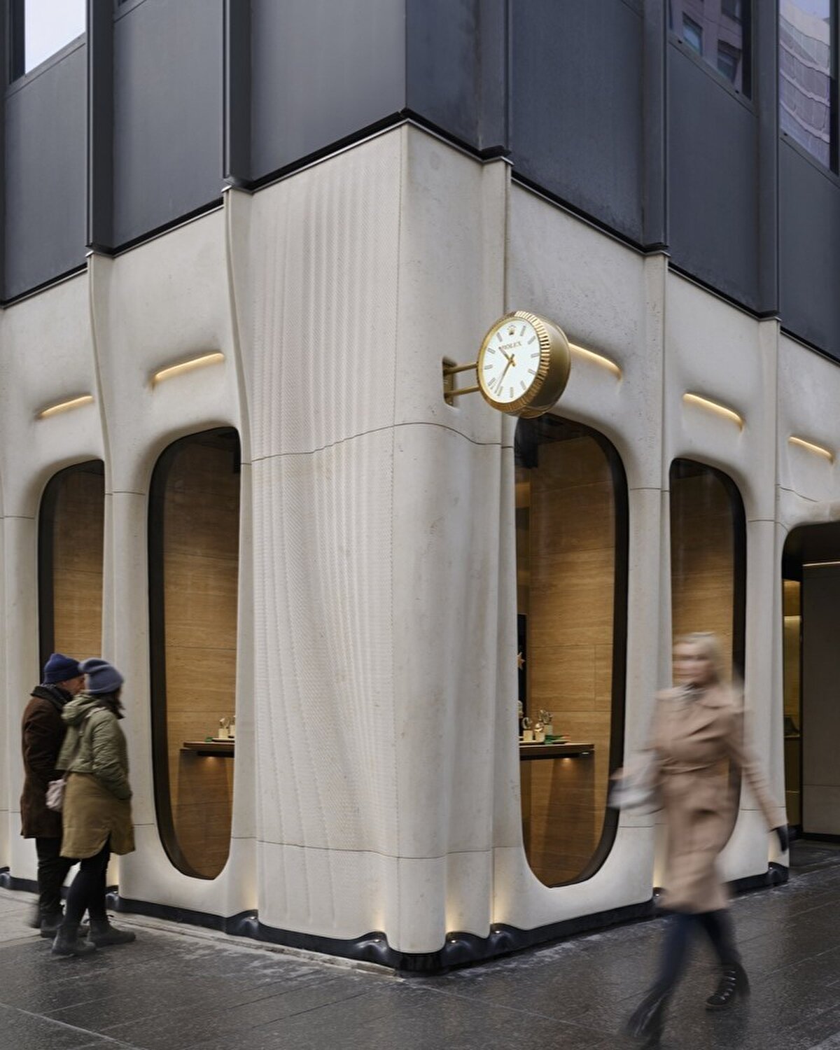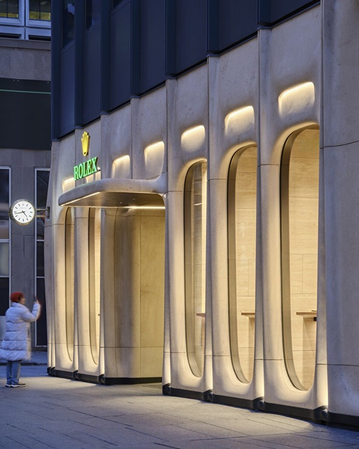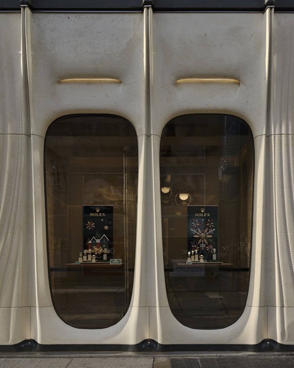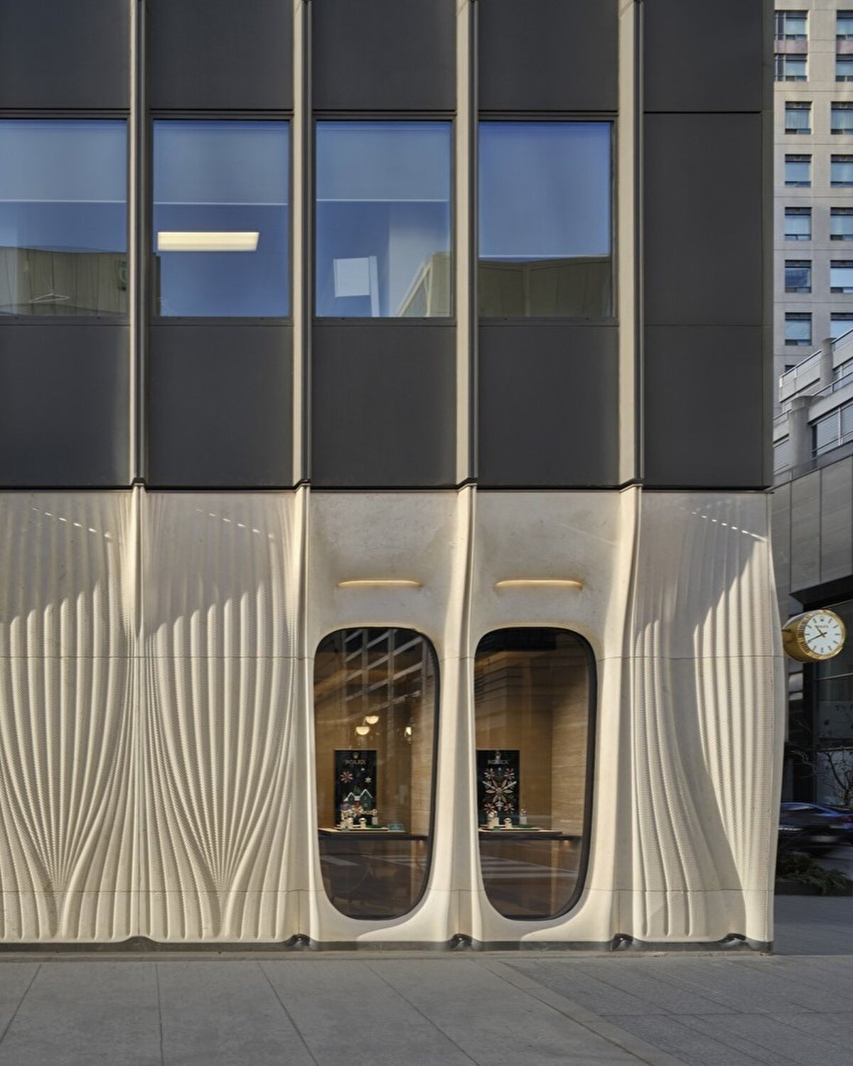 The design translates the geometries of the watches into architecture, offering graceful curves and subtle contours that contrast with the steel of the modernist skyscraper. The uprights become thin arches with a rhythm reminiscent of watch strap connections. On the east façade, Arturo Tedeschi's algorithmic design is carved in stone, referencing the watch's engraved geometries. Produced with CNC technology, this facade provides a layered and elegant texture to the stone panels, reflecting light with subtle vibrations.