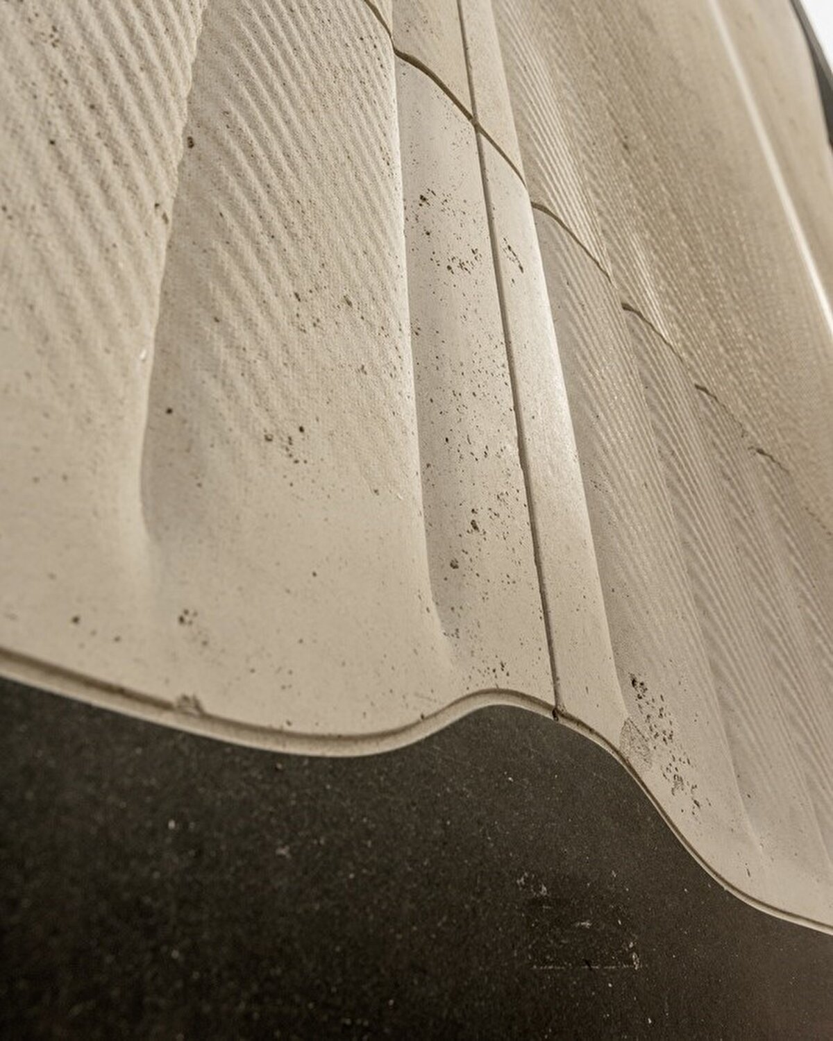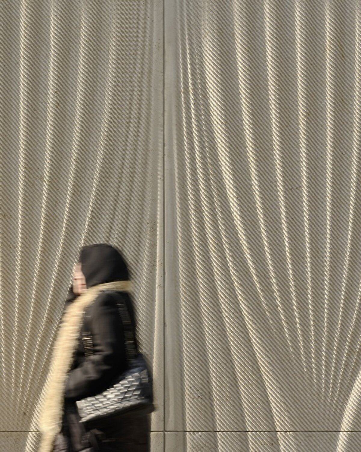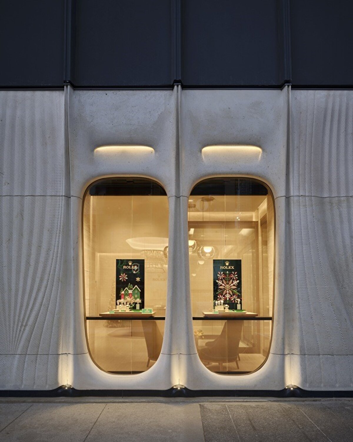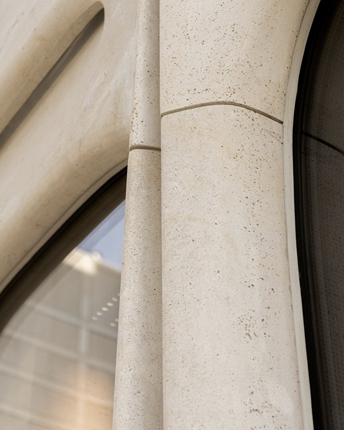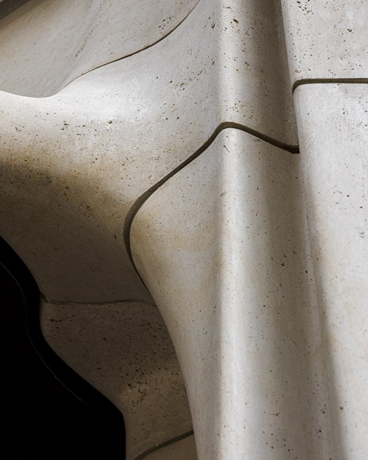 The design translates the geometries of the watches into architecture, offering graceful curves and subtle contours that contrast with the steel of the modernist skyscraper. The uprights become thin arches with a rhythm reminiscent of watch strap connections. On the east façade, Arturo Tedeschi's algorithmic design is carved in stone, referencing the watch's engraved geometries. Produced with CNC technology, this facade provides a layered and elegant texture to the stone panels, reflecting light with subtle vibrations.