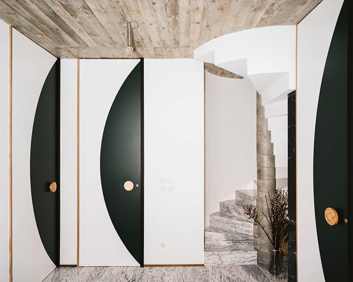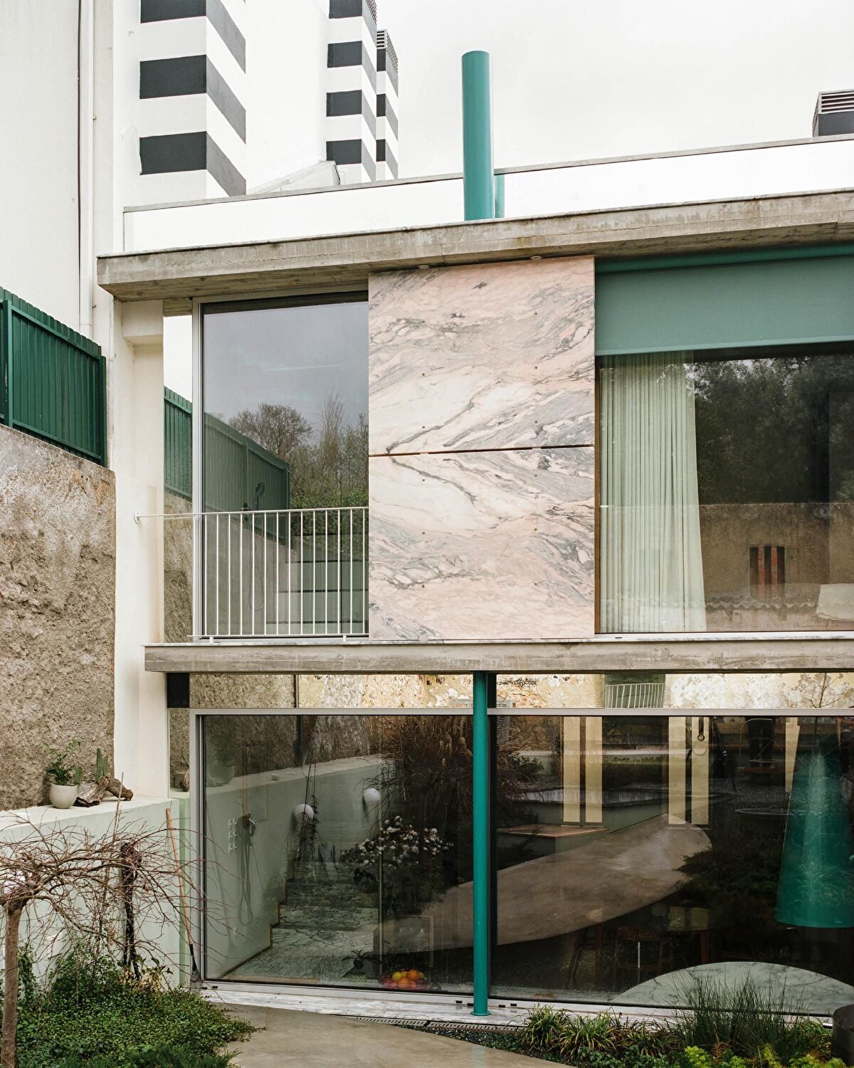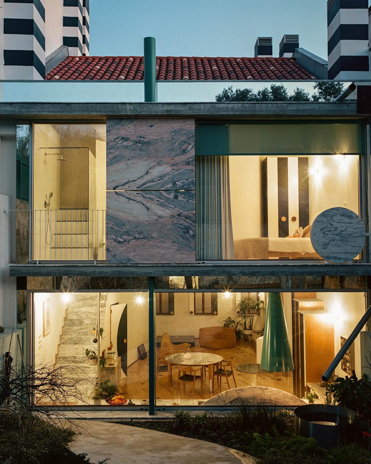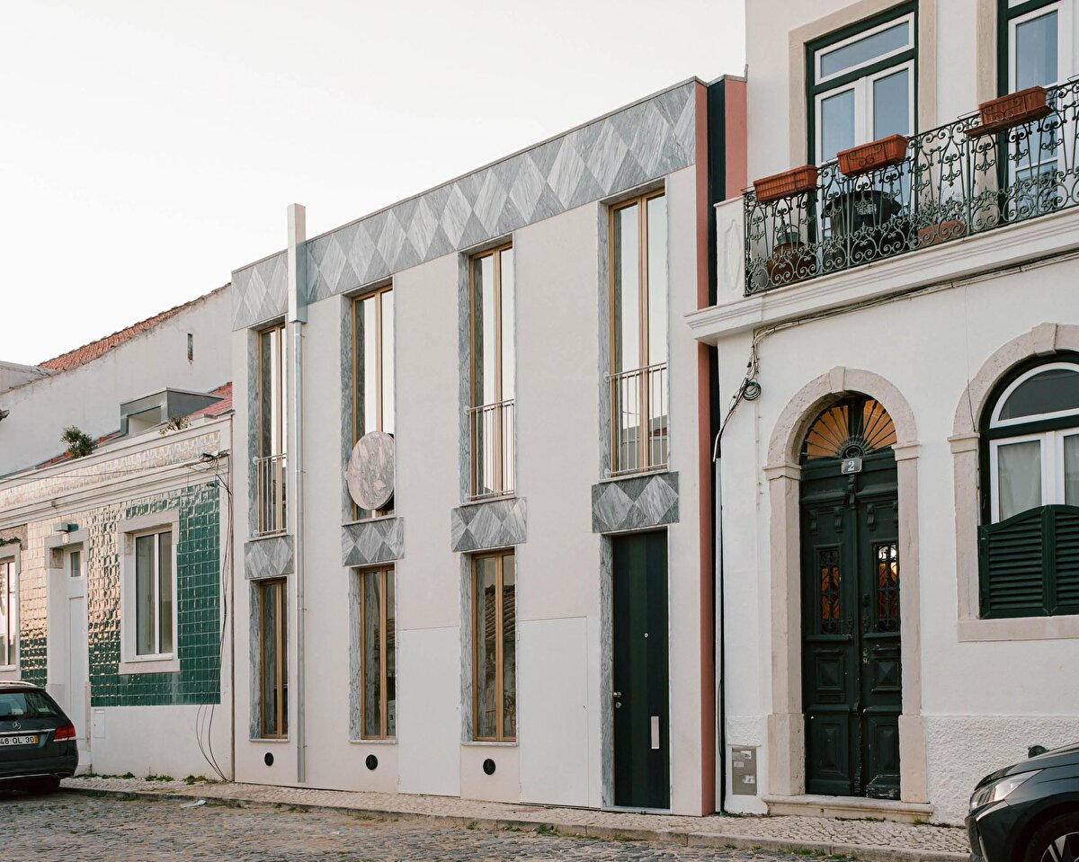 Portekiz'in Lizbon kentinde FALA Atelier tarafından 2022'de tamamlanan konut, üç katlı kütlesiyle farklı geometrik düzenlemeleri bir araya getiriyor. Zemin katta bahçeye açılan ana yaşam alanı yer alırken, orta kat merkezi bir koridor ve spiral merdiven etrafında kurgulanıyor. Mekanlarda eğimli tavanlar, kavisli ve kademeli duvarlar ile epizodik çift yükseklikler öne çıkıyor.