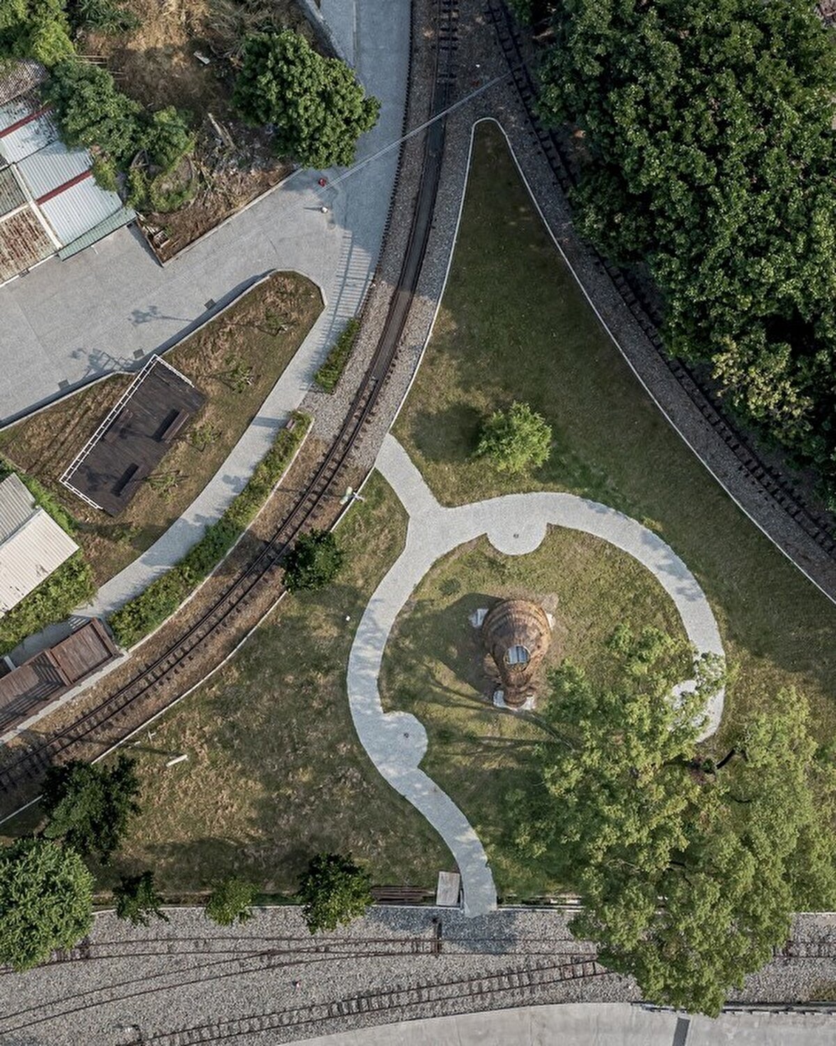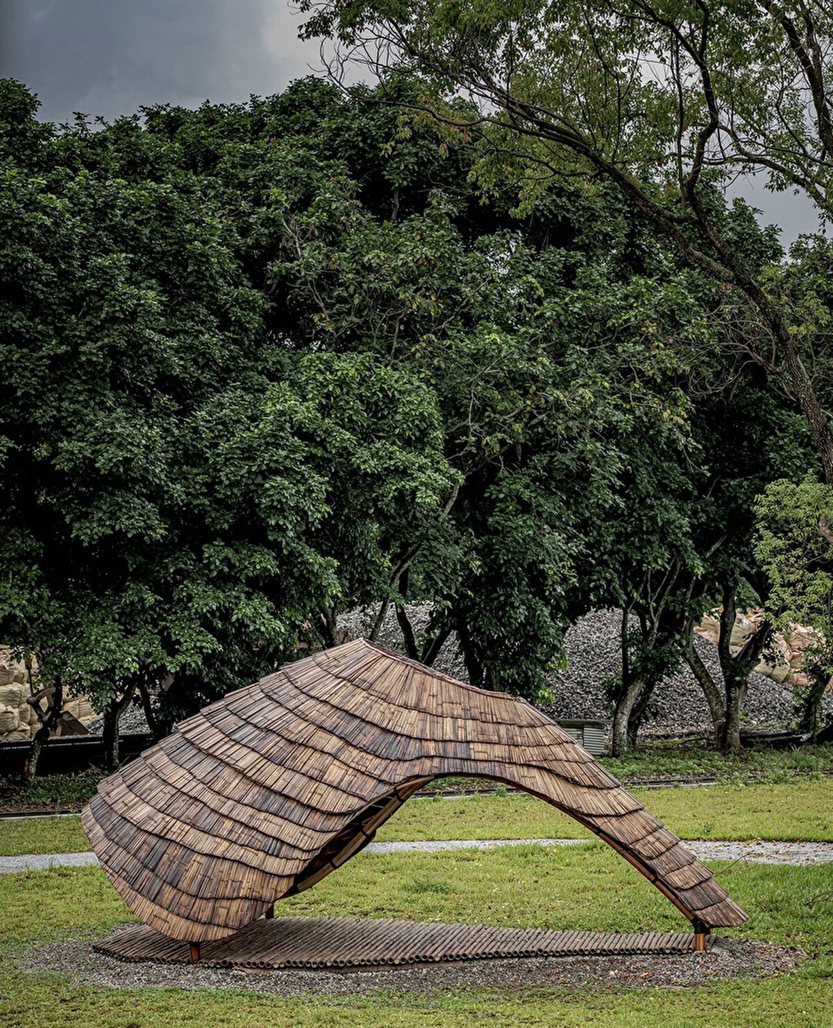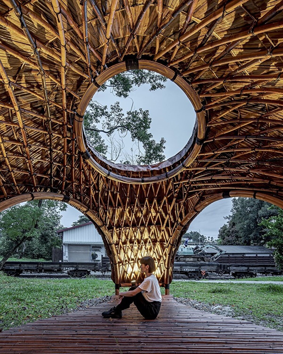 Geleneksel bambu malzemelerini kullanarak dijital geometrik şekiller oluşturan bu tasarım, doğal hatlarıyla bambu ormanlarını, aynı zamanda endüstriyel demir yollarının rasyonel yörüngesini vurguluyor. Bu unsurların birleşimi, yerel kültürle uyumlu, ritmik ve esnek bir mekansal yapı ortaya koyuyor.
