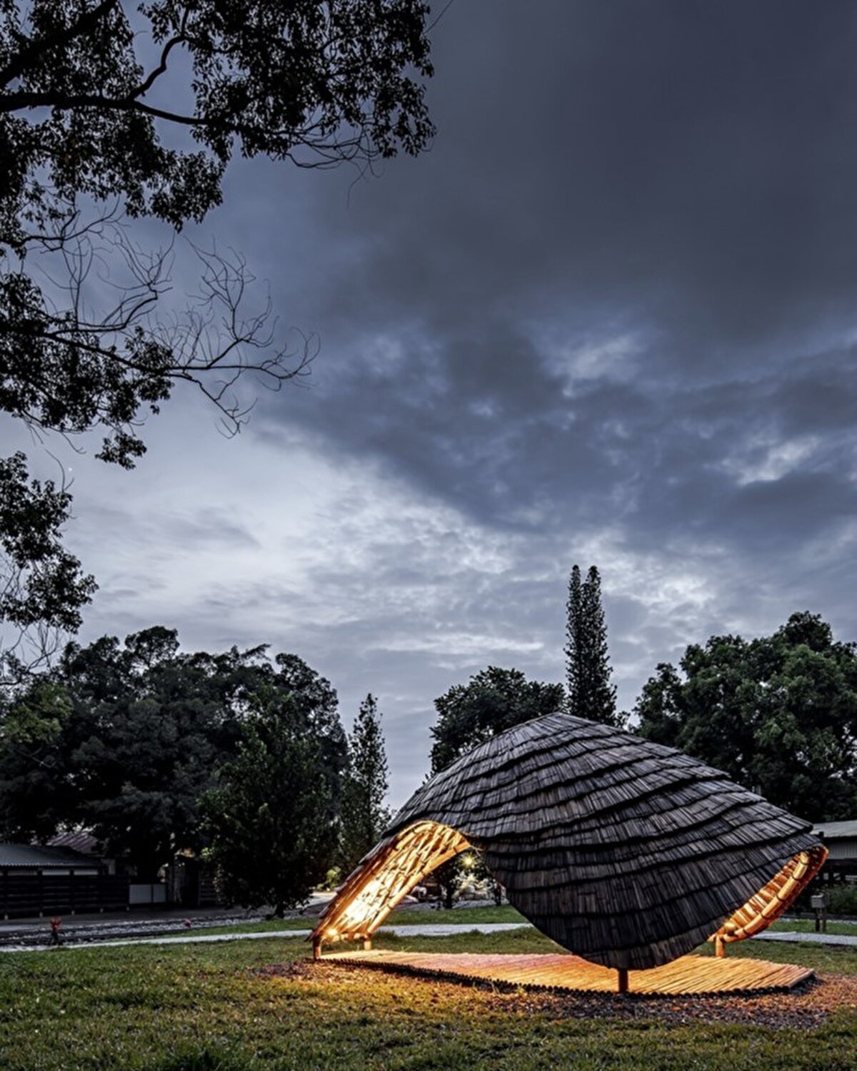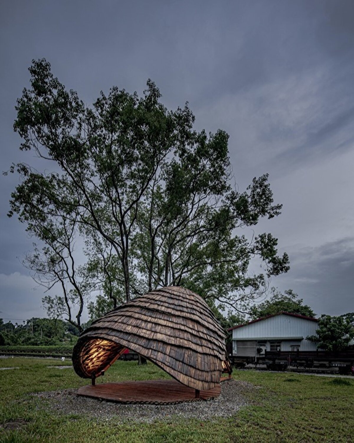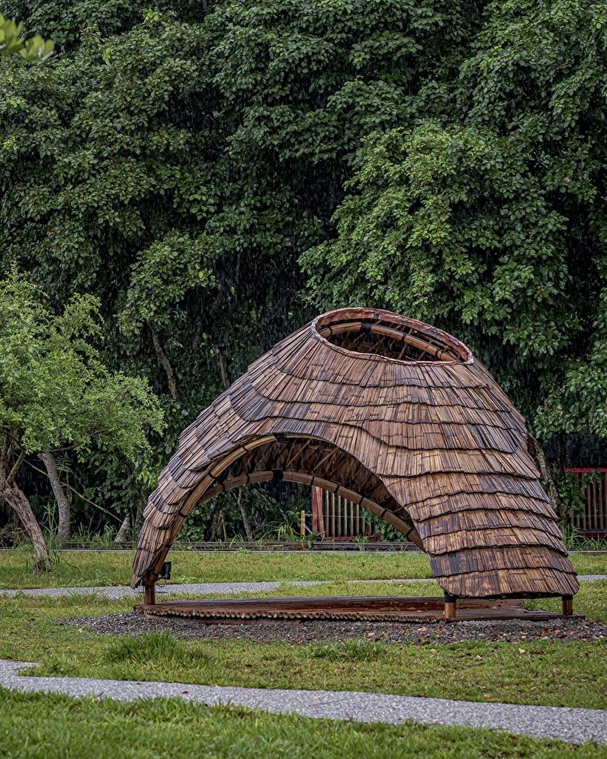 Geleneksel bambu malzemelerini kullanarak dijital geometrik şekiller oluşturan bu tasarım, doğal hatlarıyla bambu ormanlarını, aynı zamanda endüstriyel demir yollarının rasyonel yörüngesini vurguluyor. Bu unsurların birleşimi, yerel kültürle uyumlu, ritmik ve esnek bir mekansal yapı ortaya koyuyor.